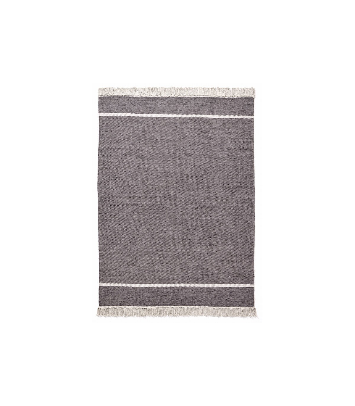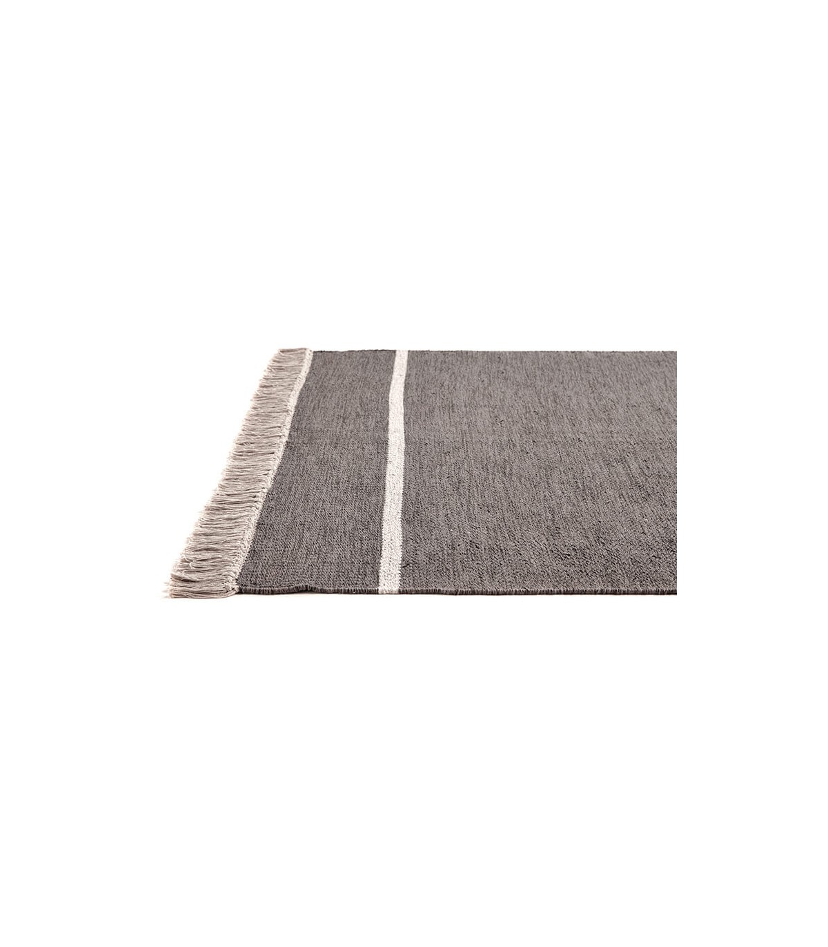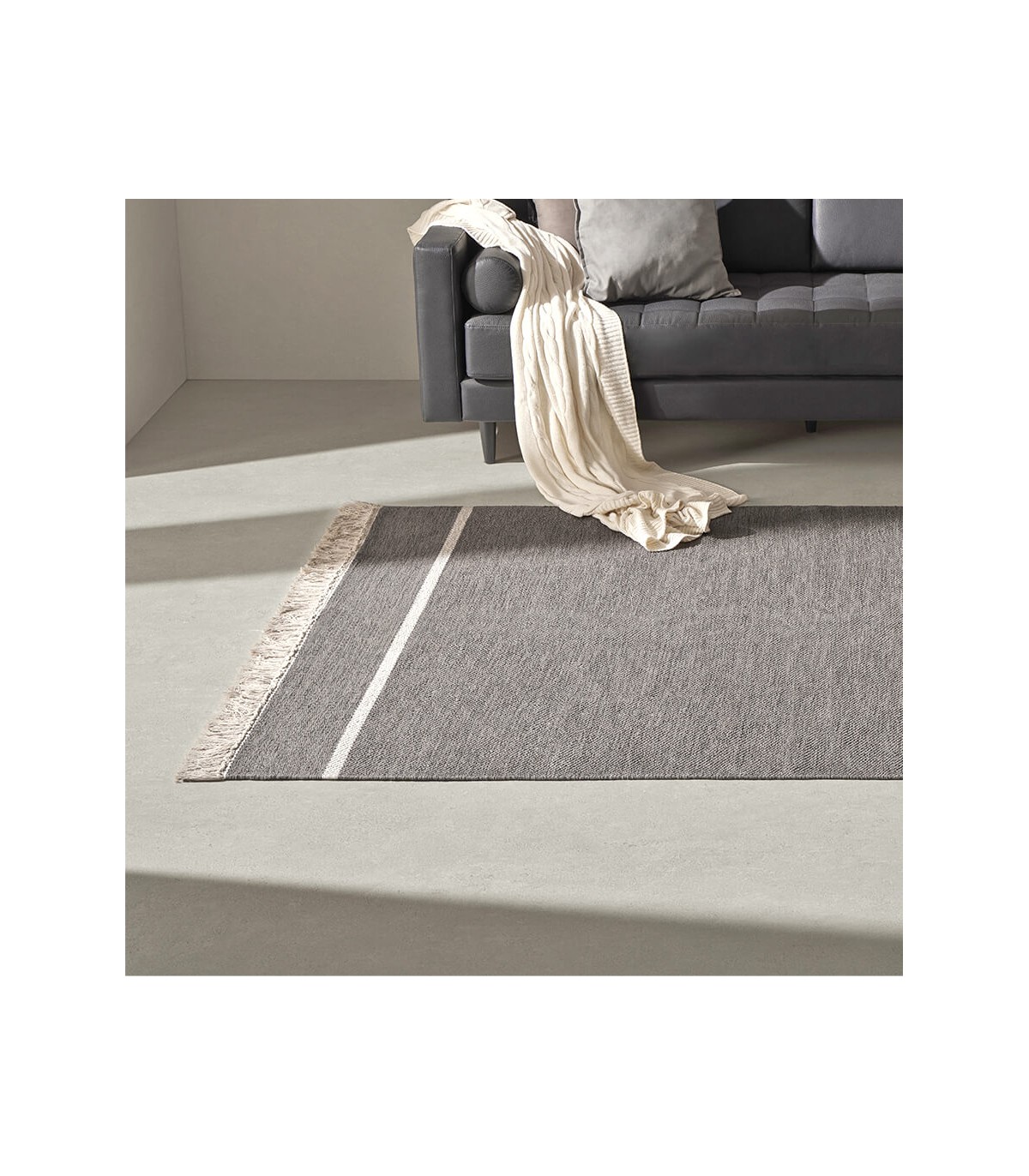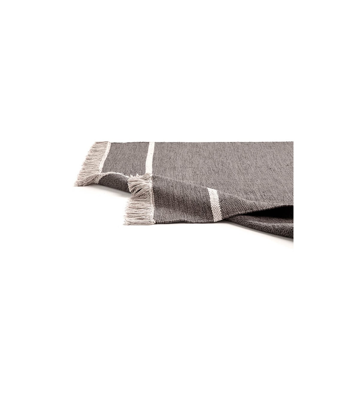 Transforma tus espacios con esta elegante alfombra de estilo contemporáneo, tejida a mano en algodón 100%. Su diseño sobrio en tonos grises con finas líneas blancas y flecos en los extremos aporta textura, calidez y armonía visual a cualquier ambiente.