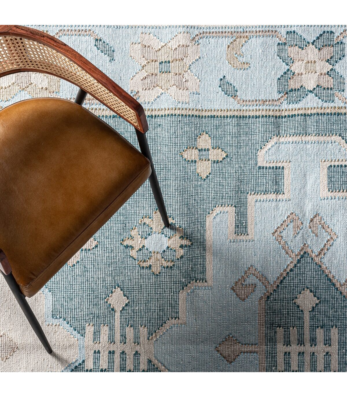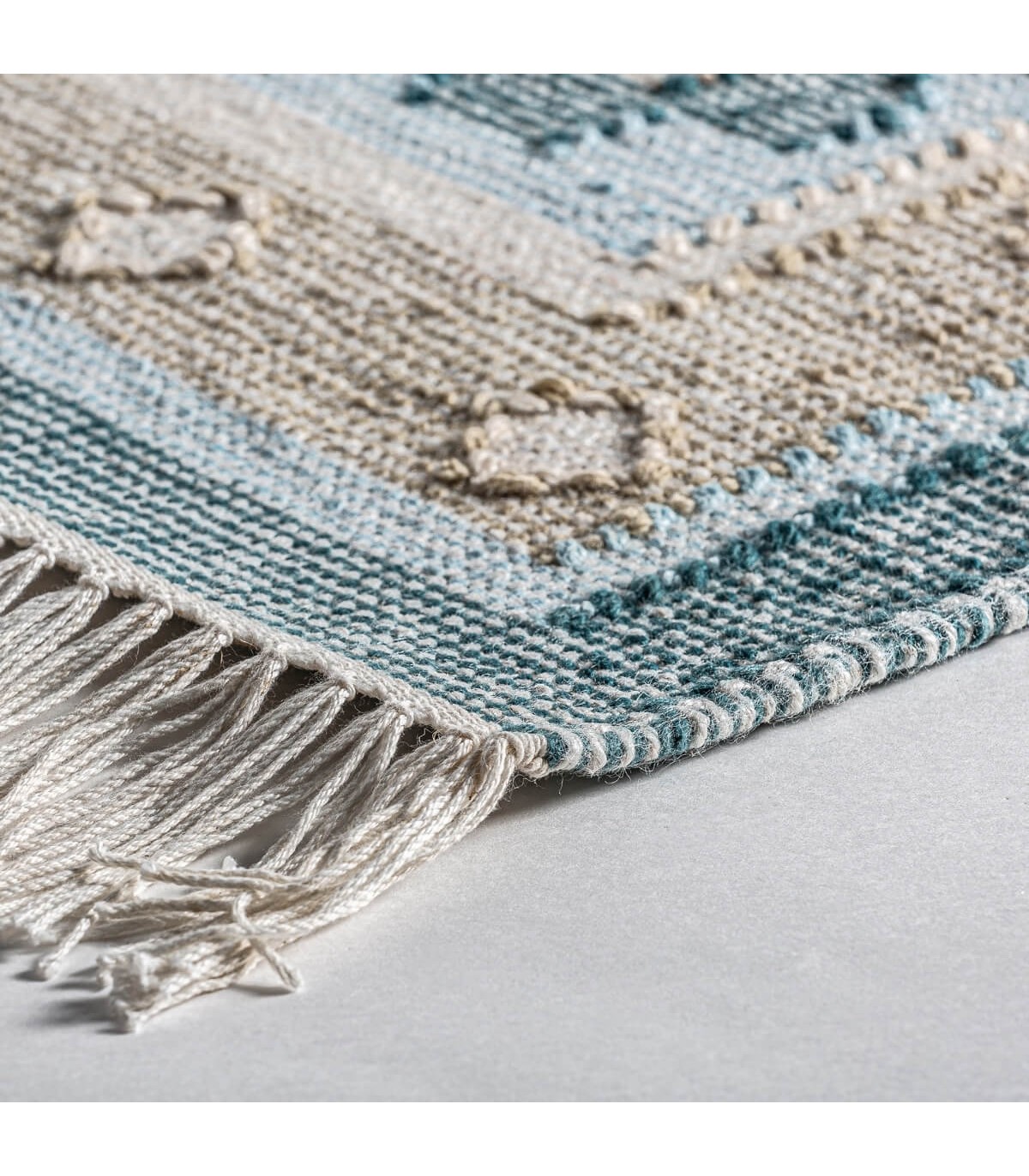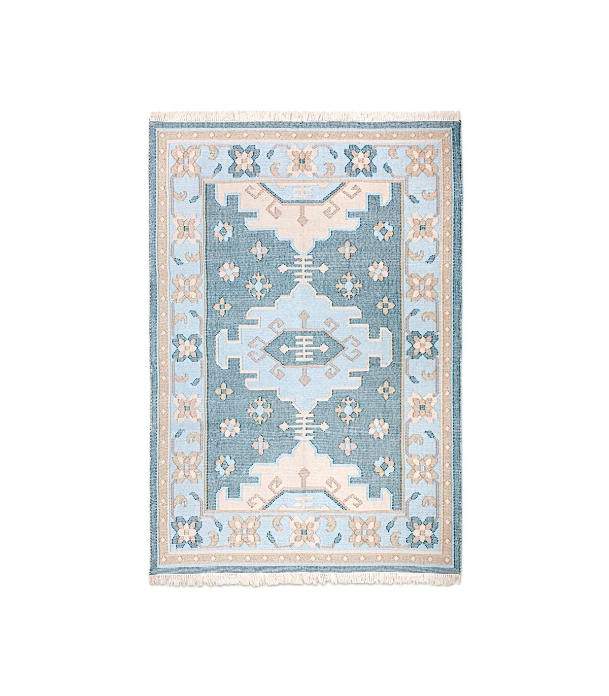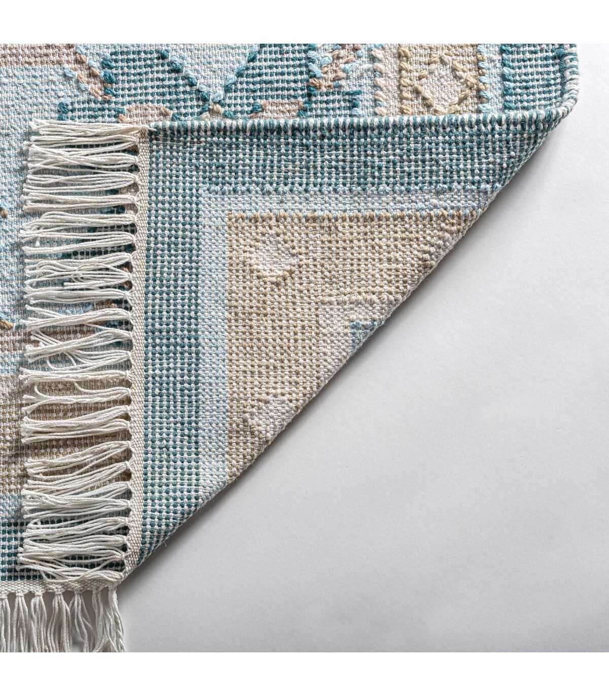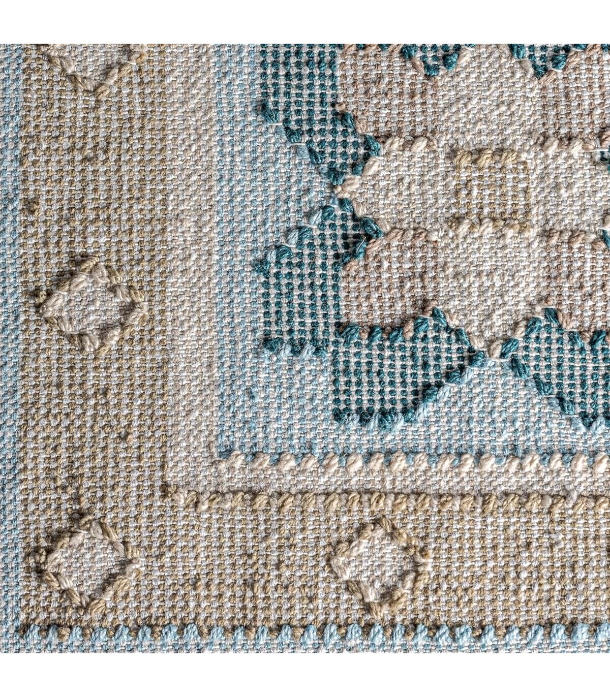 Alfombra rectangular muy grande, en tonos azules y cremas, fabricada con plástico reciclado (PET). Se puede limpiar facilmente. Se puede mojar y por ello es un producto válido tanto para interior como para exterior.