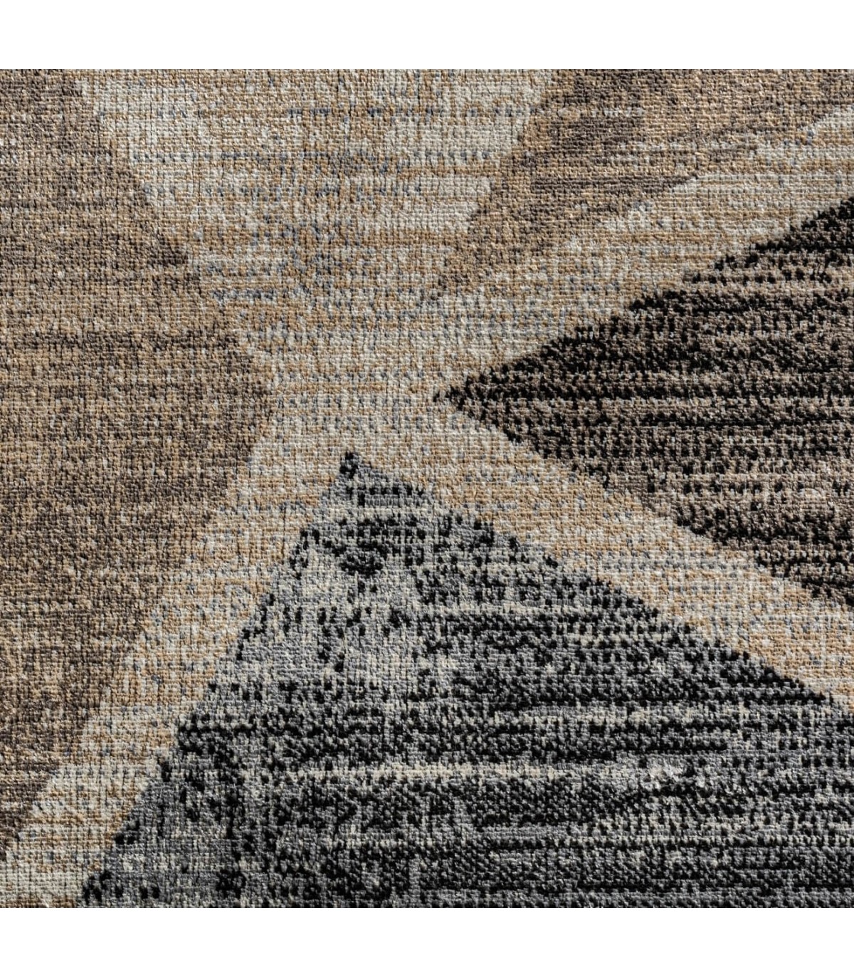 Una alfombra grande que suma calidez y diseño actual a cualquier estancia. Tejida en viscosa de alta calidad, destaca por su suave textura y un patrón geométrico en tonos beige y gris que encaja con ambientes modernos y luminosos.