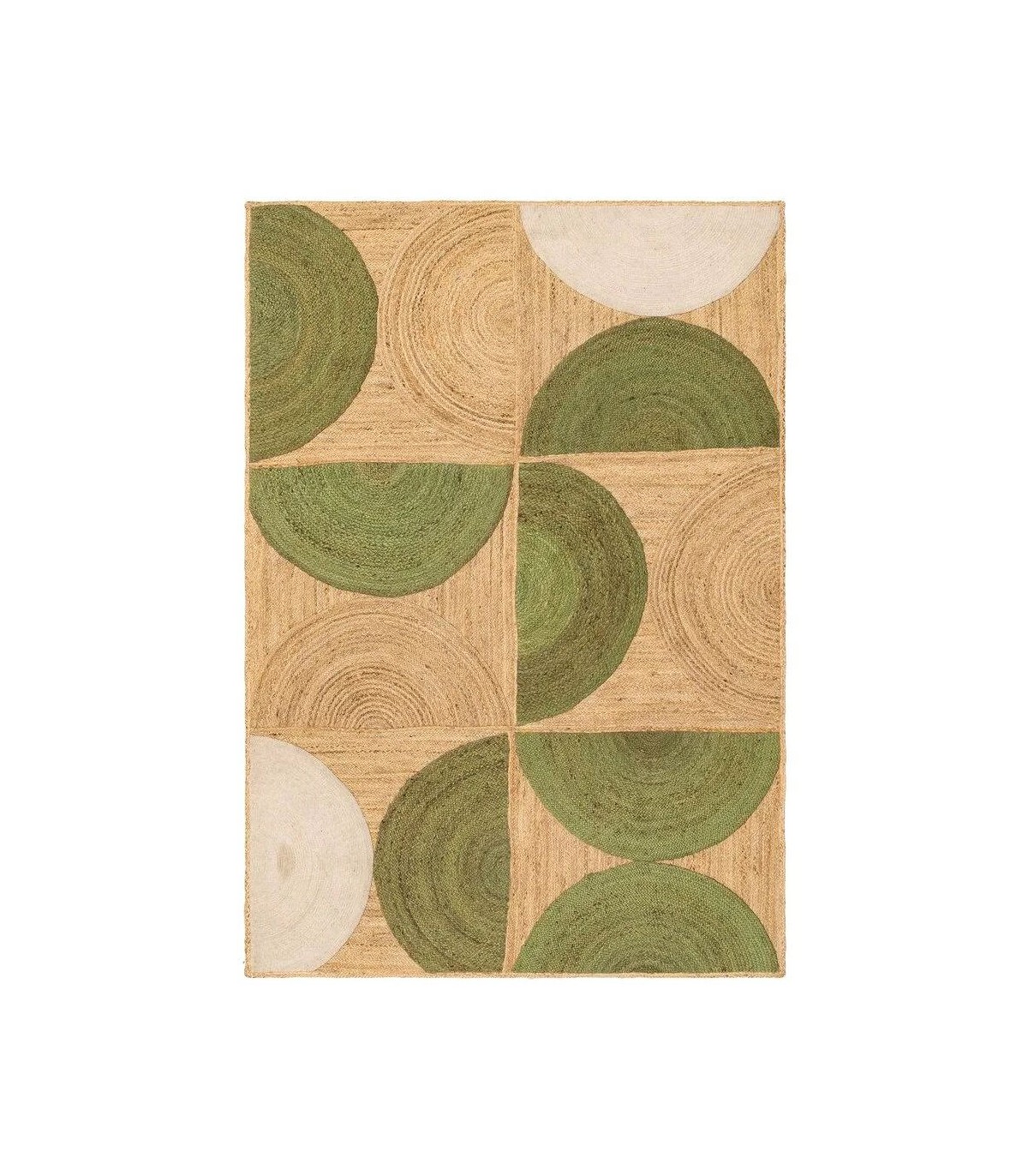La alfombra de yute en tonos naturales transmite frescura y autenticidad gracias a su trenzado artesanal, lleno de textura y encanto visual. Los detalles en verde se combinan con el blanco roto en un diseño geométrico que aporta dinamismo sin perder serenidad.