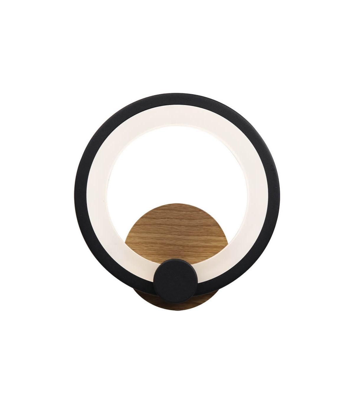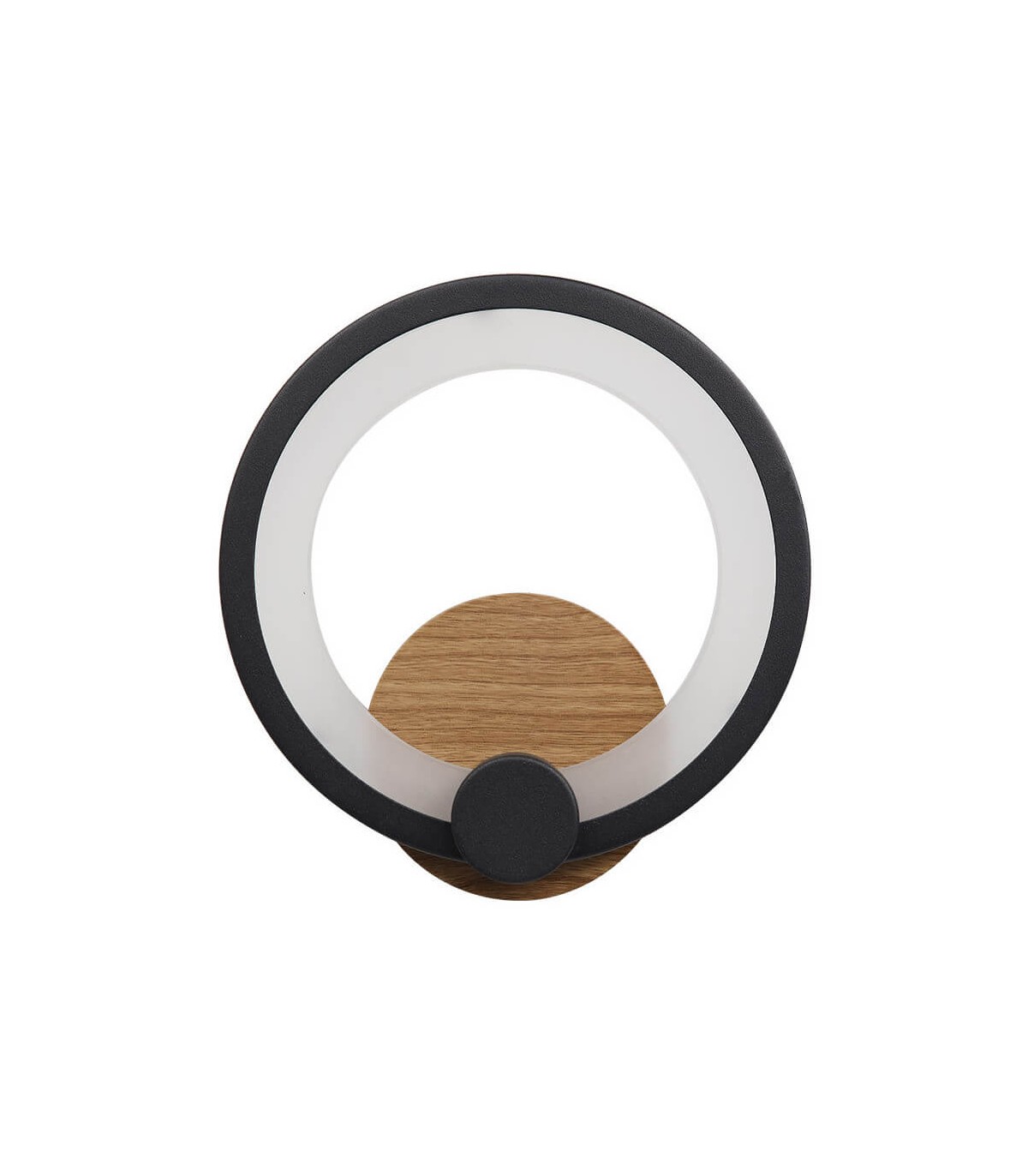 Aplique de pared que se compone de 1 círculo en color negro e imitación madera, resultando una muy moderna composición.