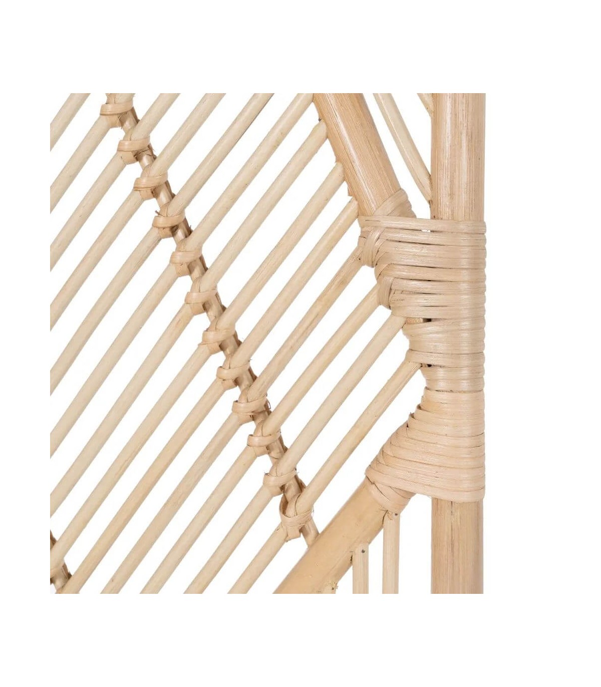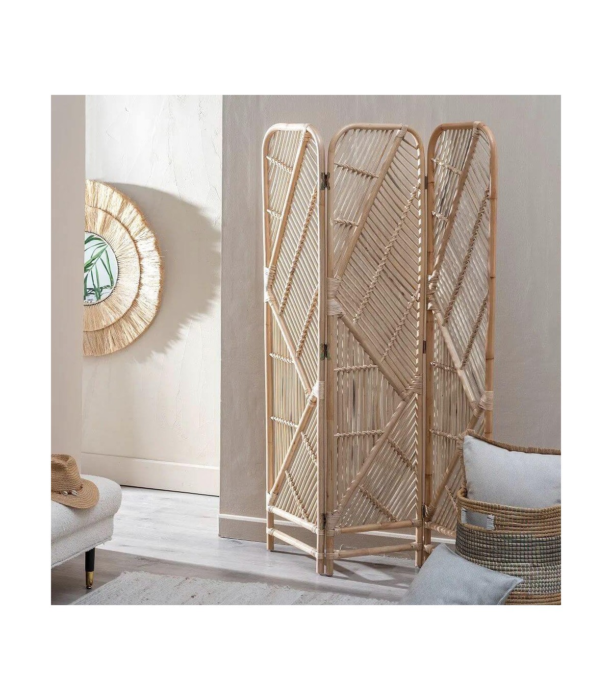 Este biombo de tres hojas fabricado en bambú natural y ratán trenzado a mano aporta textura y carácter sin recargar el ambiente. Su estructura liviana y plegable permite separar espacios con elegancia, conservando la sensación de amplitud.