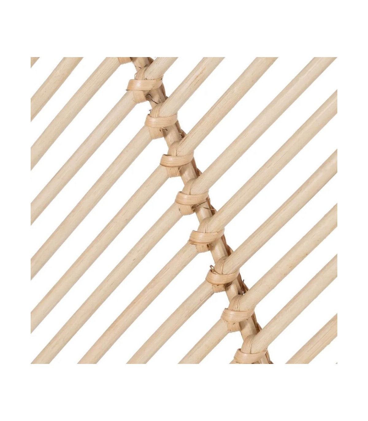 El entramado en zigzag añade dinamismo visual y un aire artesanal muy decorativo. Perfecto para rincones boho, dormitorios relajados o salones que buscan un detalle natural con personalidad. Una pieza funcional que también destaca como elemento estético con esencia tropical y calmada.