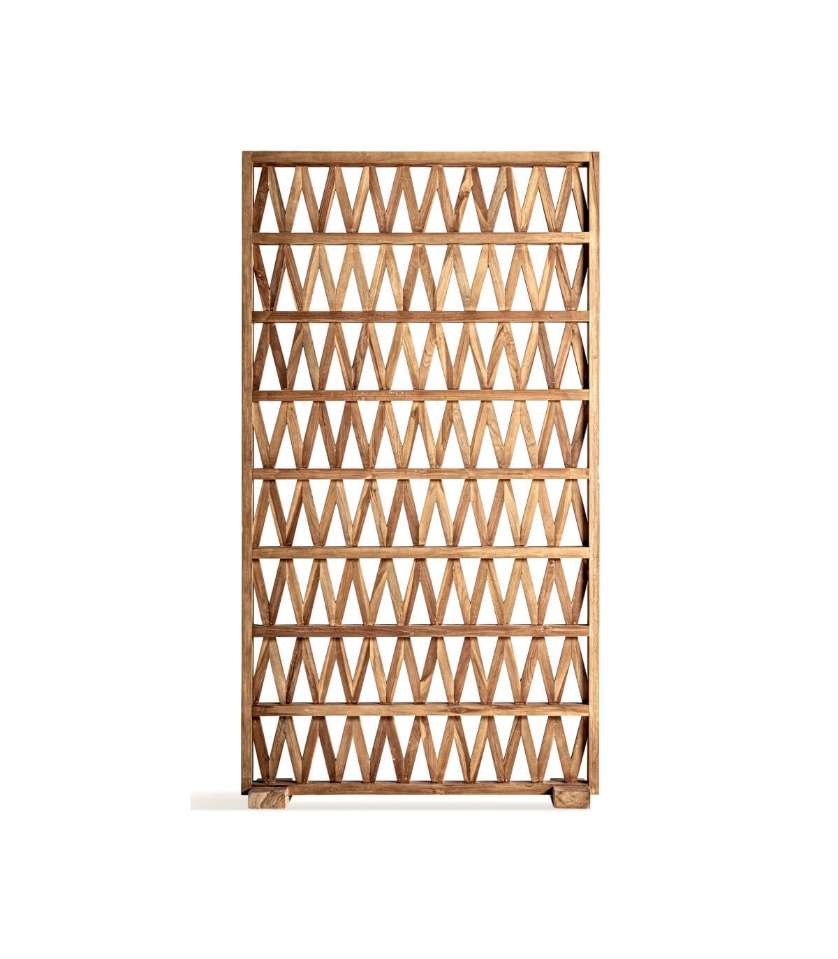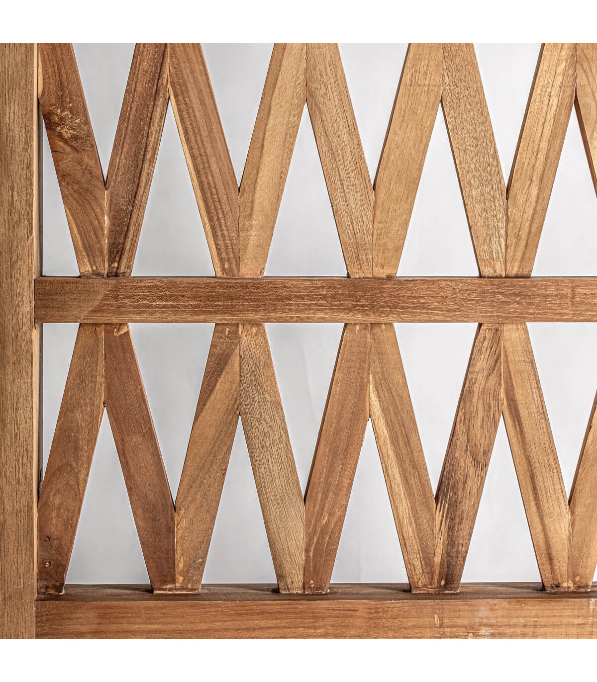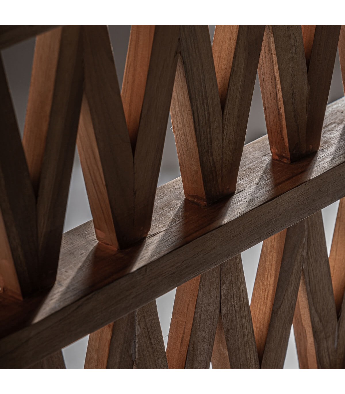 Define ambientes con personalidad gracias a este biombo artesanal de inspiración colonial. Su estructura en madera de teca maciza presenta un original diseño geométrico que deja pasar la luz, permitiendo separar espacios sin recargarlos visualmente. Perfecto como separador decorativo en salones, dormitorios o zonas de trabajo, aportando un aire cálido y sofisticado.