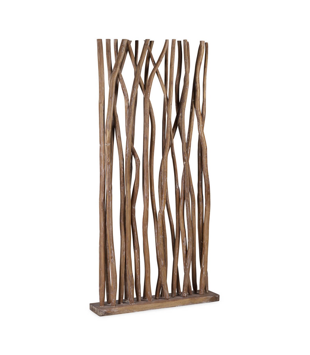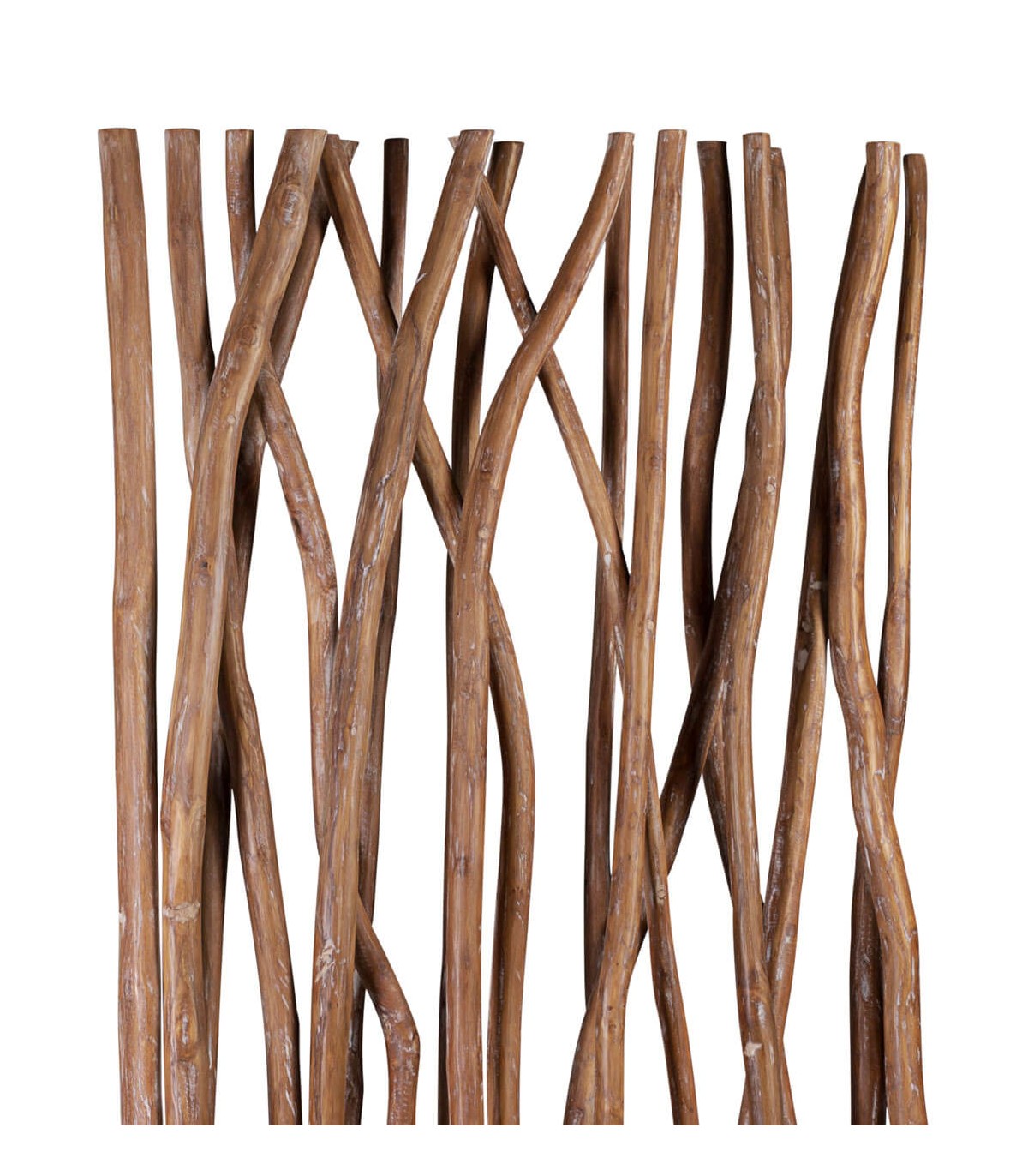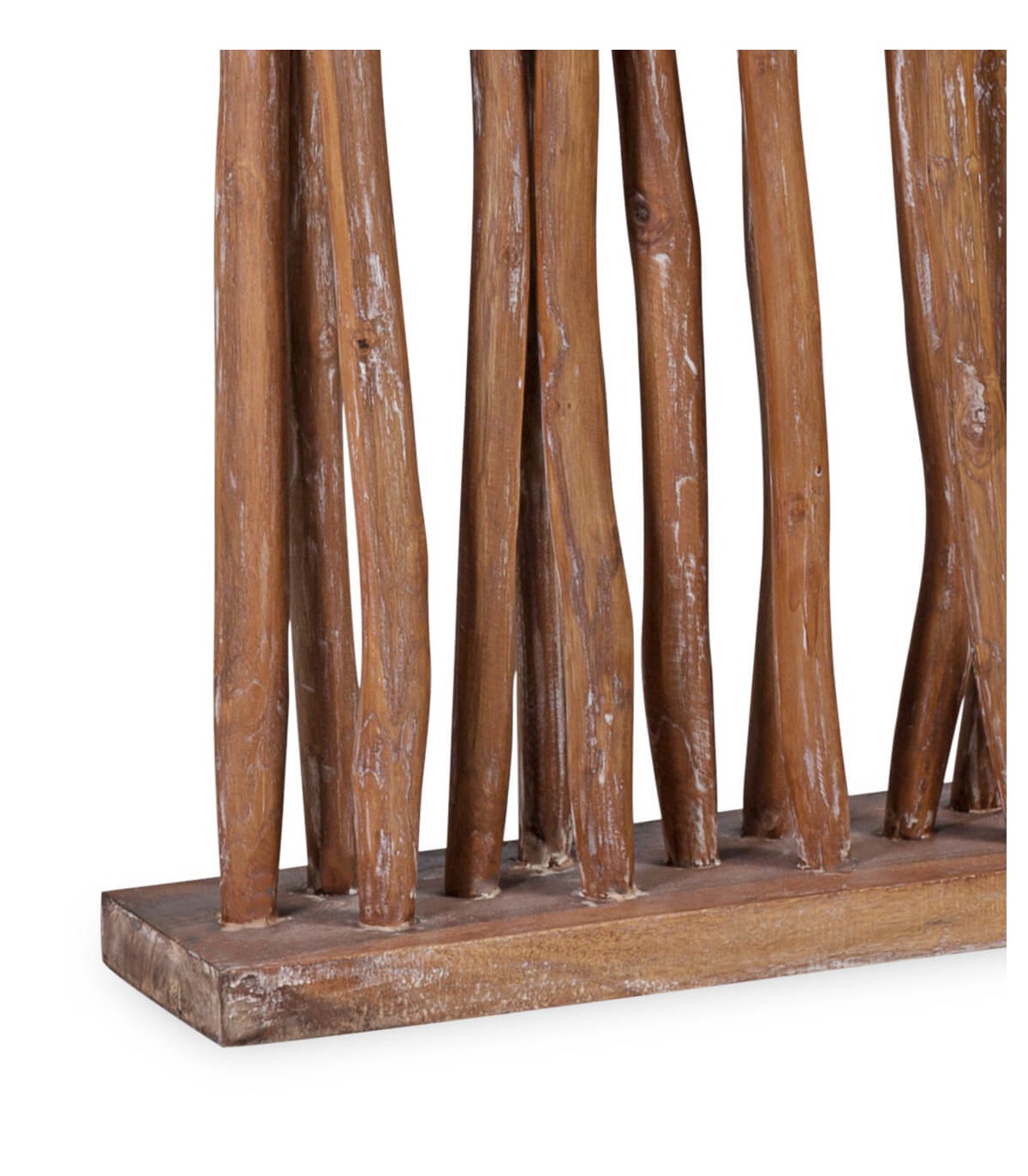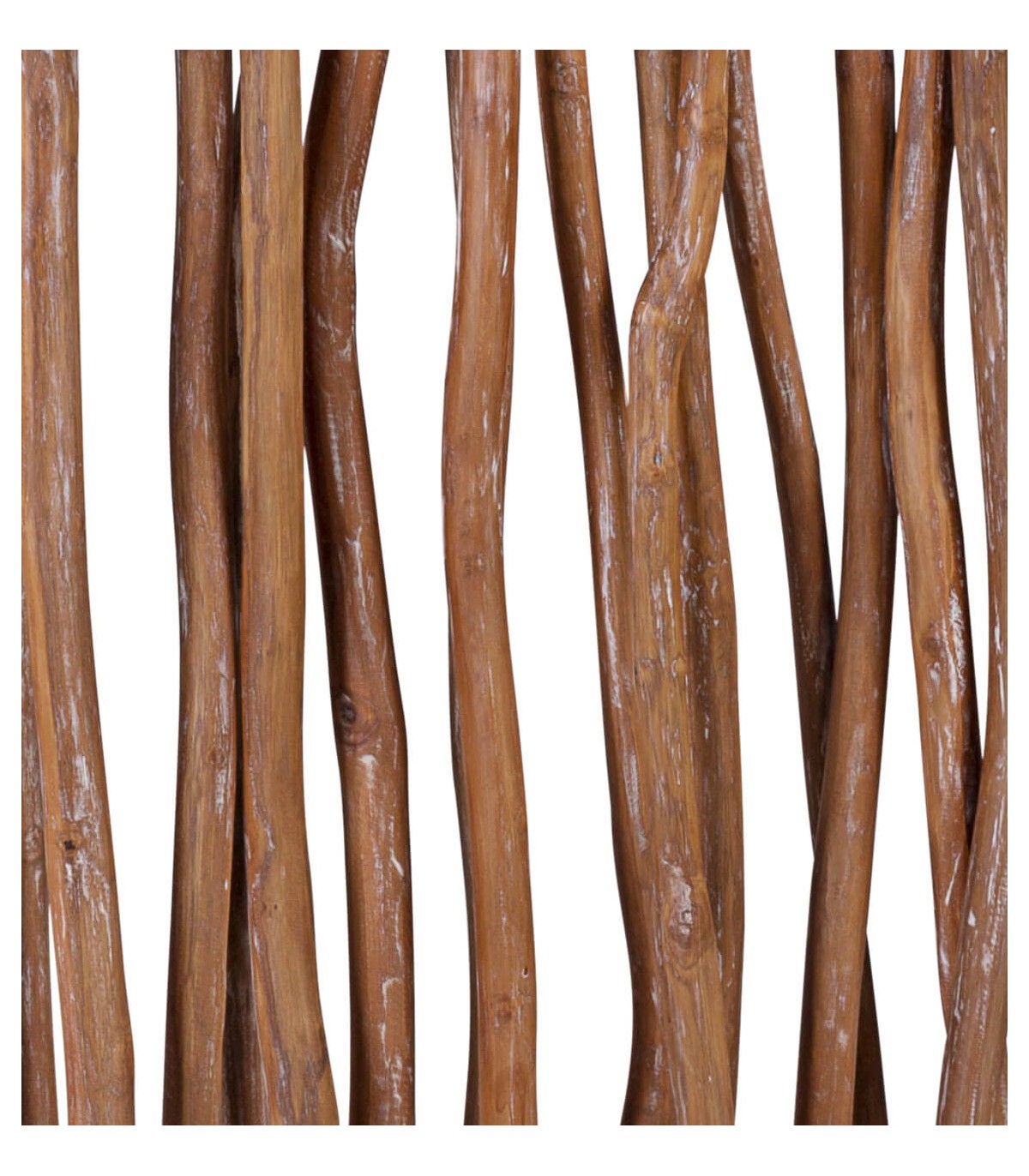 Este original parabán está elaborado en madera maciza de teca con ramas dispuestas verticalmente, creando una estética escultórica y natural. Cada pieza presenta vetas e irregularidades únicas, resaltadas con un acabado en tono nogal y una delicada pátina blanca.