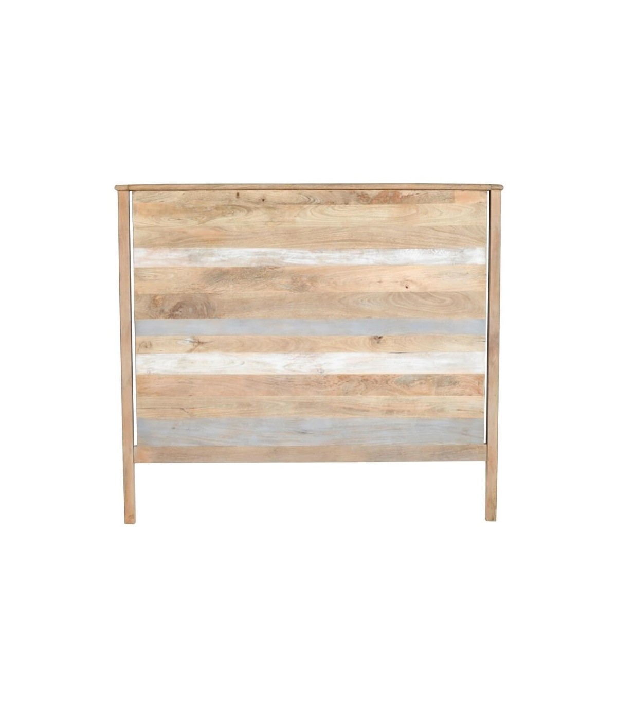 Cabecero muy grande para cama grande y de gran altura, realizado de manera artesanal, madera natural de mango con detalles en blanco y gris lavado., tiene mesitas de noche y cómoda del mismo modelo.