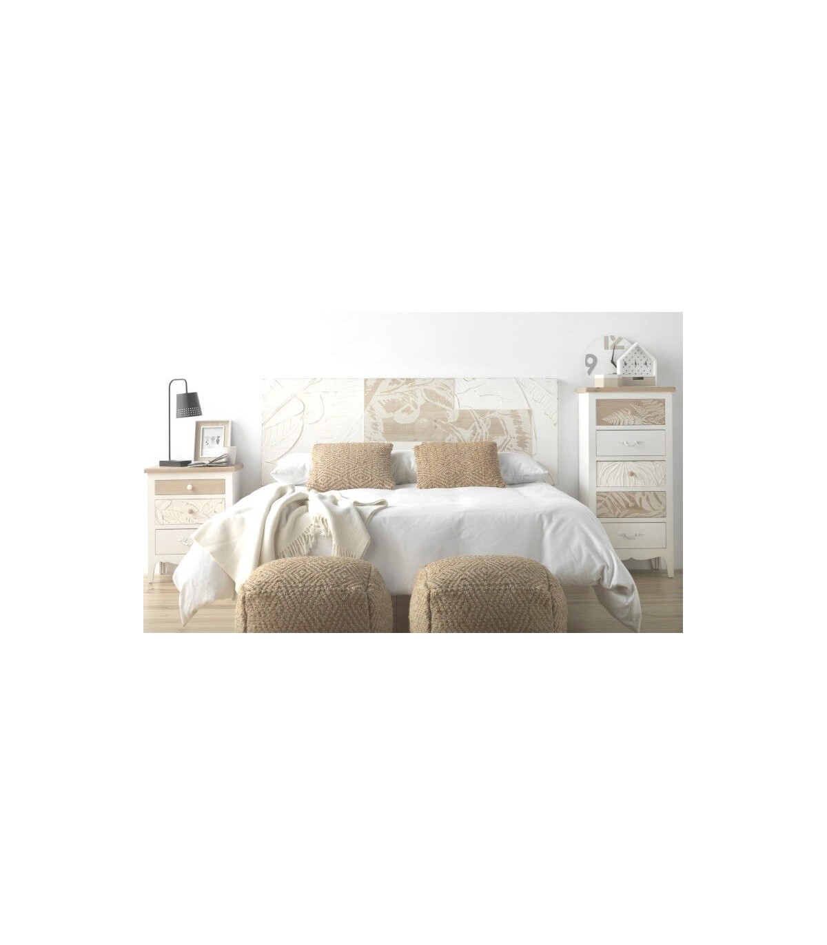Cabecero de cama de matrimonio es una pieza elegante y versátil, fabricada en madera natural combinada con blanco, que destaca por su delicado dibujo. Su diseño aporta originalidad y sofisticación al dormitorio, creando un ambiente cálido y acogedor.
