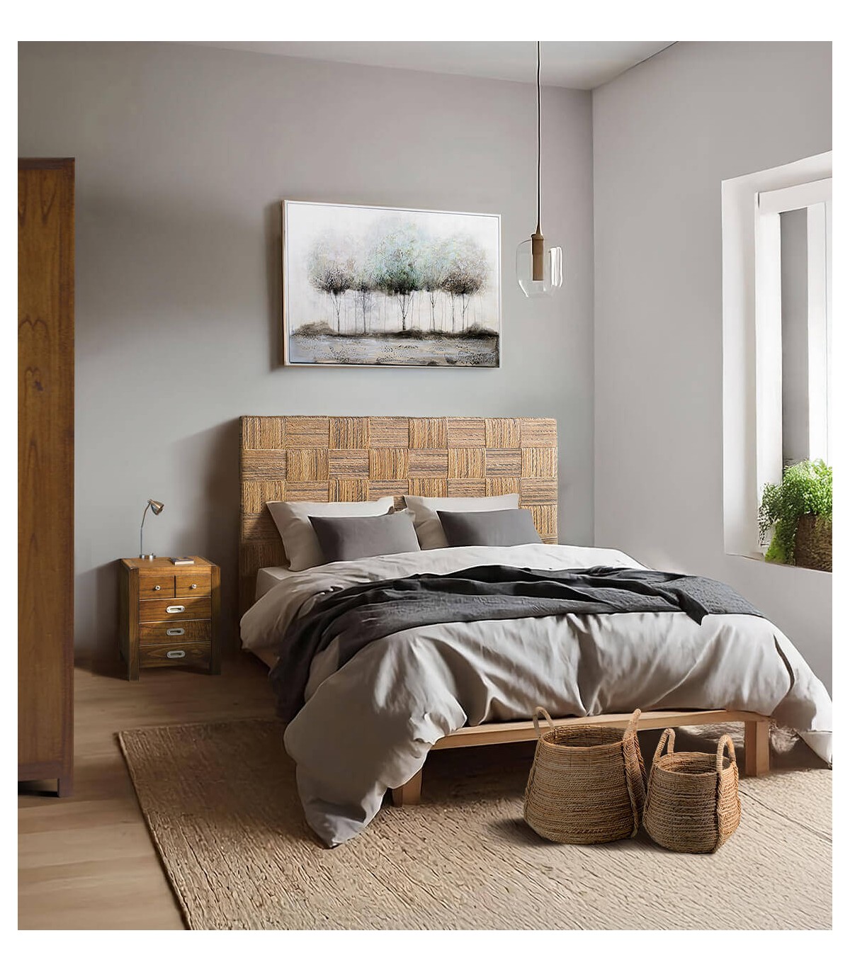 Es perfecto para camas de 150 o 160 cm, integrándose con elegancia en ambientes coloniales, rústicos o de inspiración tropical. Sus líneas sencillas equilibran textura y ligereza, dando protagonismo al entramado de fibras vegetales. Un elemento decorativo que combina tradición, confort y un estilo acogedor.