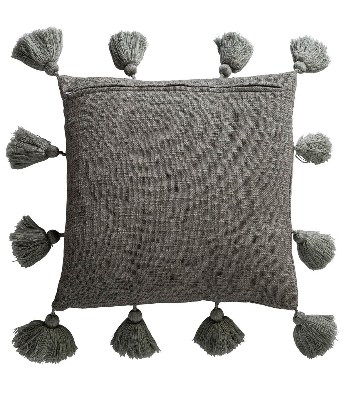 Acabado, color gris con borlas, costuras sobre hiladas.