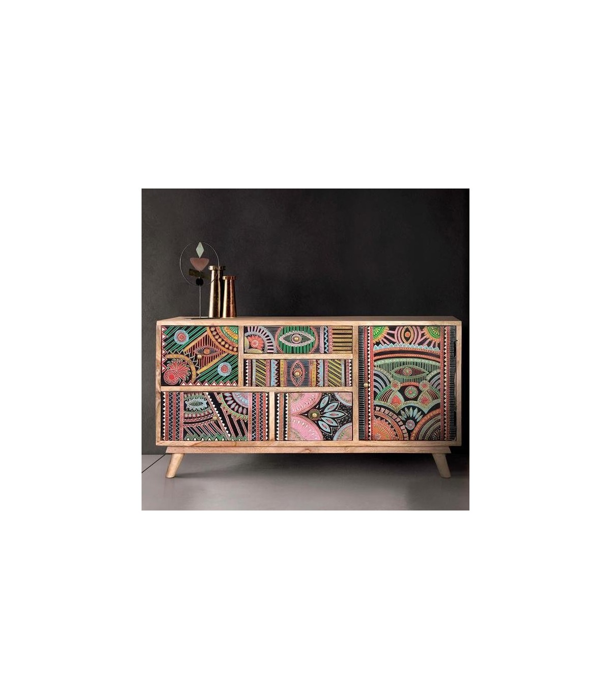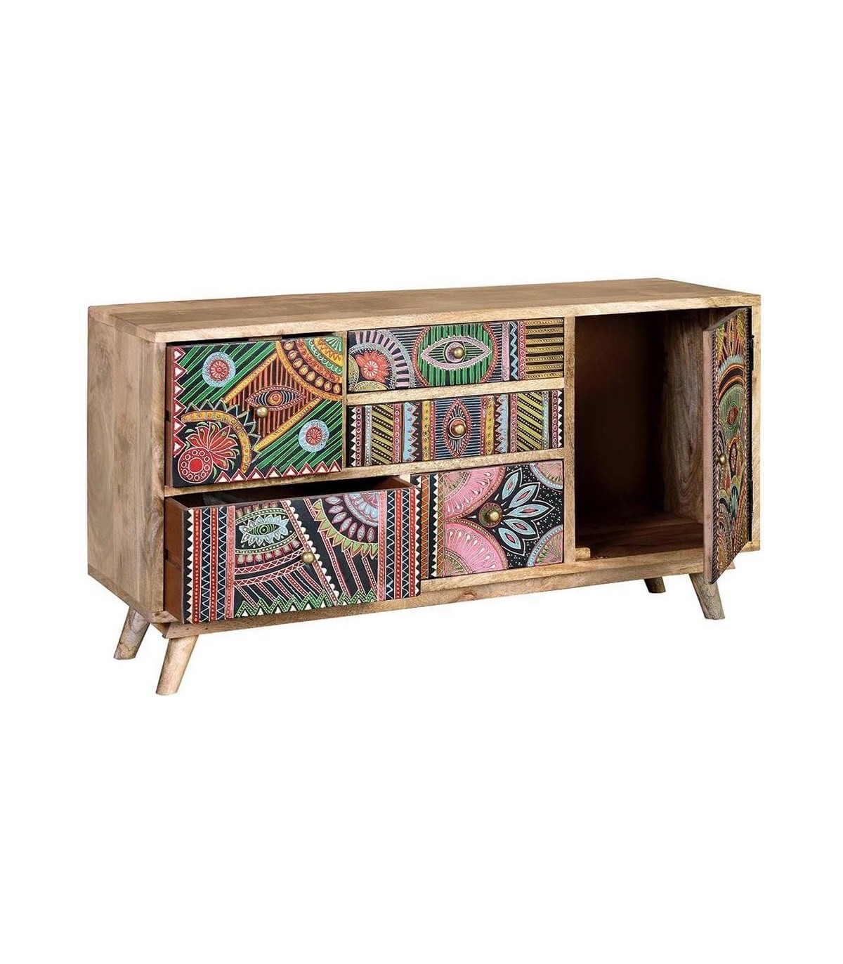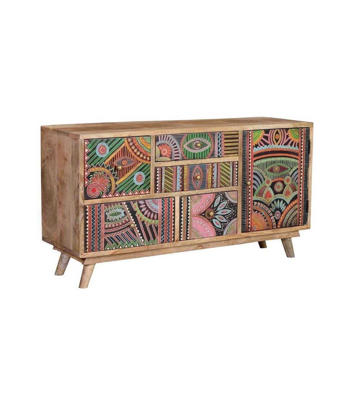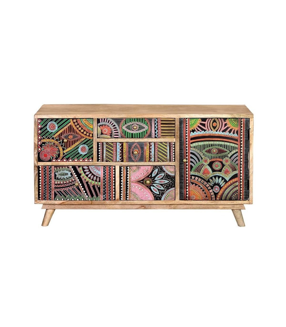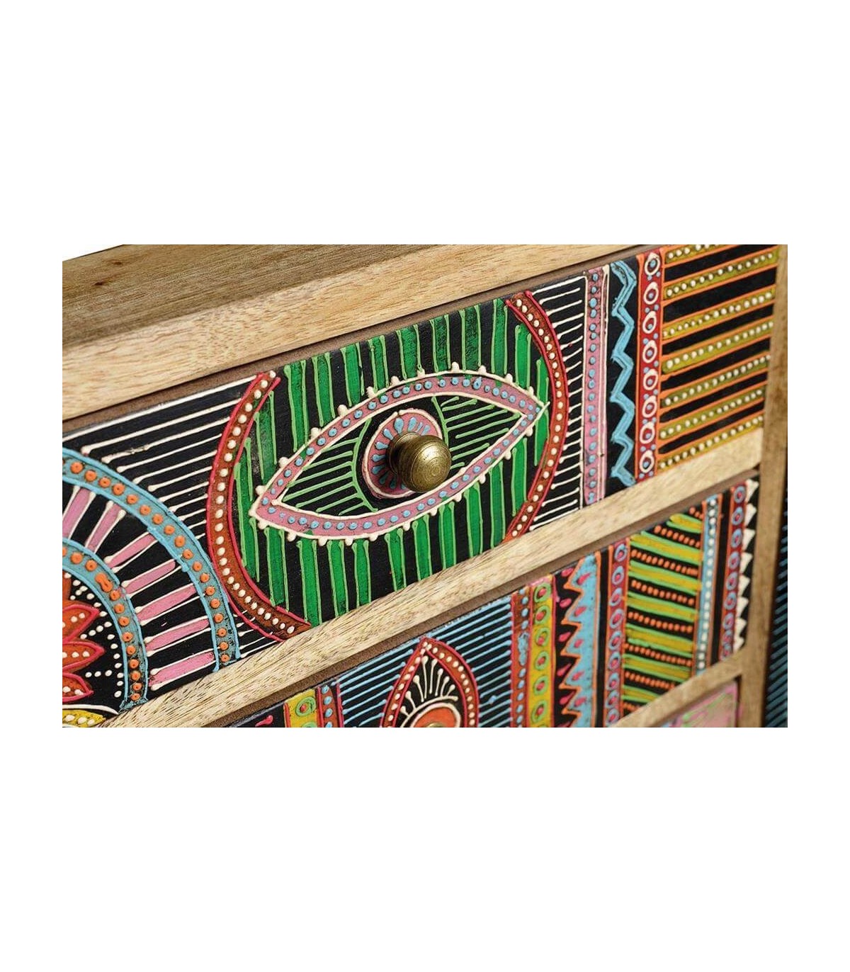 Cómoda de nuestra colección de muebles Arapea, una colección de importación realizada en la india, un mueble de buena calidad trabajado en madera maciza y con todos los detalles pintados a mano, una colección perfecta para quien quiere darle un toque étnico a su decoración.