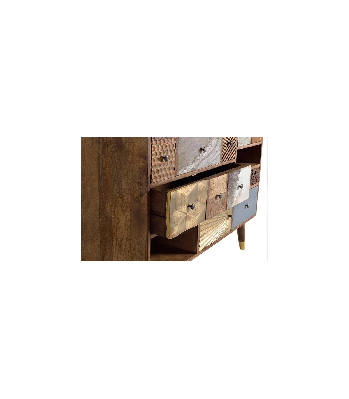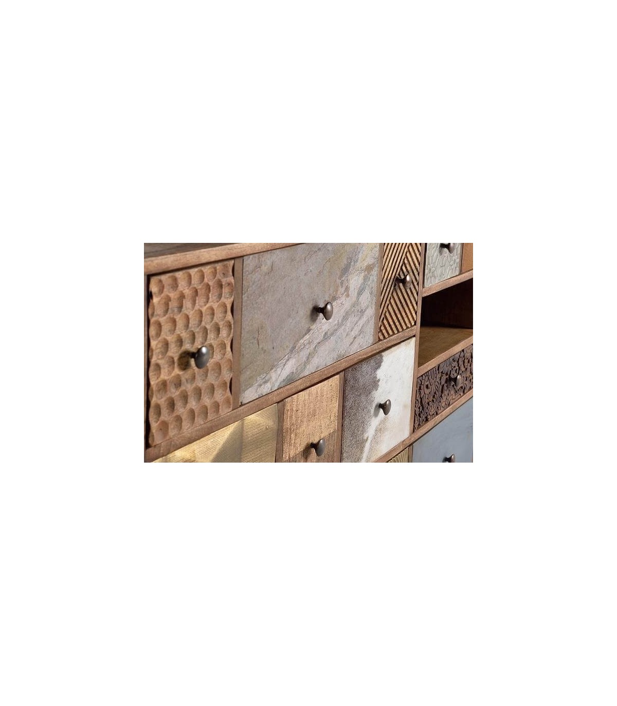 Cómoda de nuestra colección de muebles Arcila, una colección realizada en madera maciza de mango natural, con múltiples aplicaciones en distintos materiales en sus frentes, un mueble muy visual que llenará con creces el espacio, perfecto para grandes salones donde el mueble tiene su espacio.