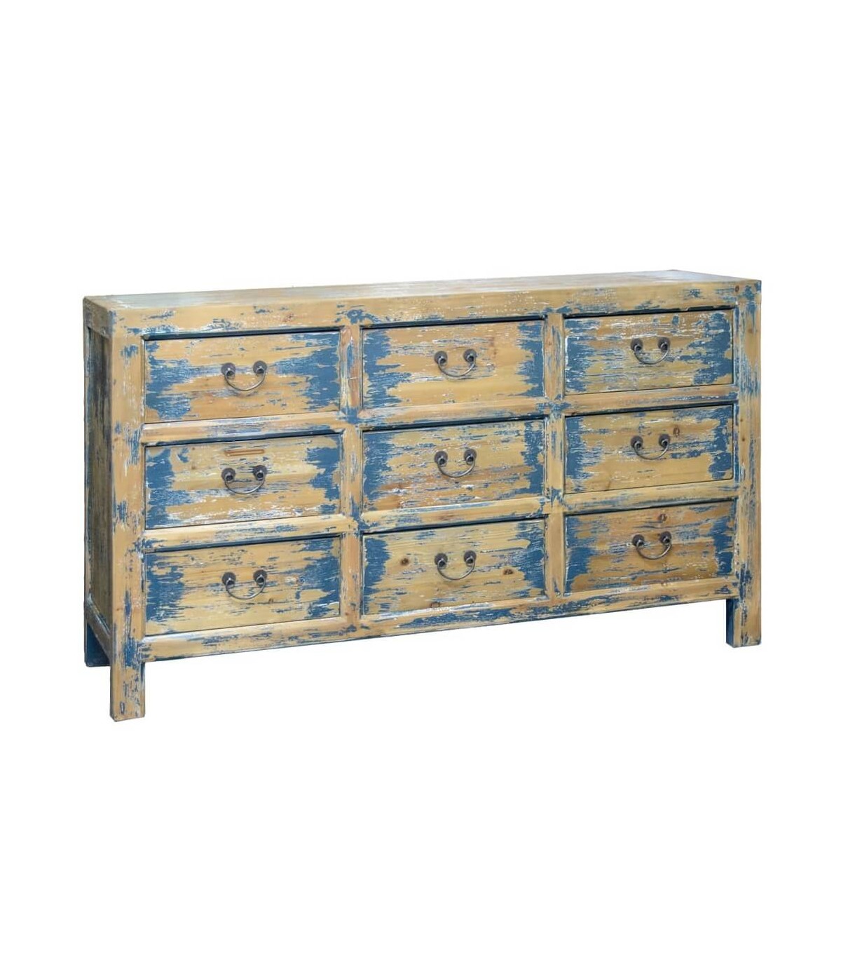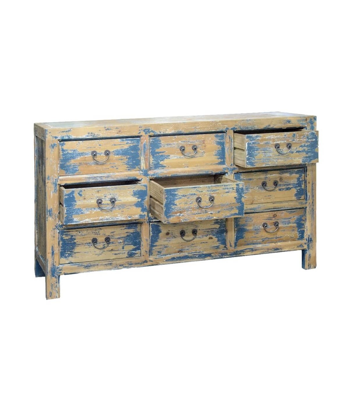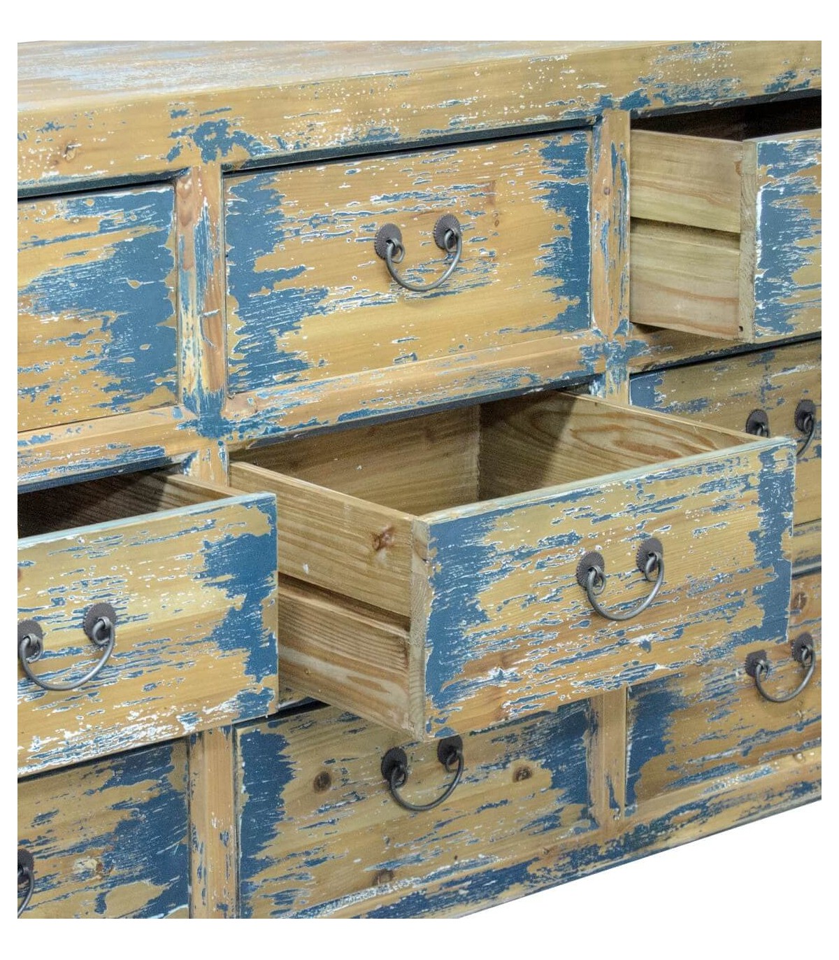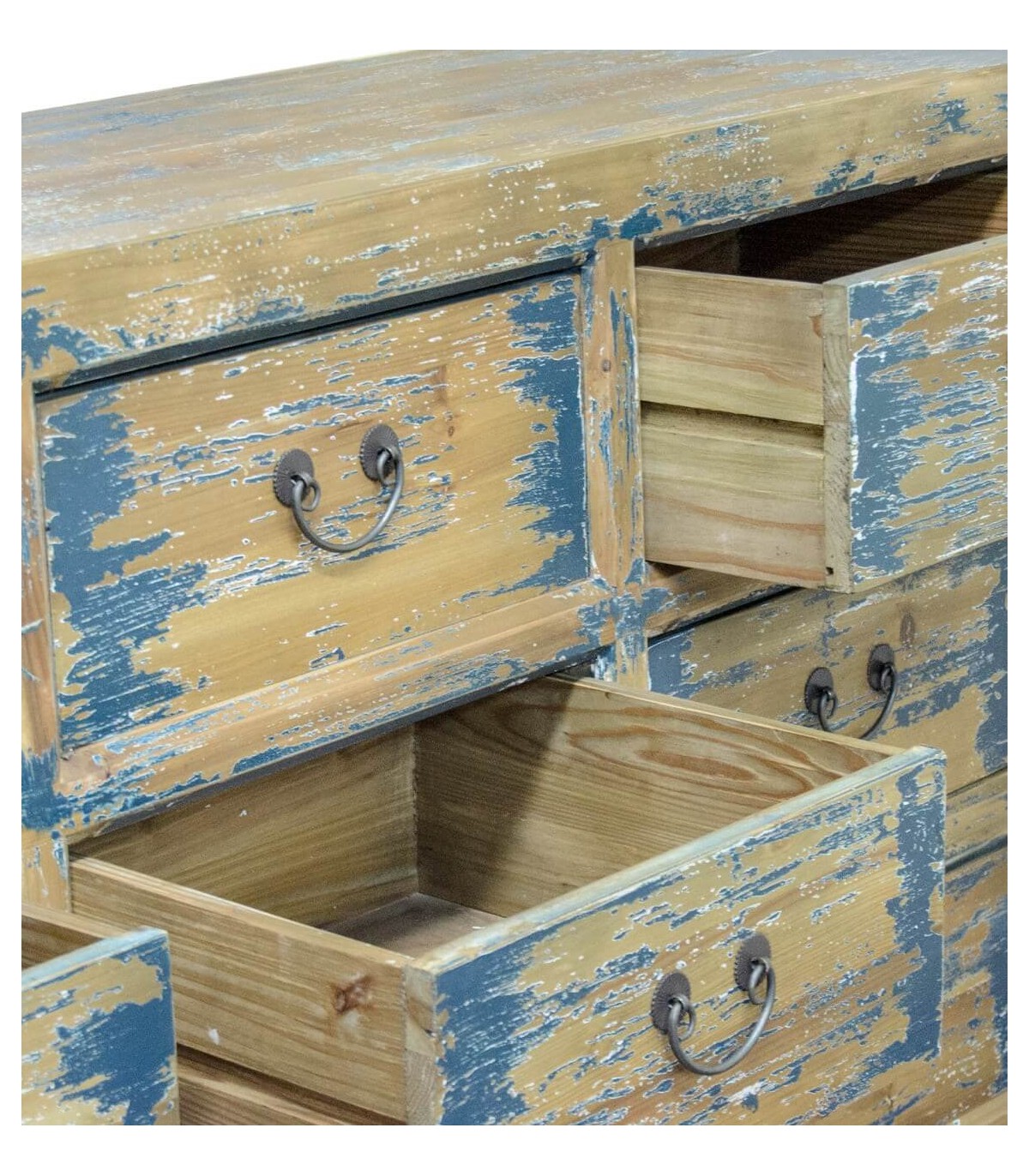 Comoda grande de estilo oriental realizada artesanalmente en madera de pino decapado en azul, perfecta como mueble en una gran entrada para tu salón o dormitorio.