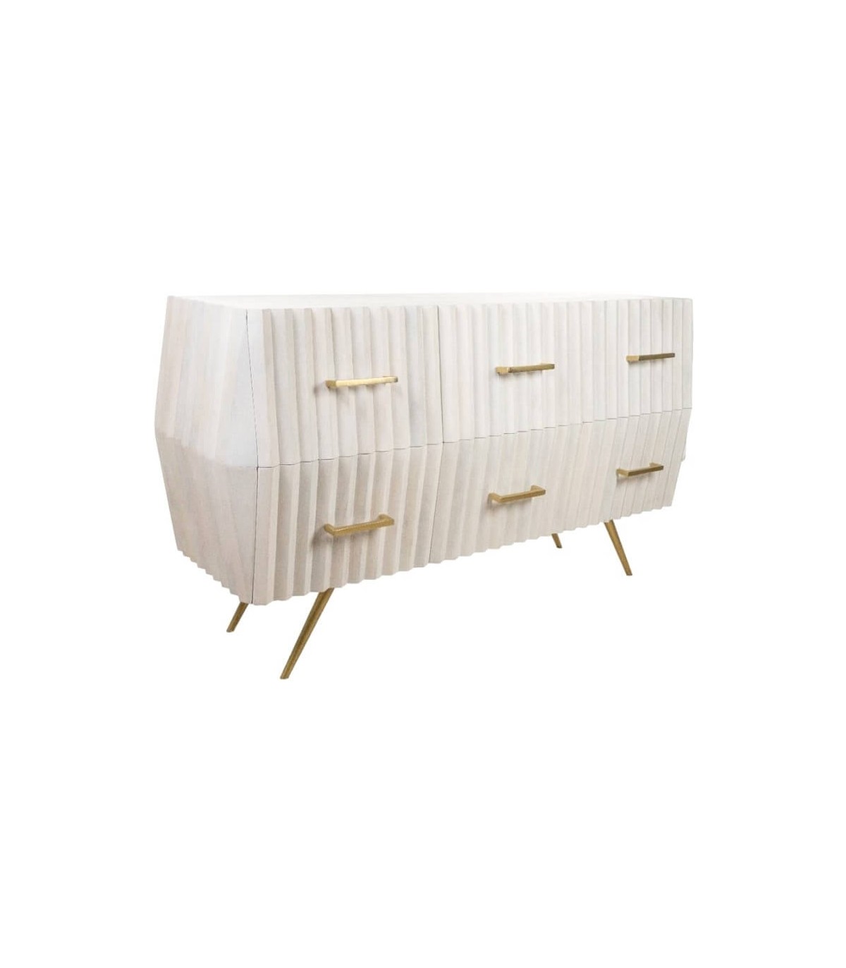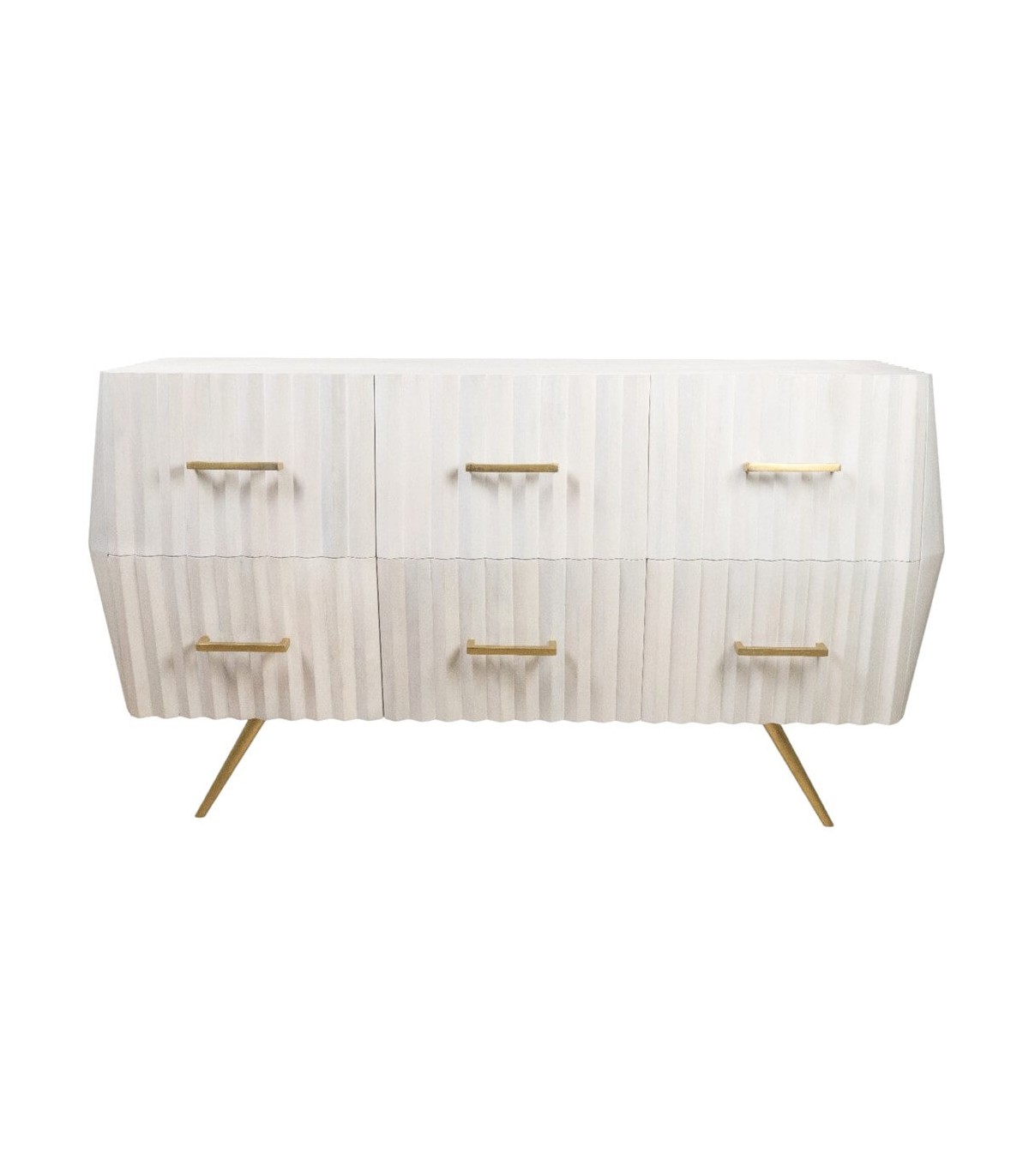 Cómoda grande original con 6 cajones realizada en madera de mango blanqueada, con los tiradores y patas en metal dorado, de estilo art decó con un punto chic, perfecta para tu dormitorio o tu salón o zona auxiliar.