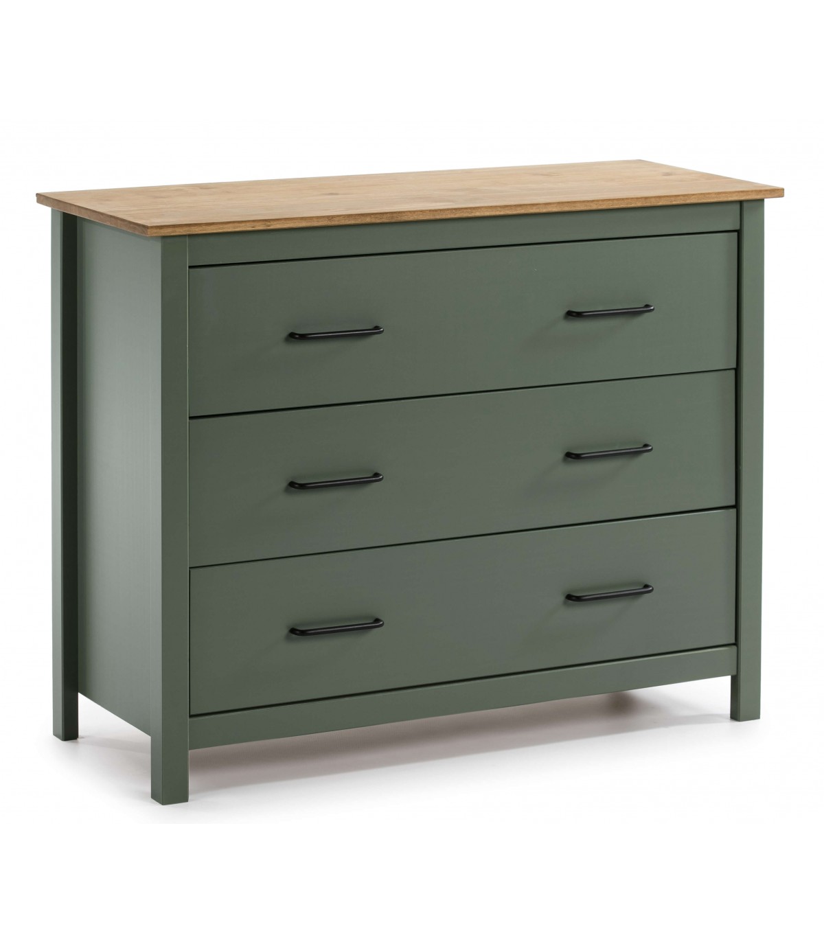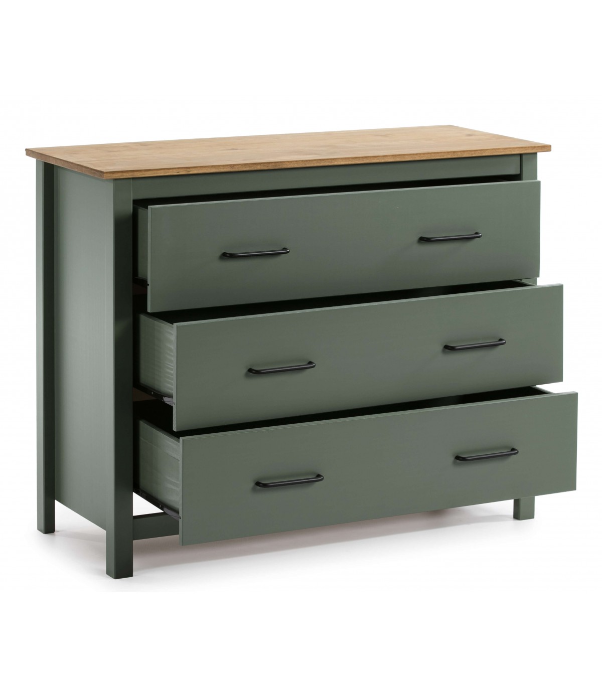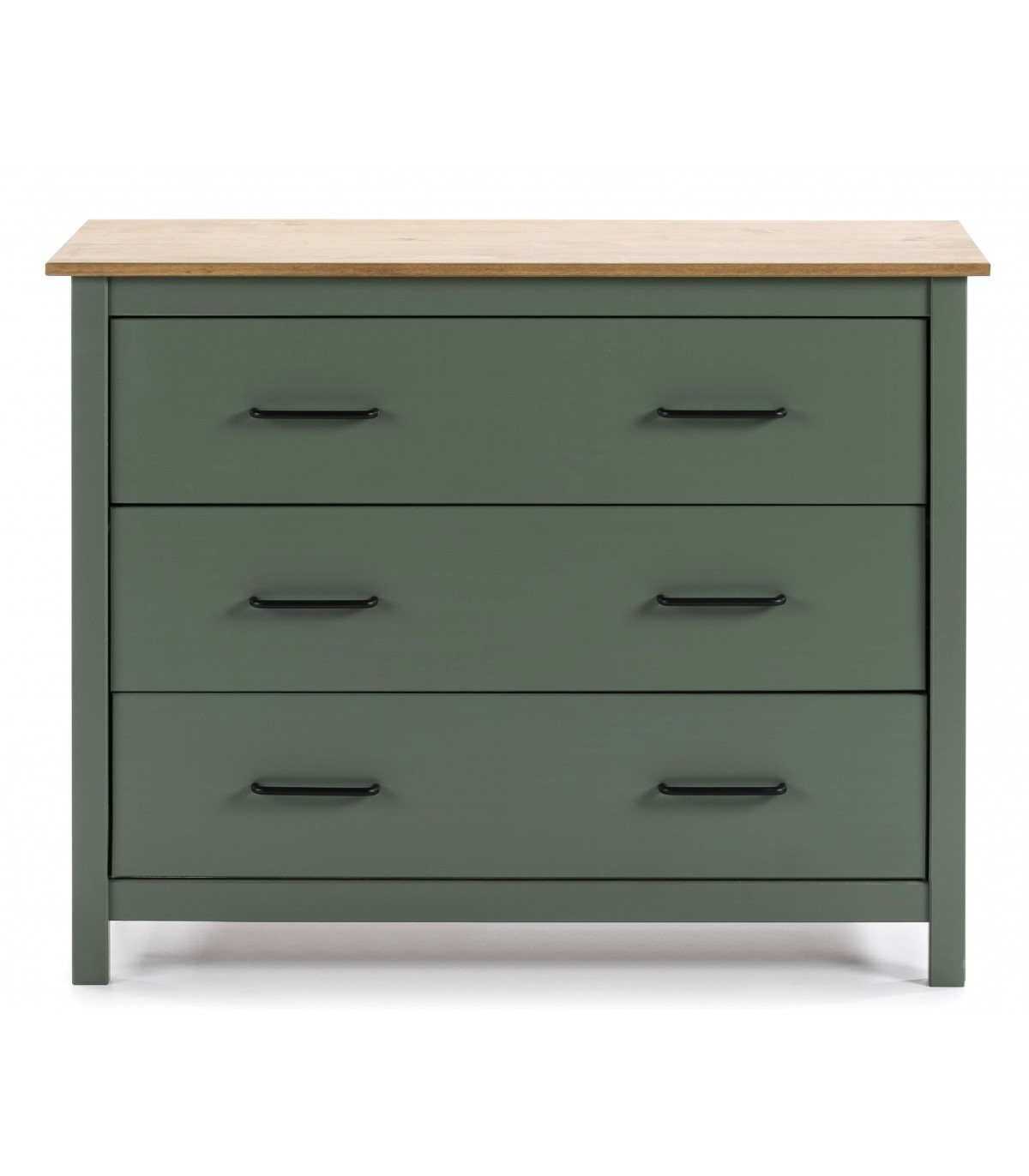 Cómoda realizada en pino natural combinado con laca verde, perfecta para un dormitorio o como mueble auxiliar, para los que quieren un mueble práctico y decorativo, ideal para darle una nota de color a decoraciones planas.