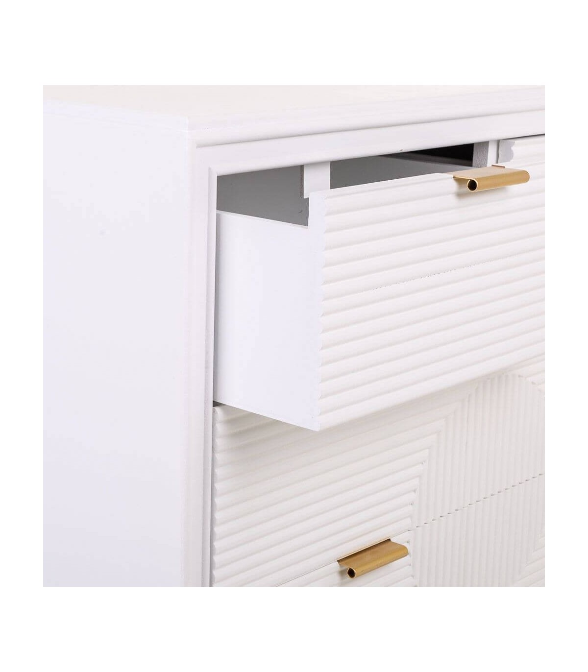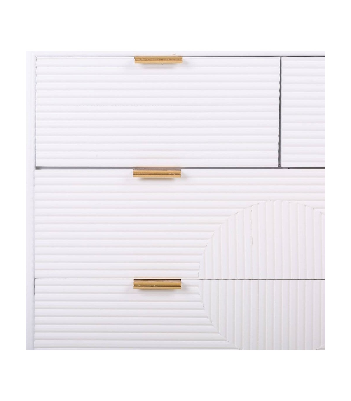 Cómoda de nuestra colección Neo, una colección que se caracteriza por su estilo art decó, realizada en madera lacada en negro o blanco, de líneas rectas con el contraste de los dibujos geométricos en sus frentes y el contraste con el oro, una colección muy elegante con muebles y complementos para cualquier lugar de tu casa.