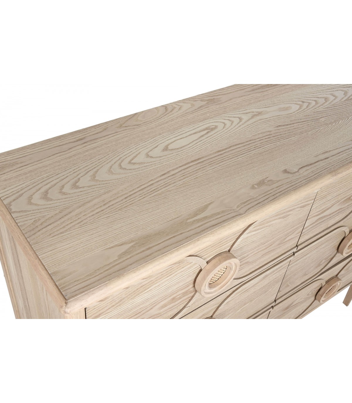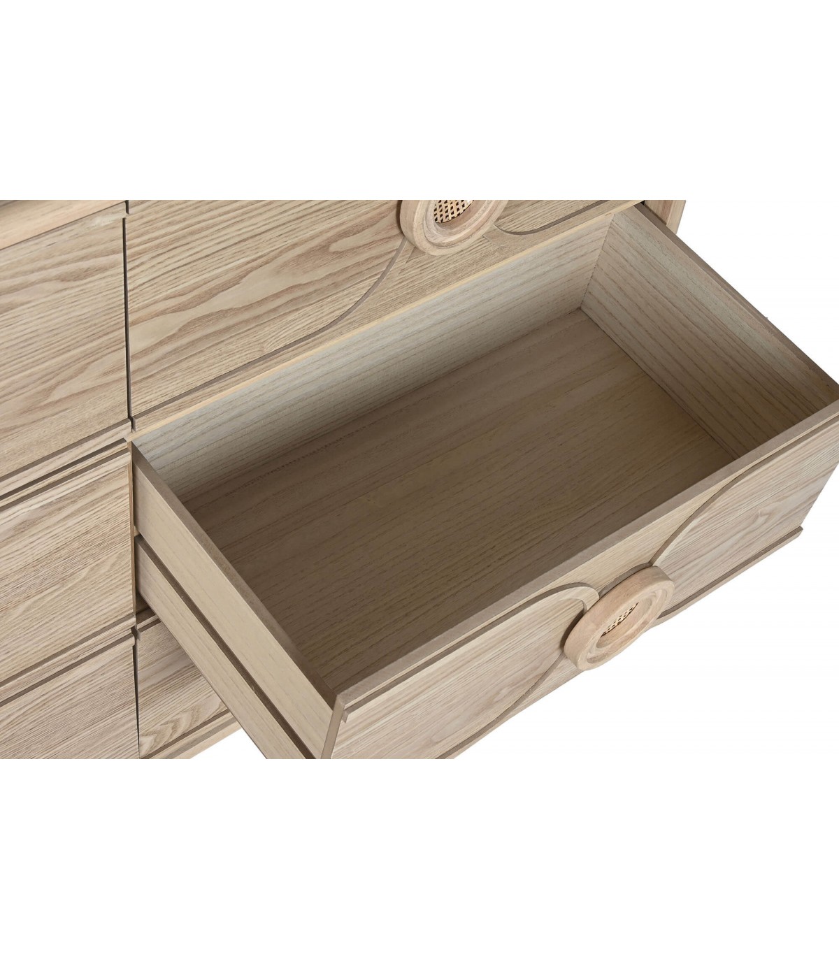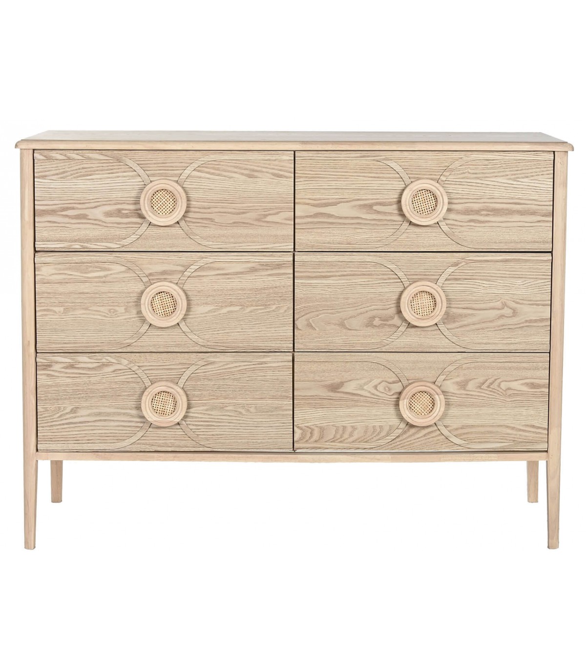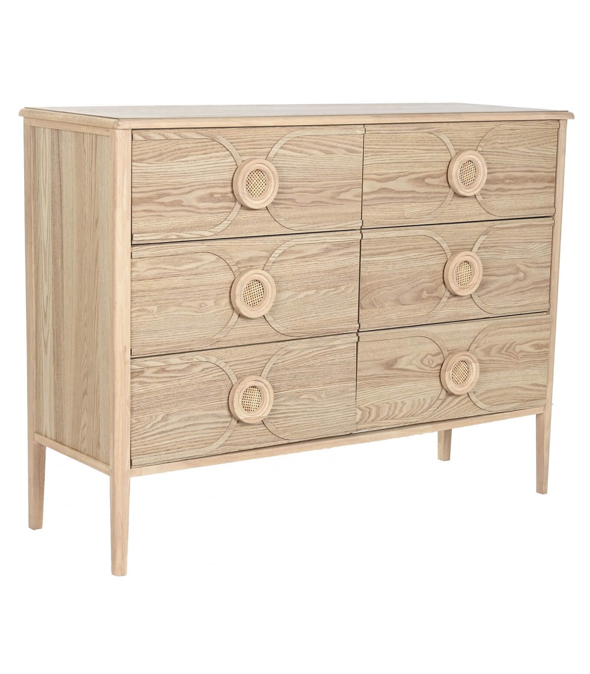 La cómoda Berto destaca por su diseño armonioso con inspiración oriental chic, realzado por las vetas visibles del abeto natural y los tiradores circulares de ratán trenzado. Sus seis cajones proporcionan un almacenamiento generoso, ideal para dormitorios o zonas comunes que buscan una estética cálida y natural. La combinación de madera y fibras vegetales aporta un carácter artesanal y exótico, sin renunciar a la funcionalidad. Una pieza de mobiliario versátil que llena cualquier ambiente de estilo y personalidad.