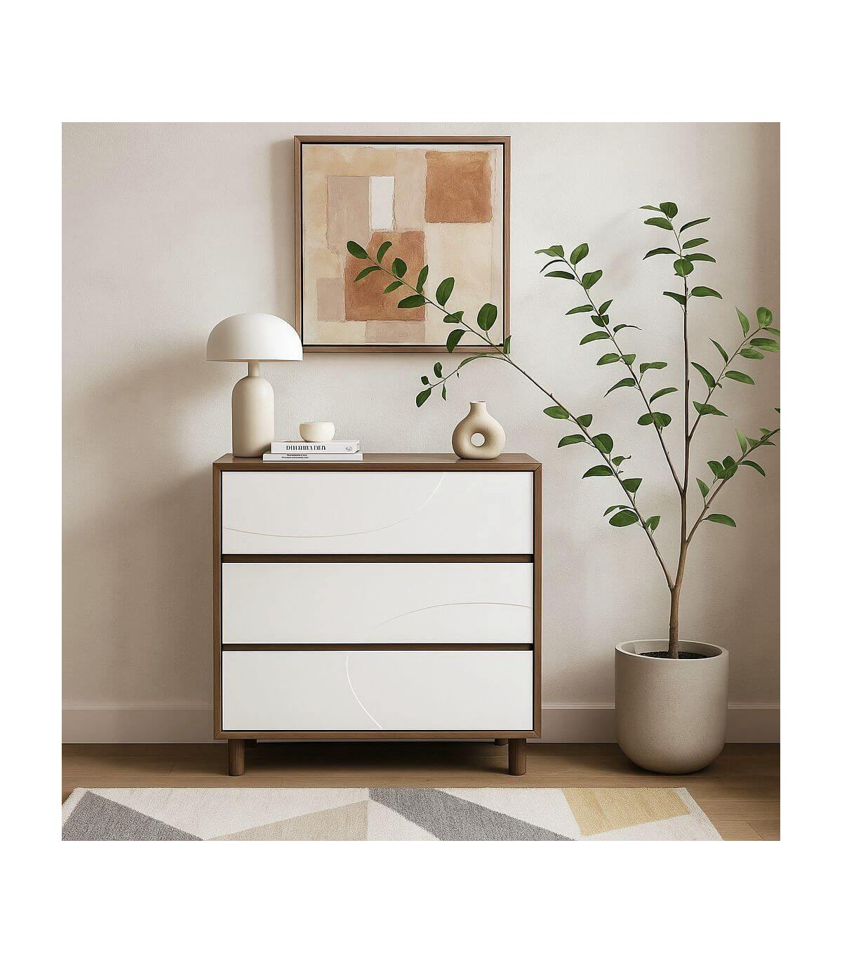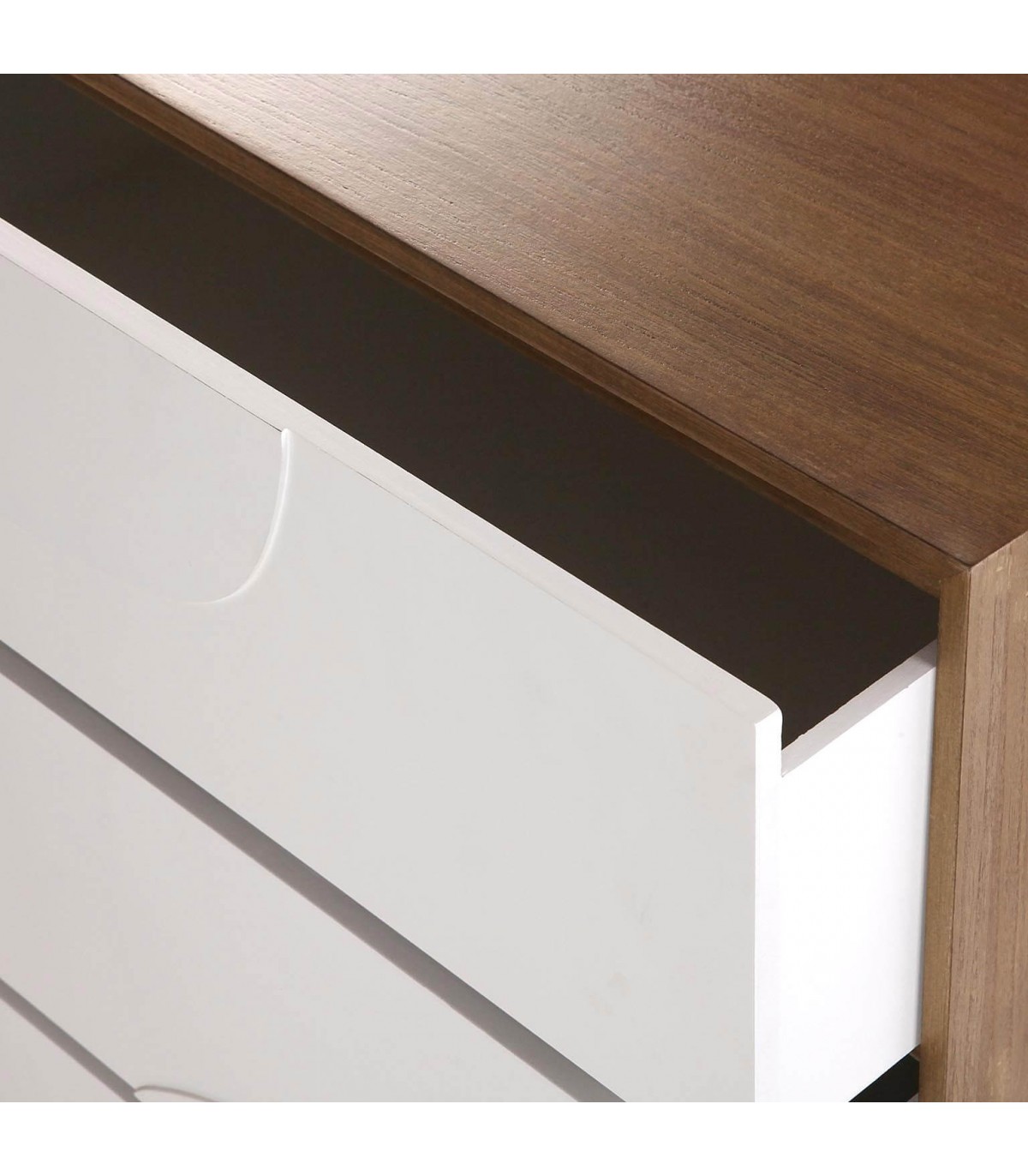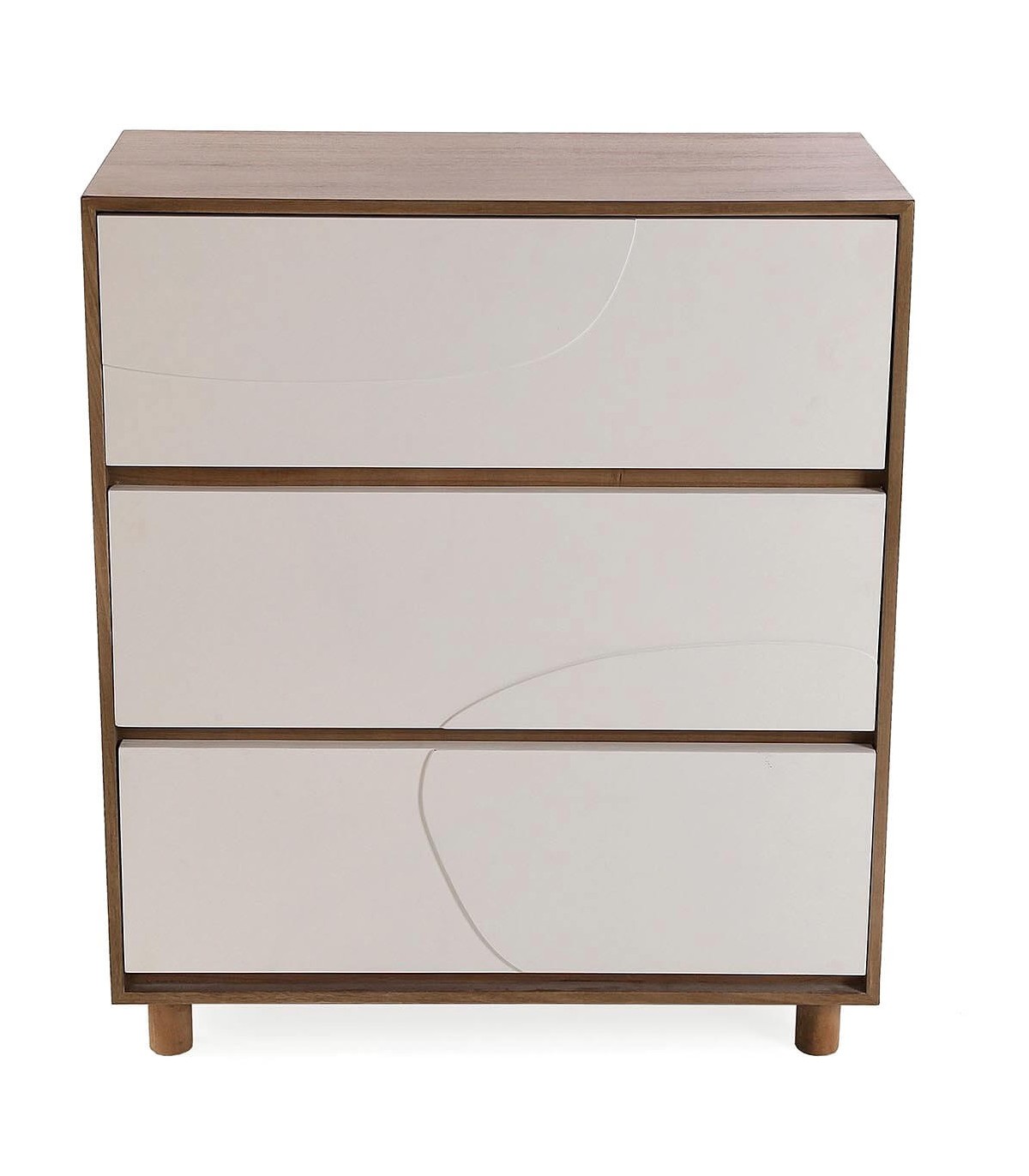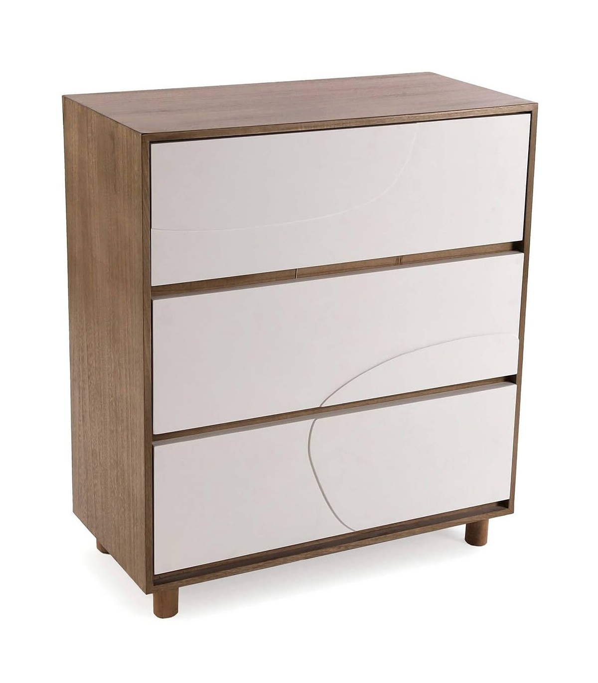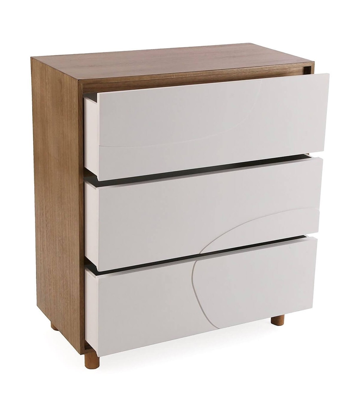 Cómoda pequeña realizada en madera teñida color nogal con los cajones con un realce lacados en blanco, con 3 cajones, perfecta para tu dormitorio o una zona auxiliar.