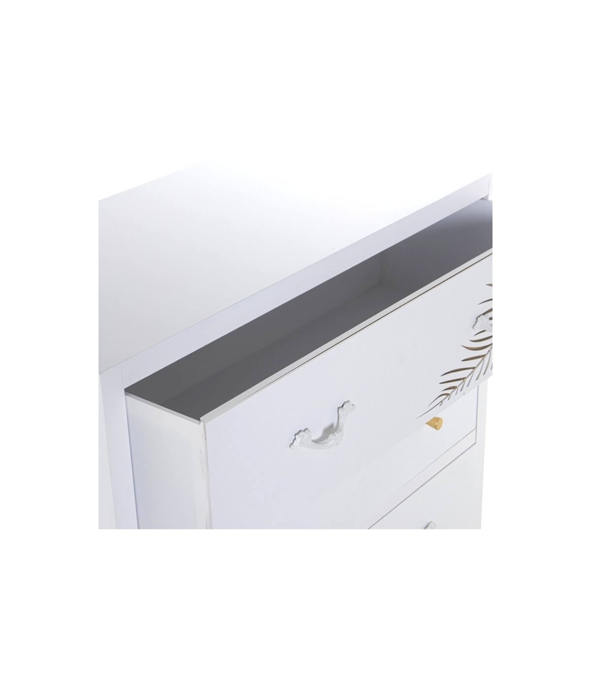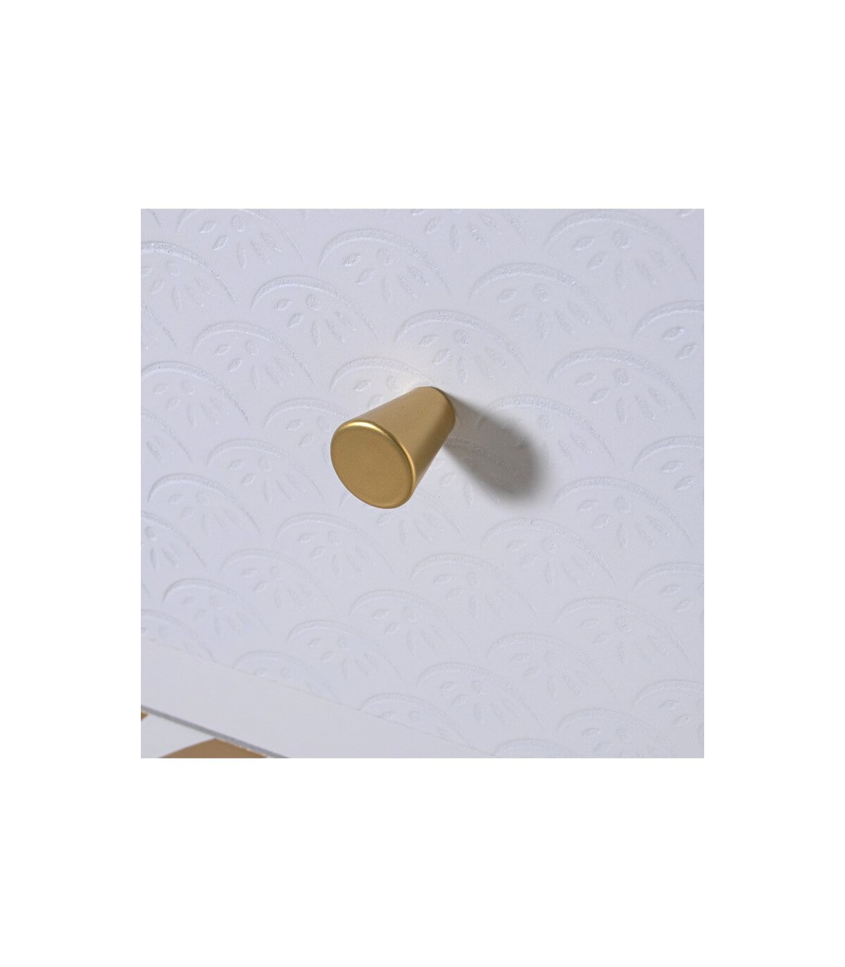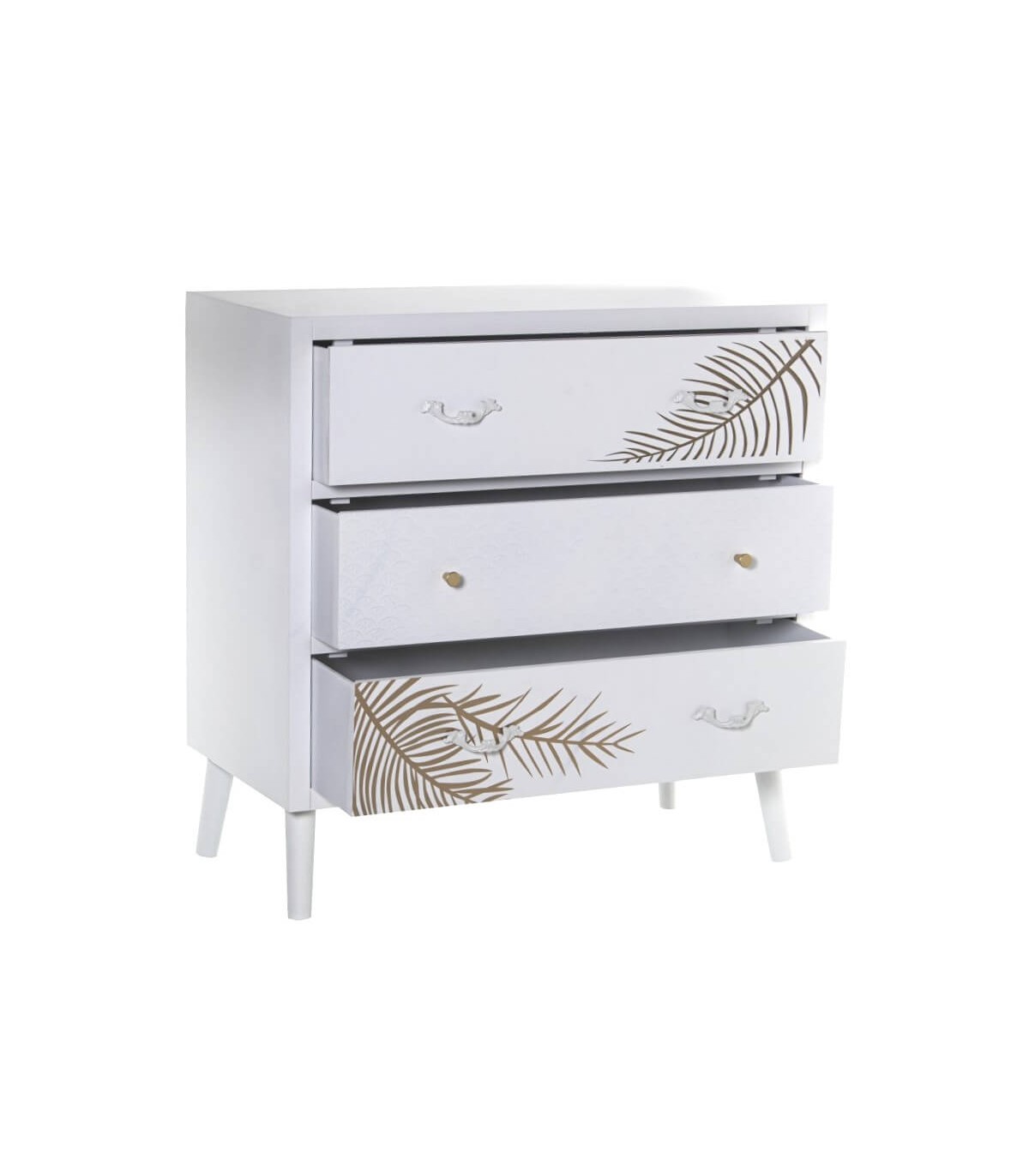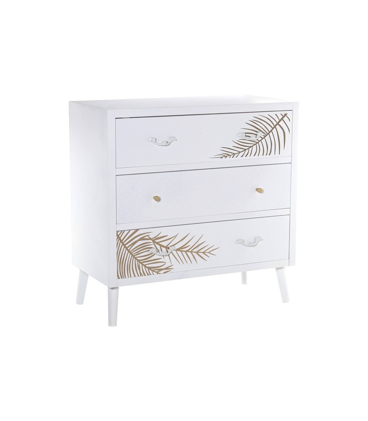 Cómoda pequeña con 3 cajones realizada en madera lacada en blanco decorada con aplicaciones doradas, tiradores combinados en oro y blanco, de estilo art decó con un punto chic, perfecta para tu dormitorio o tu salón o zona auxiliar.