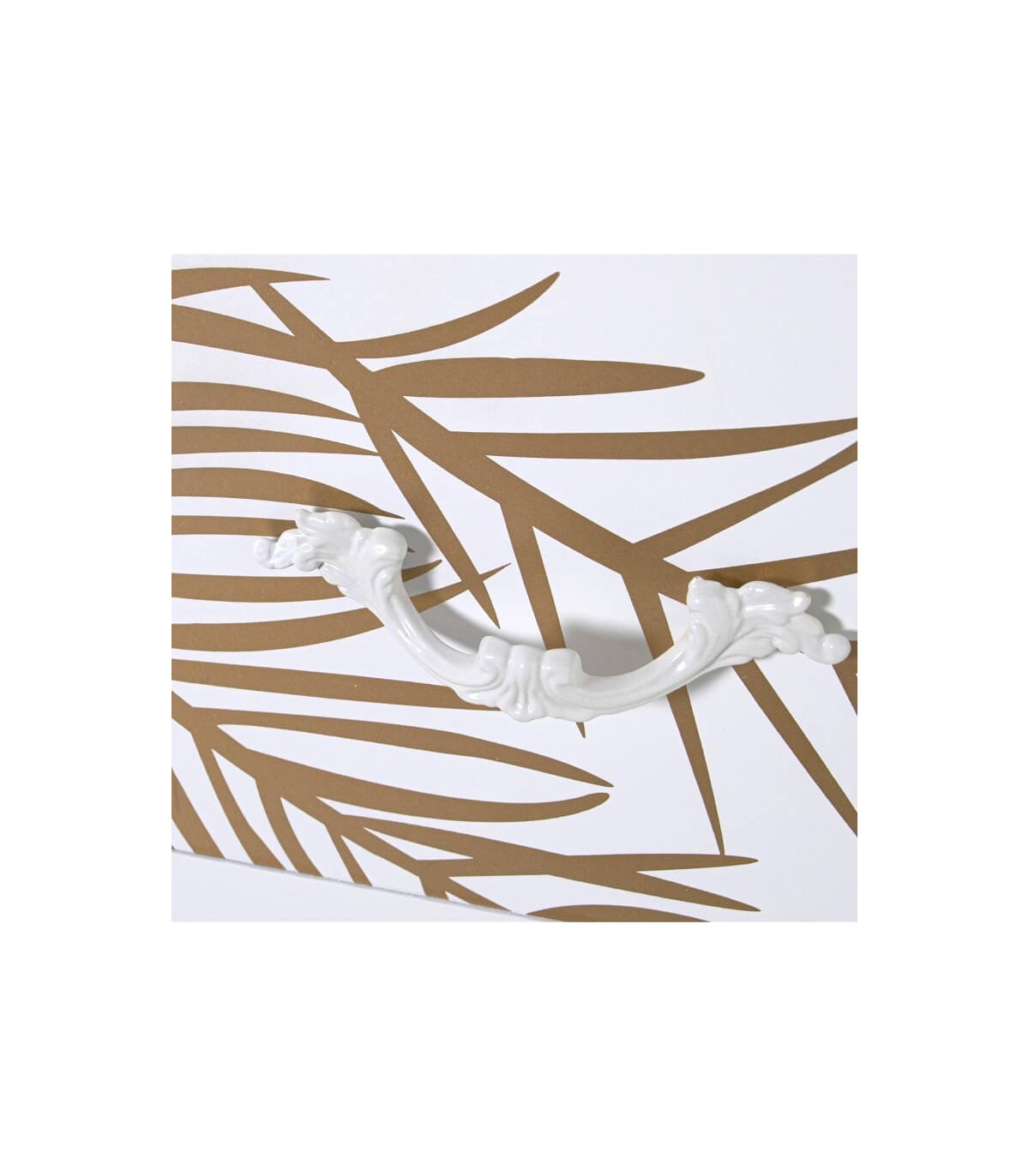 Acabado, madera lacada en blanco decorada con aplicaciones doradas, tiradores combinados en oro y blanco.