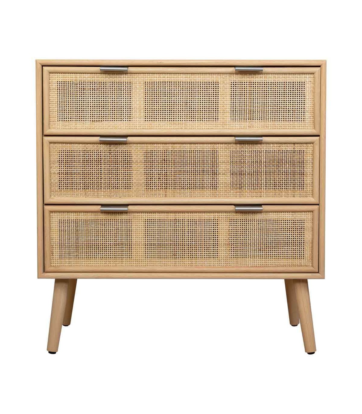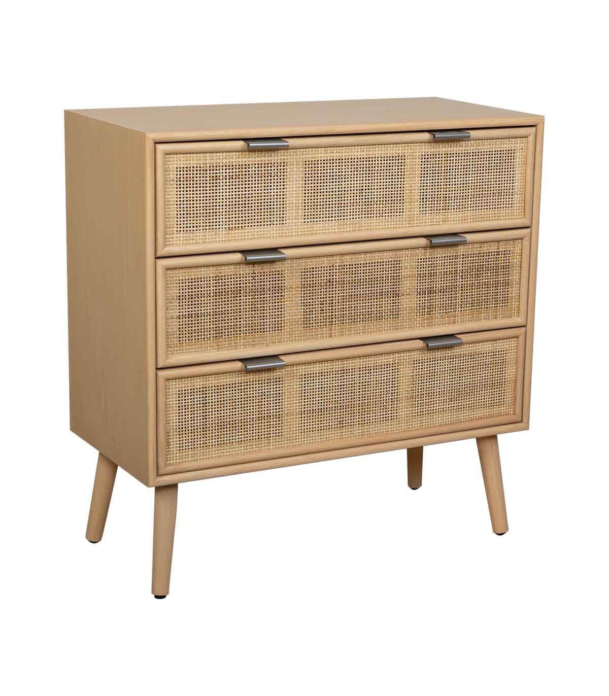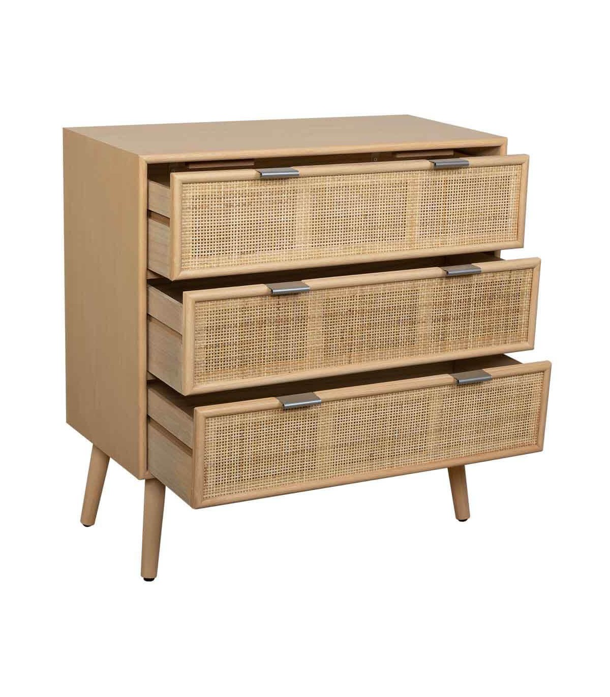 Cómoda con 3 cajones realizada en madera de paulonia y ratán naturales con los tiradores en metal negro, una cómoda ligera de buena capacidad muy decorativa.