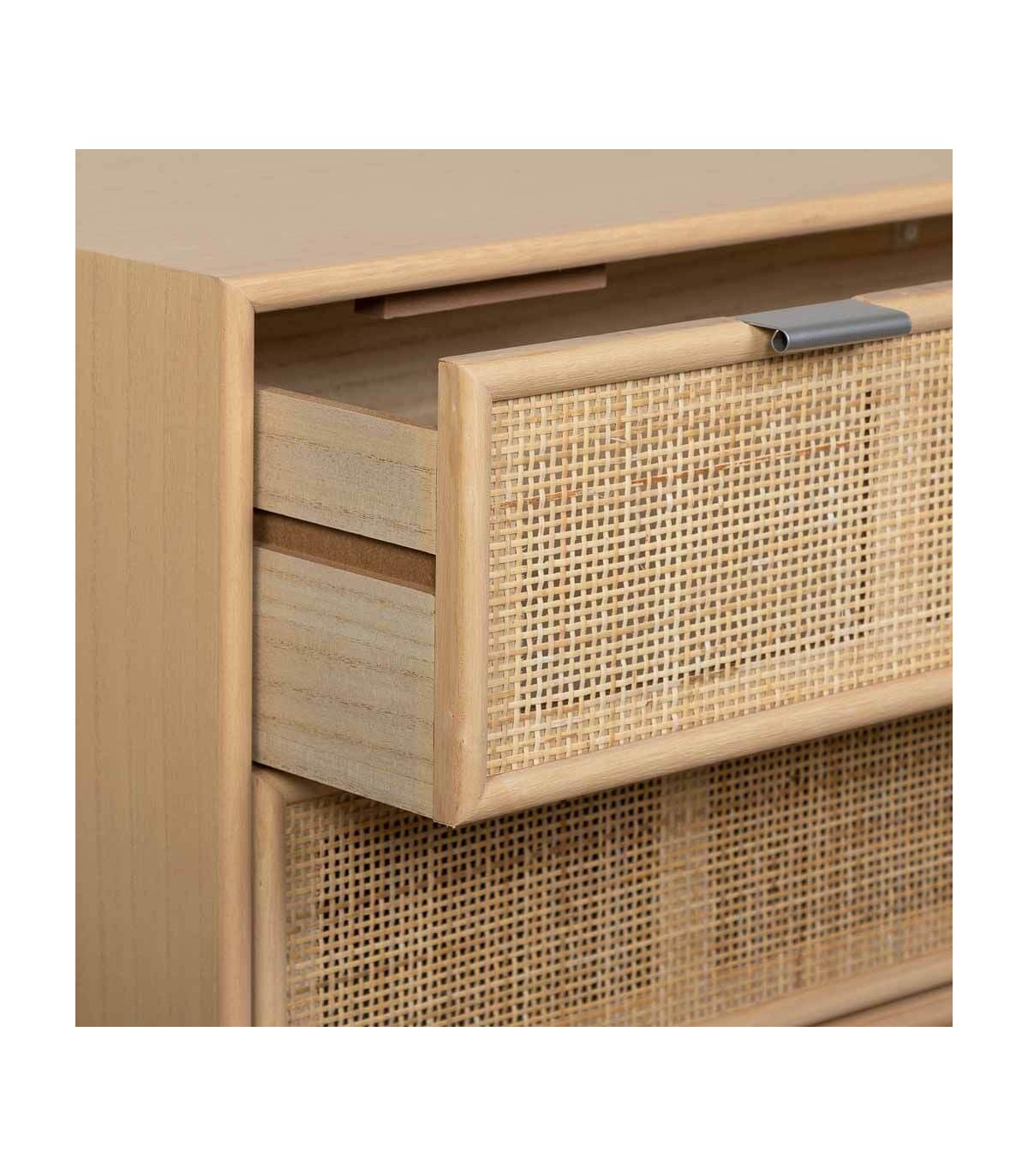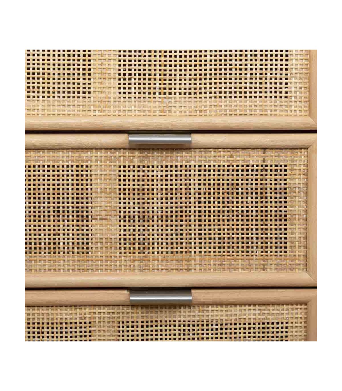 Acabado, madera color natural, ratán natural, tiradores metal cromado.