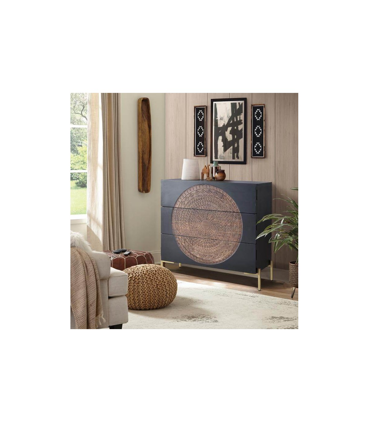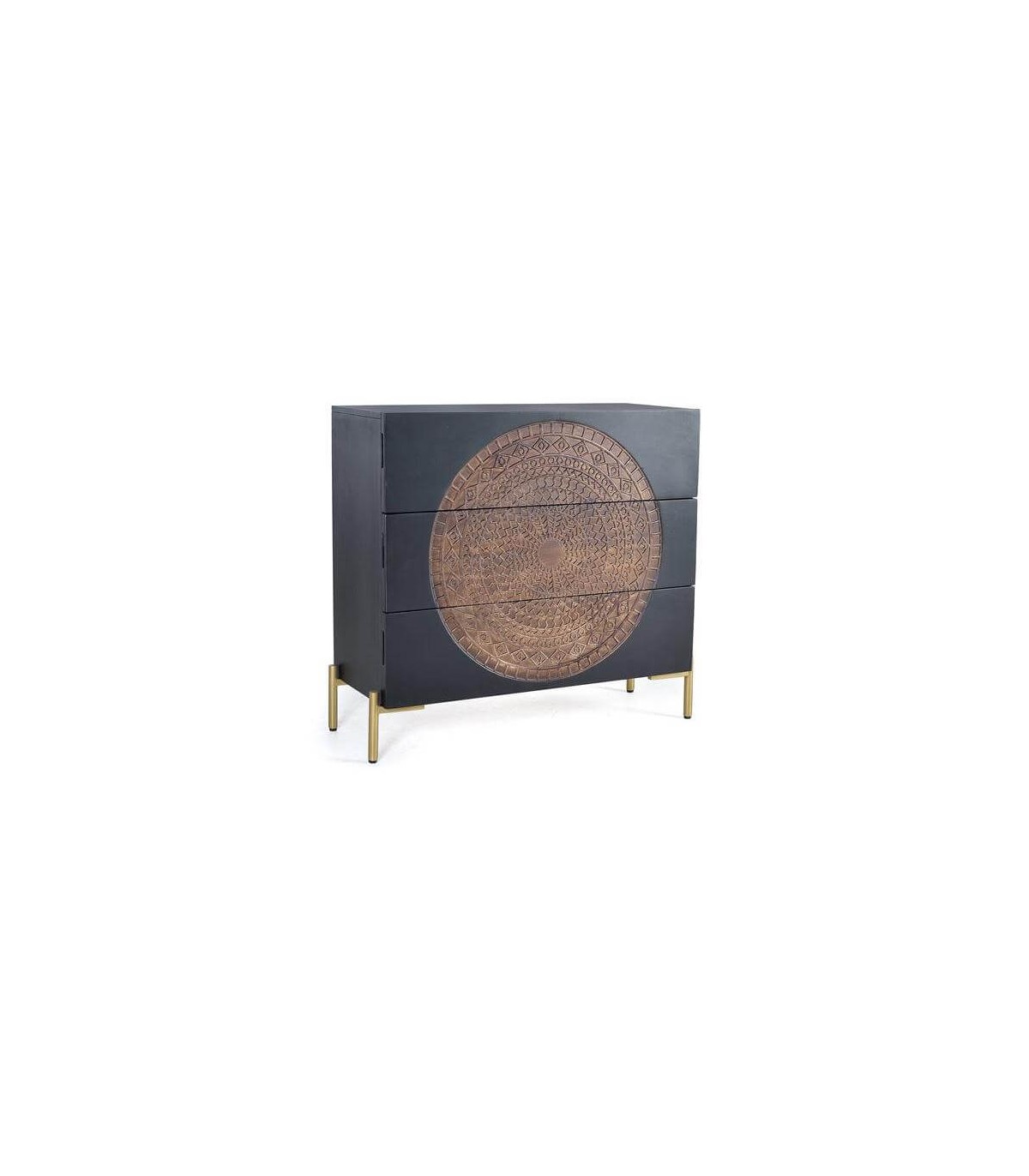 Comoda con 3 cajones, realizada en madera de mango lacada en negro y patas en metal patinado en oro, frente de los cajones tallados a mano, de estilo moderno, perfecta tu salón comedor o dormitorio.