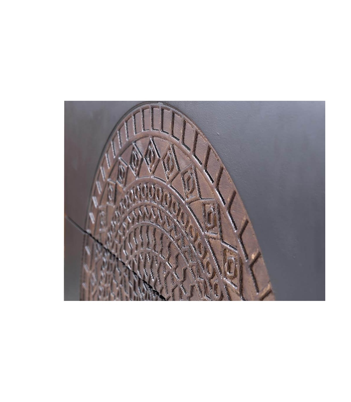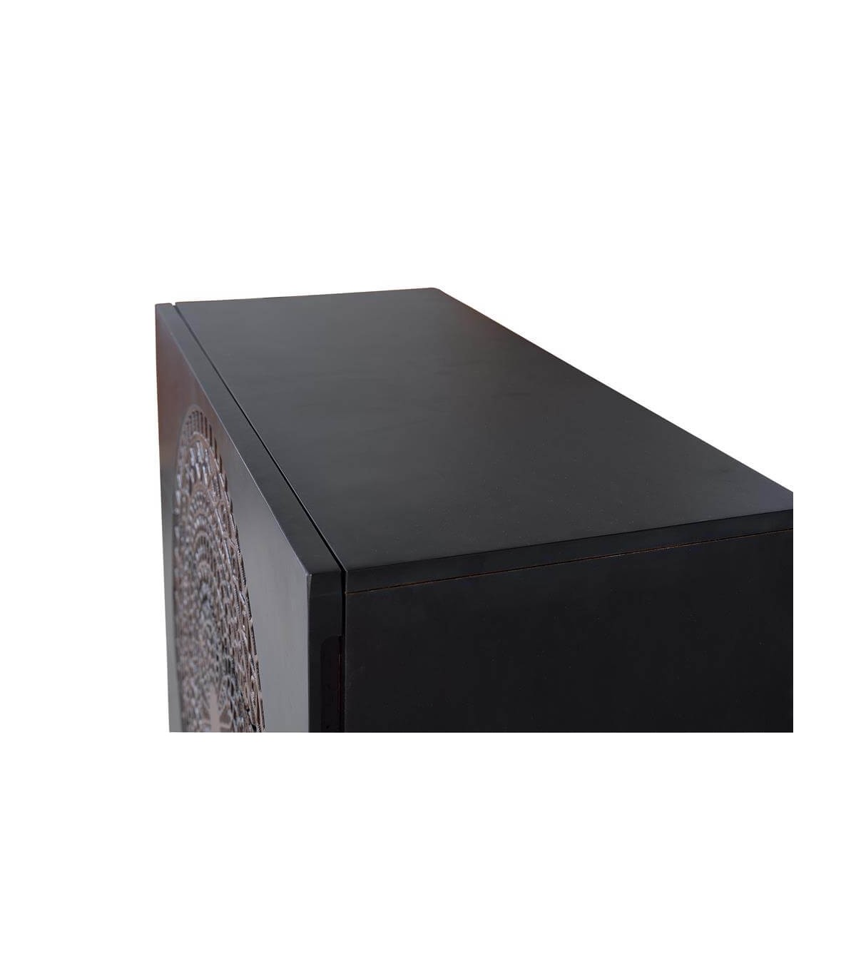 Acabado, madera de mango lacada en negro con el frente del cajón tallados a mano, patas en metal patinado en oro.