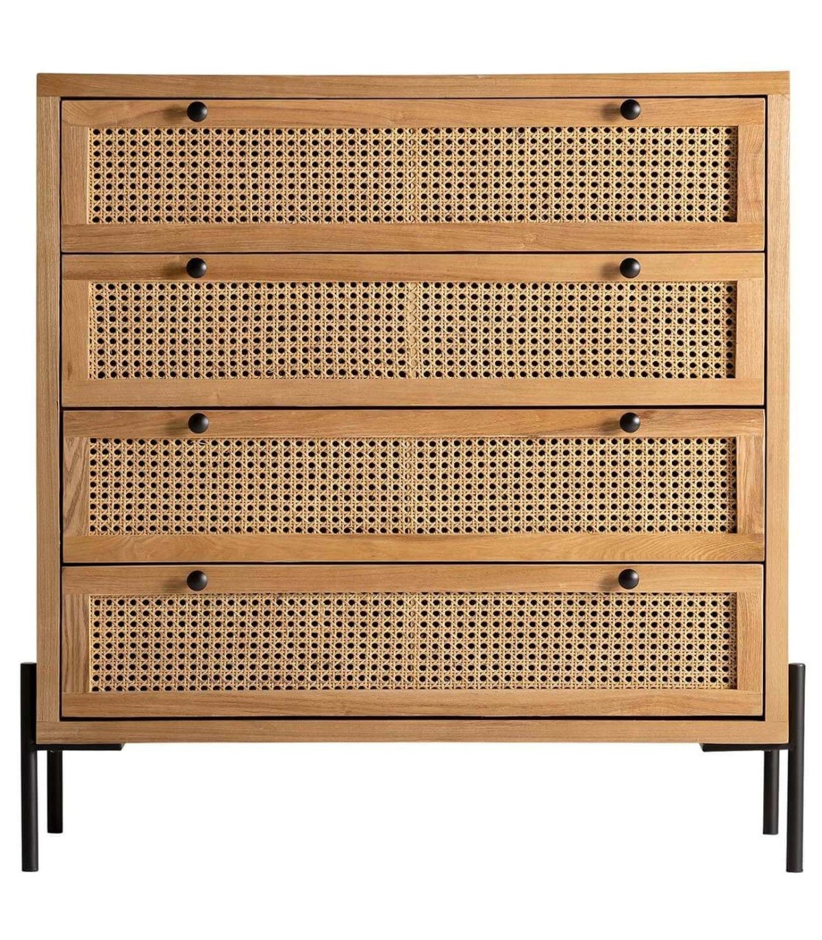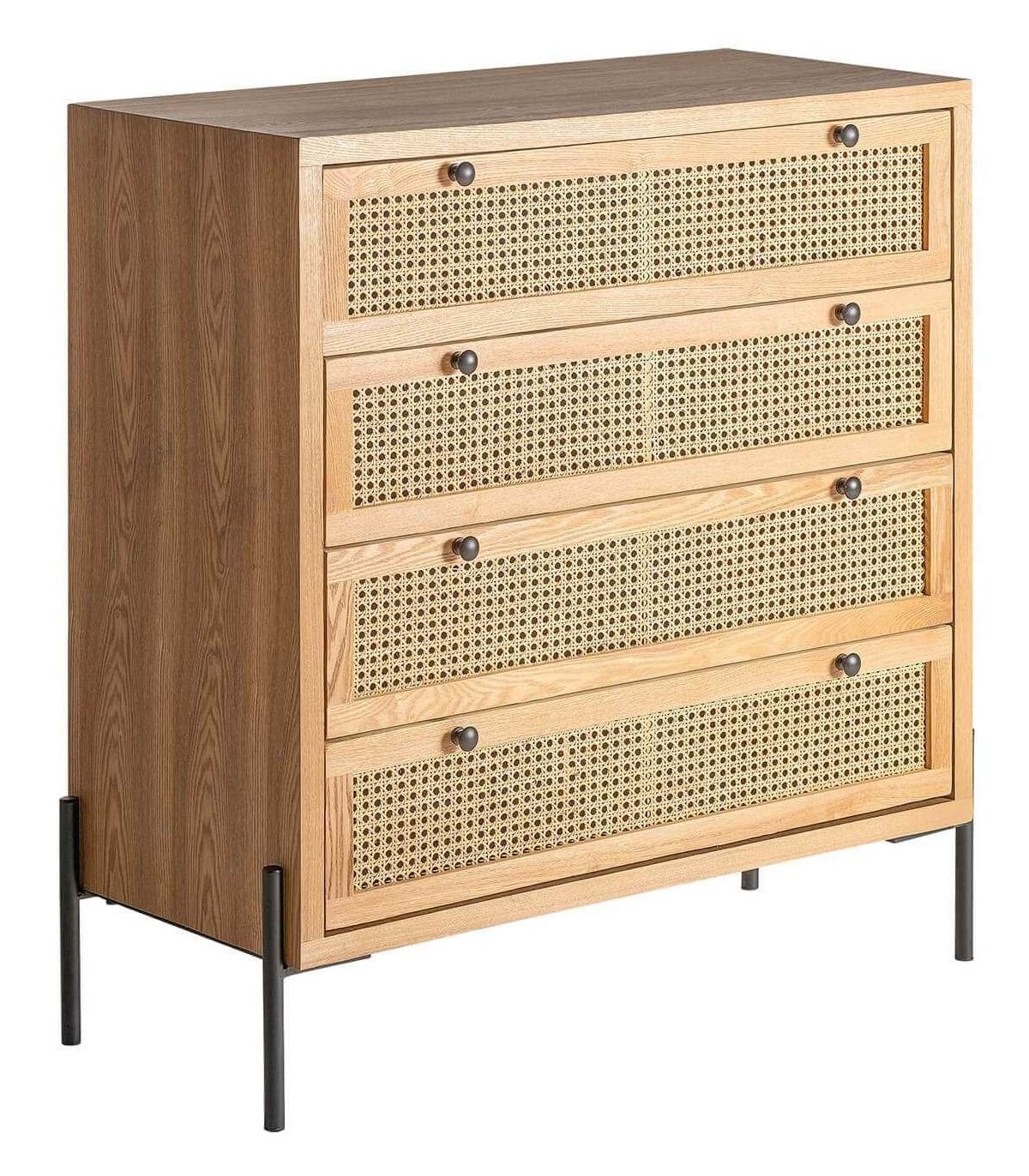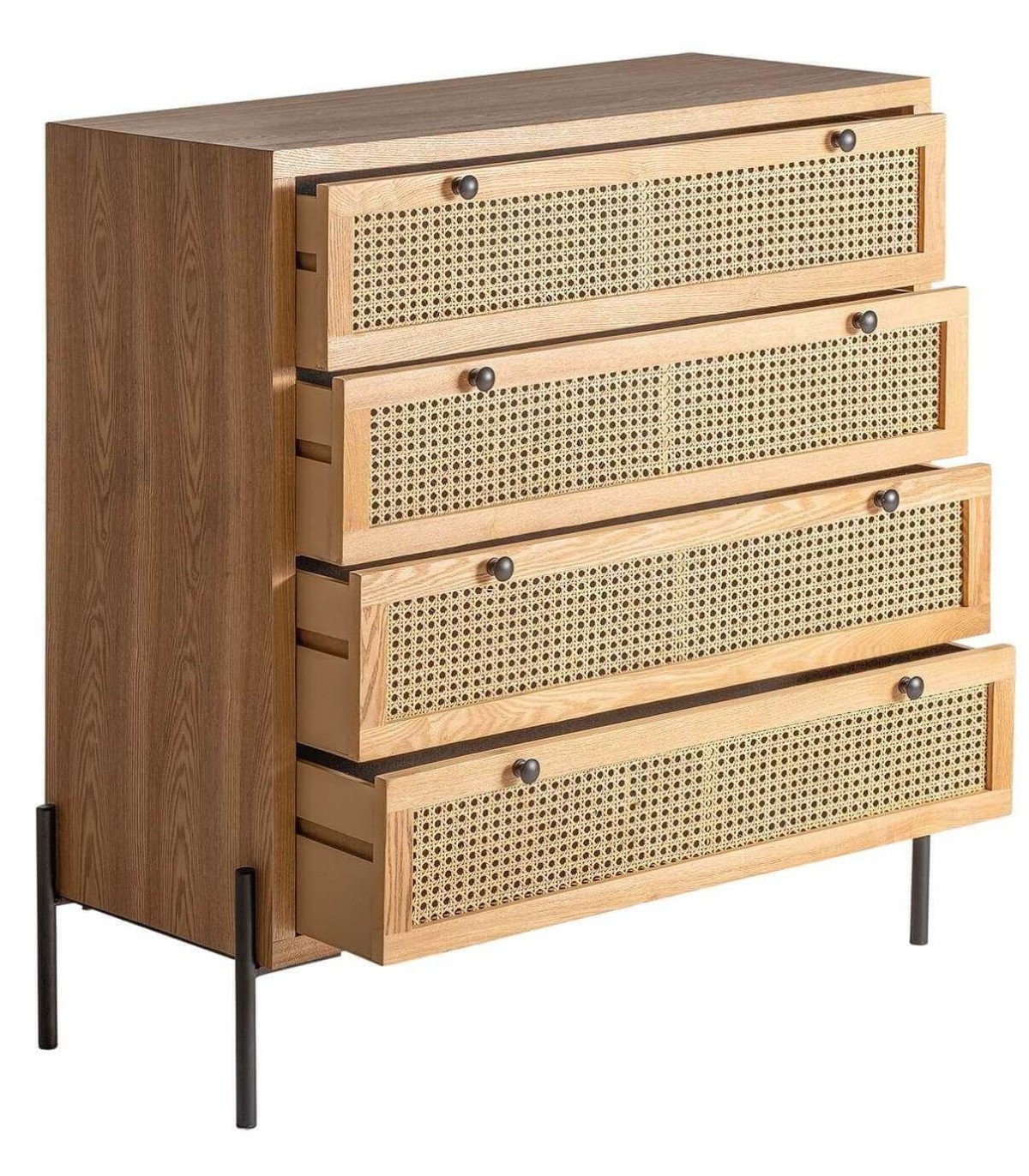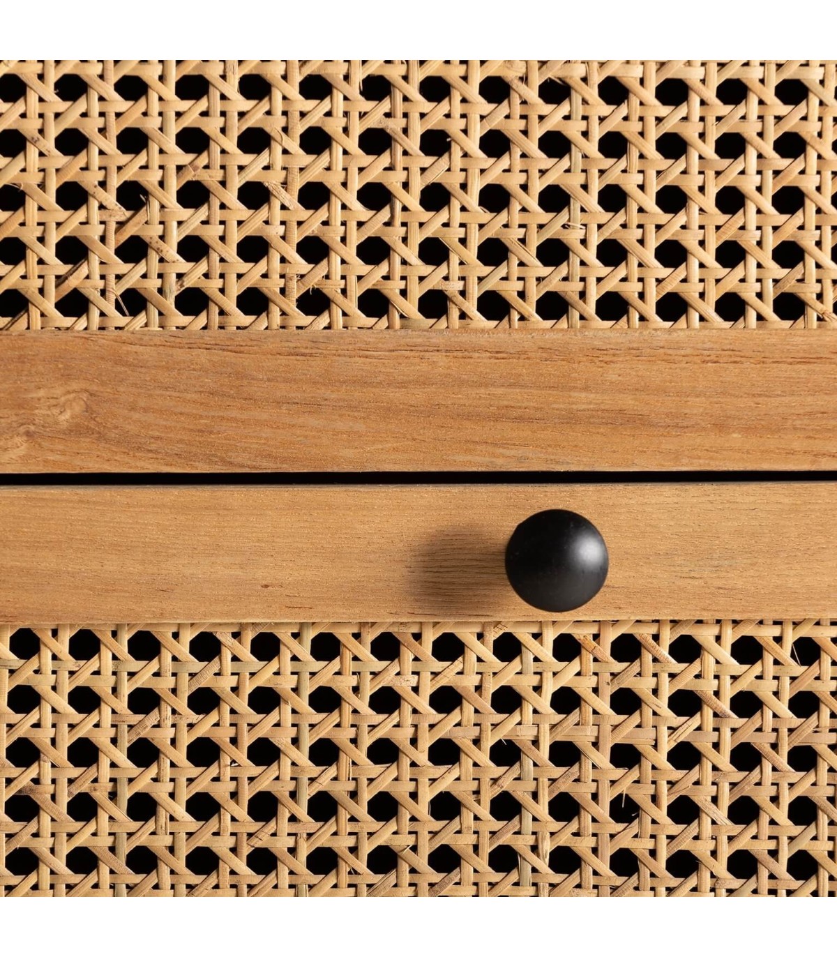 Cómoda de nuestra colección Tezel, una colección que se caracteriza por sus frentes en ratán y sus patas en color negro, una colección de muebles a caballo entre el estilo colonial y el industrial que aporta muchas posibilidades a la hora de combinarlos.