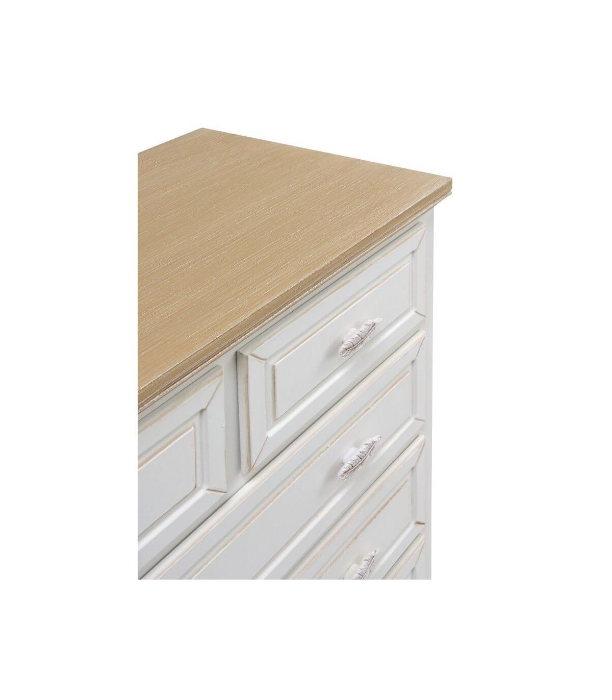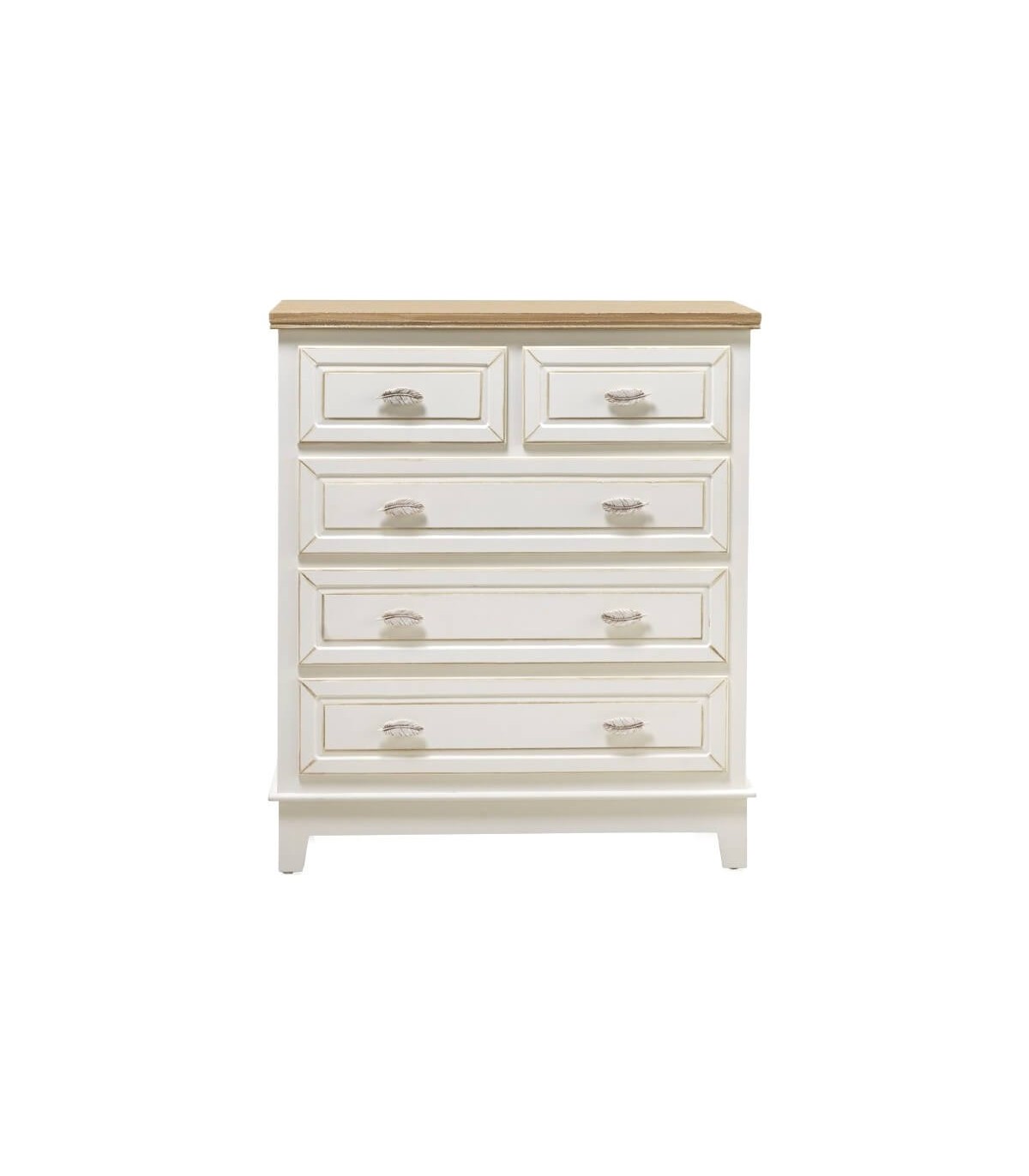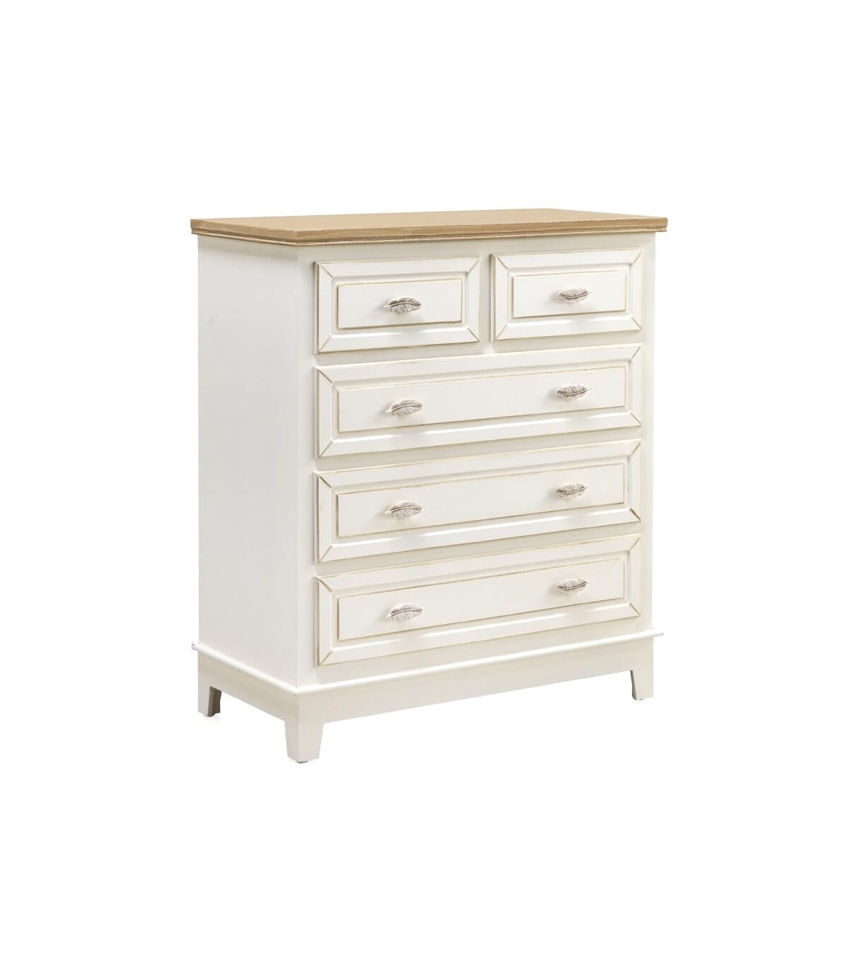 • Cómoda con 5 cajones, realizada en madera natural y blanco patinado en color marrón, con el tirador en forma de hoja, una cómoda de buena capacidad de estilo romántico que viste mucho.