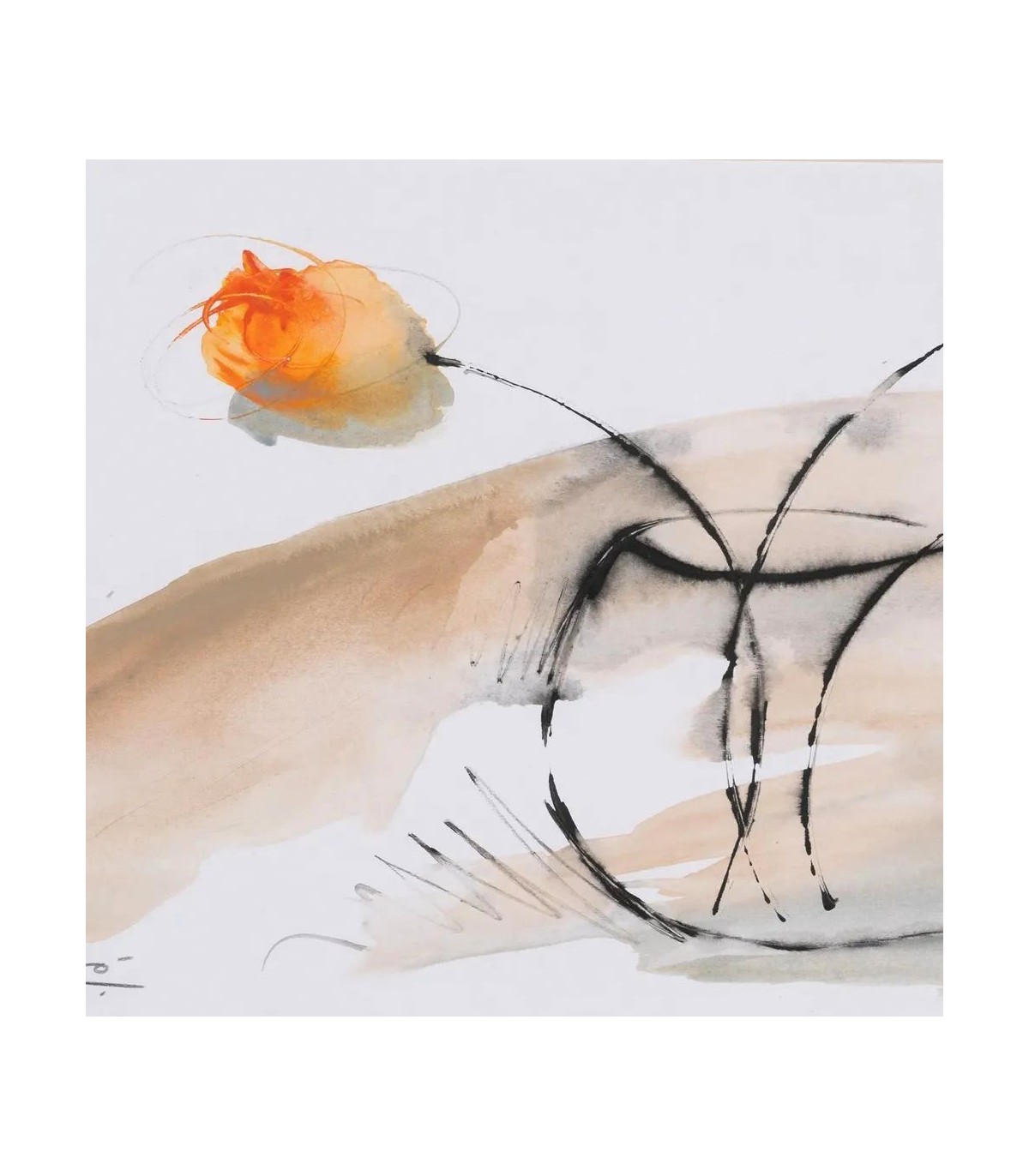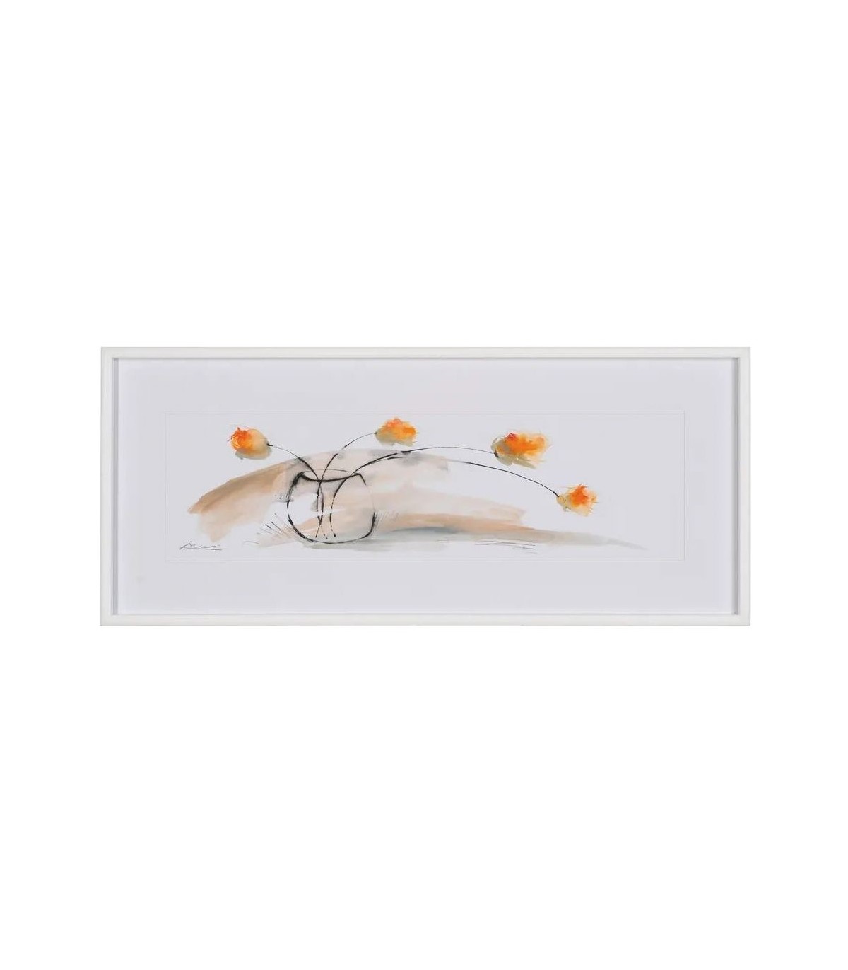 Cuadro acuarela enmarcada con motivo de flores con tonos naranjas, Un cuadro apaisado perfecto para encima de cabeceros y muebles de tamaño medio.
