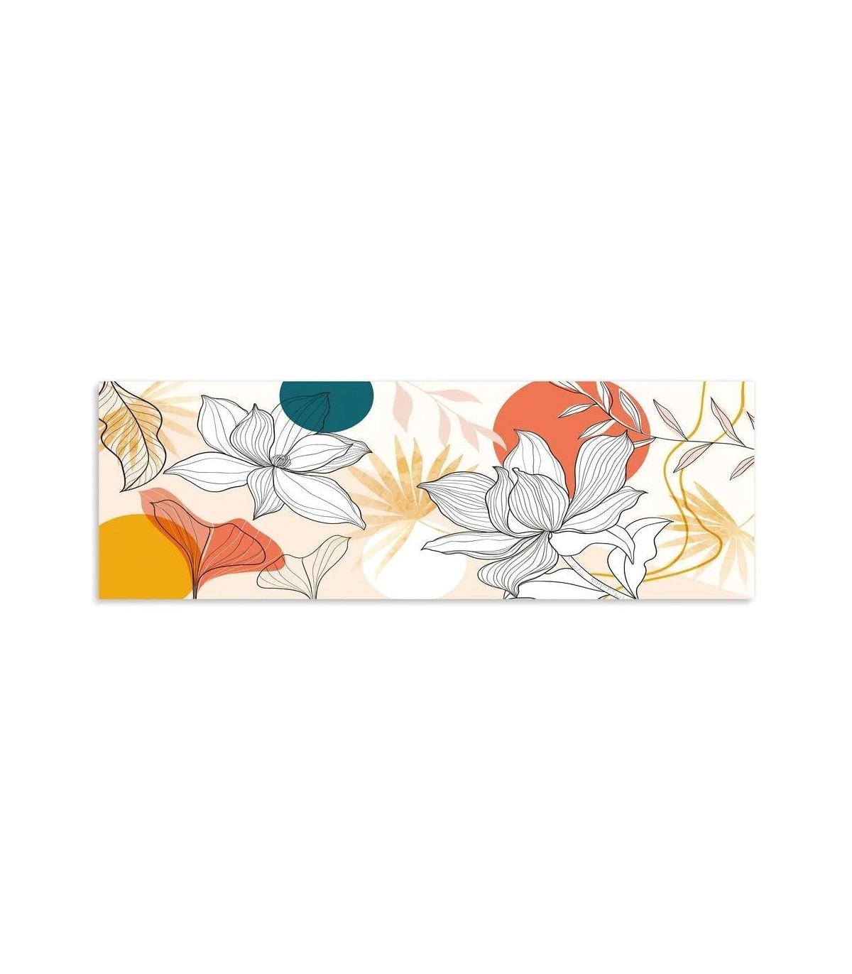 Bonito cuadro horizontal realizado por foto impresión con motivo floral, tonos azules amarillos y naranjas. Perfecto para encima de cabeceros de cama sofás o aparadores.