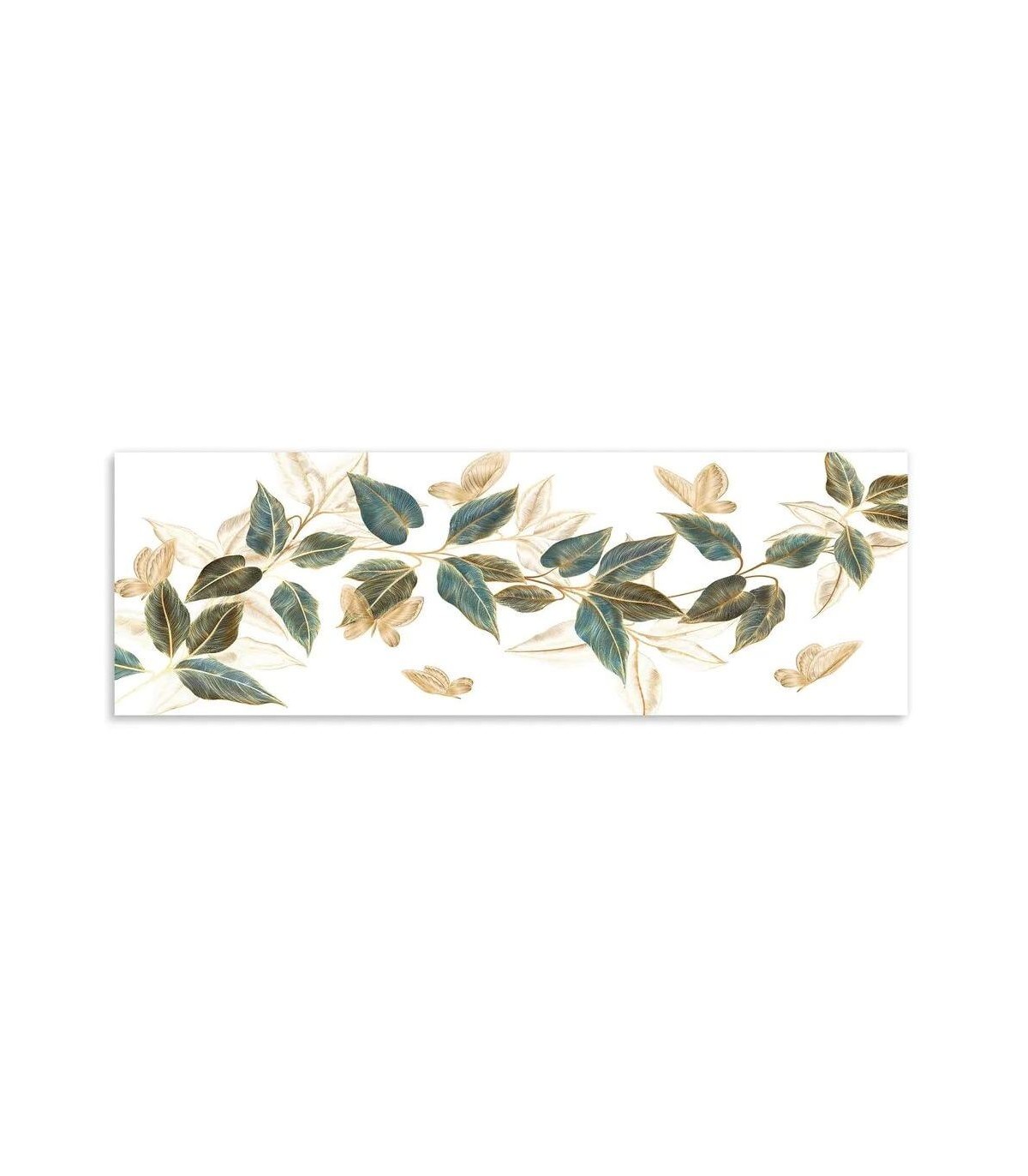 Bonito cuadro horizontal realizado por foto impresión con motivo de hojas y mariposas en verde y dorado. Perfecto para encima de cabeceros de cama sofás o aparadores.
