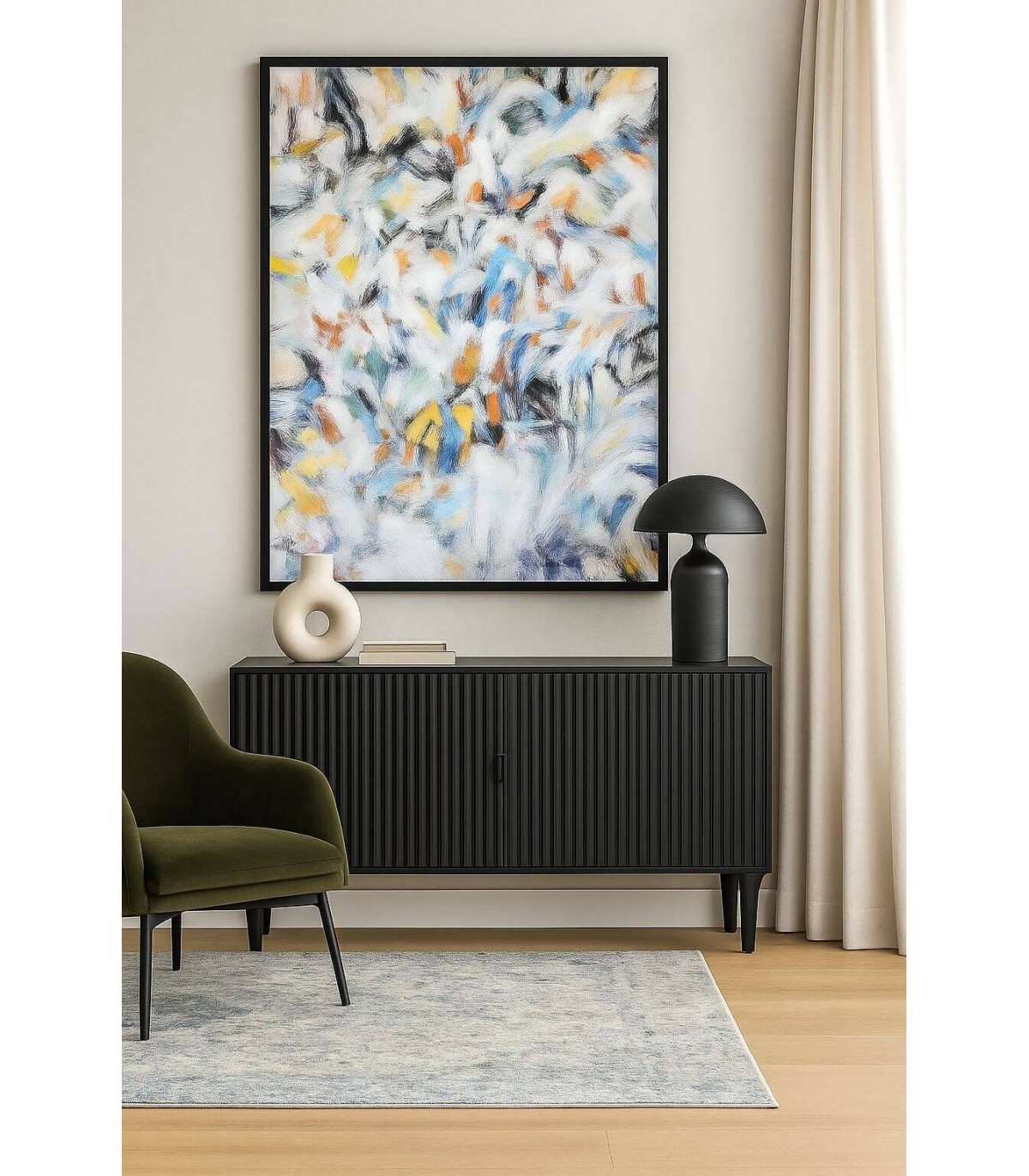 🎨 Acabado: Lienzo abstracto pintado a mano en acrílico multicolor, marco acabado negro. Fabricación artesanal, entendemos las variaciones de tonalidad, tamaño y forma como un valor añadido que la convierten en pieza única.