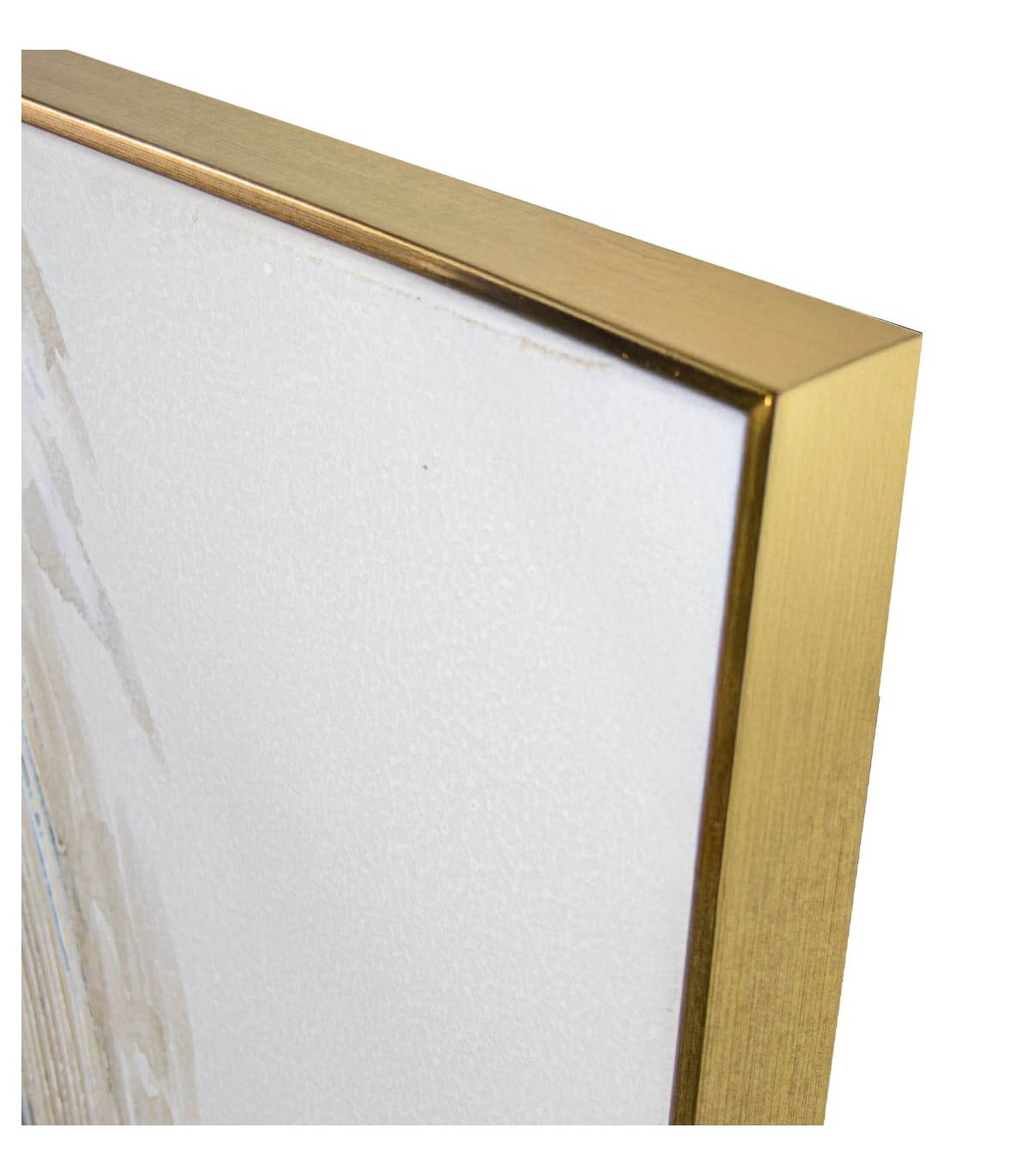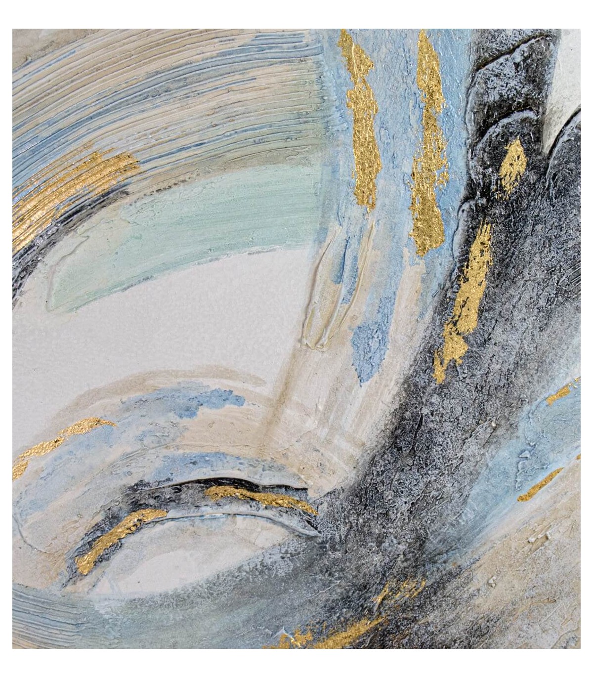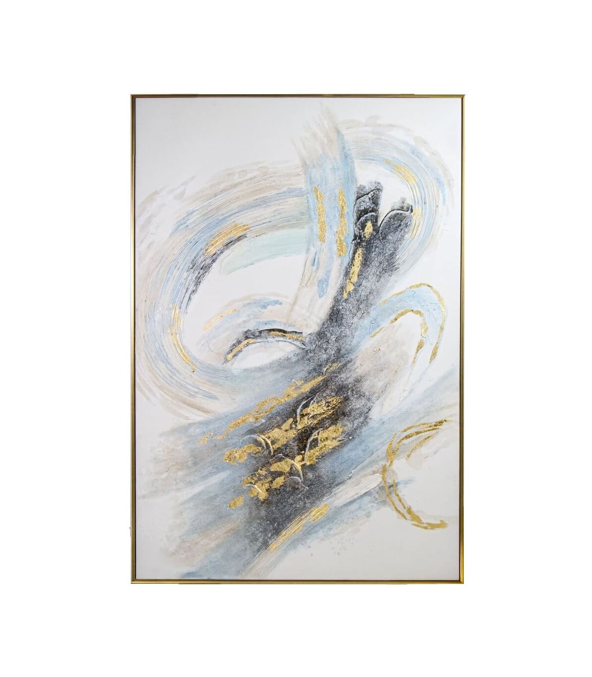 Cuadro abstracto vertical grande pintado a mano sobre lienzo en bastidor de madera, oleo pintura original, tonos neutros con un toque de color azul y dorado, para paredes altas.
