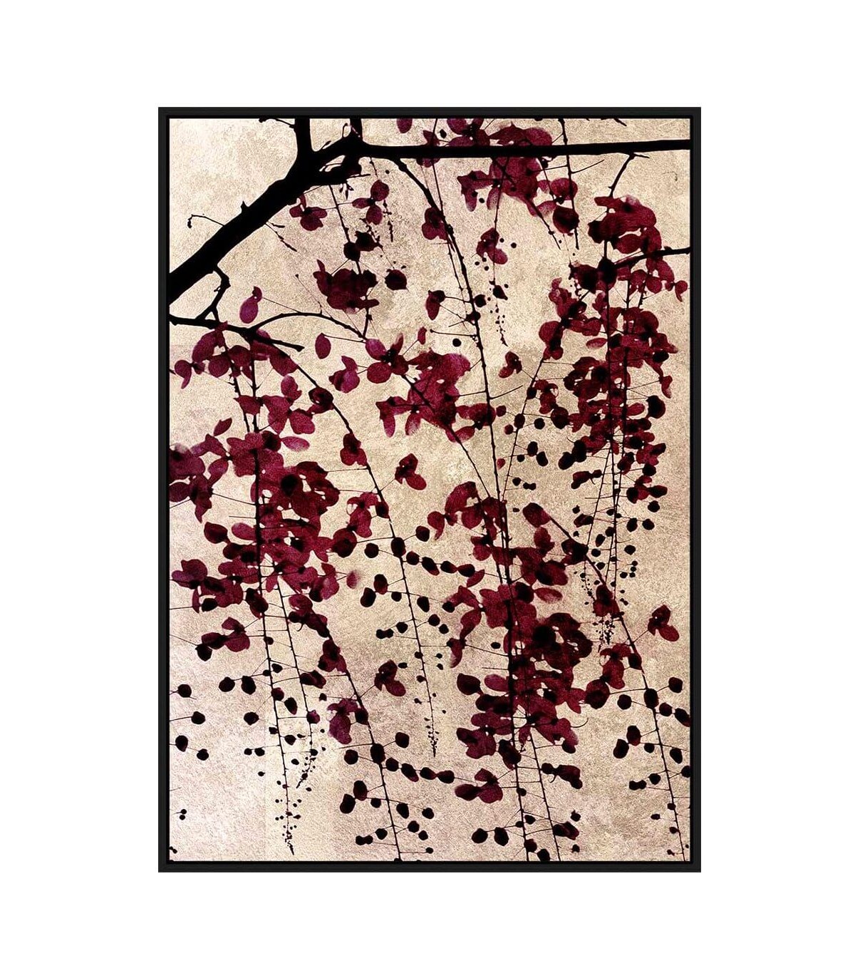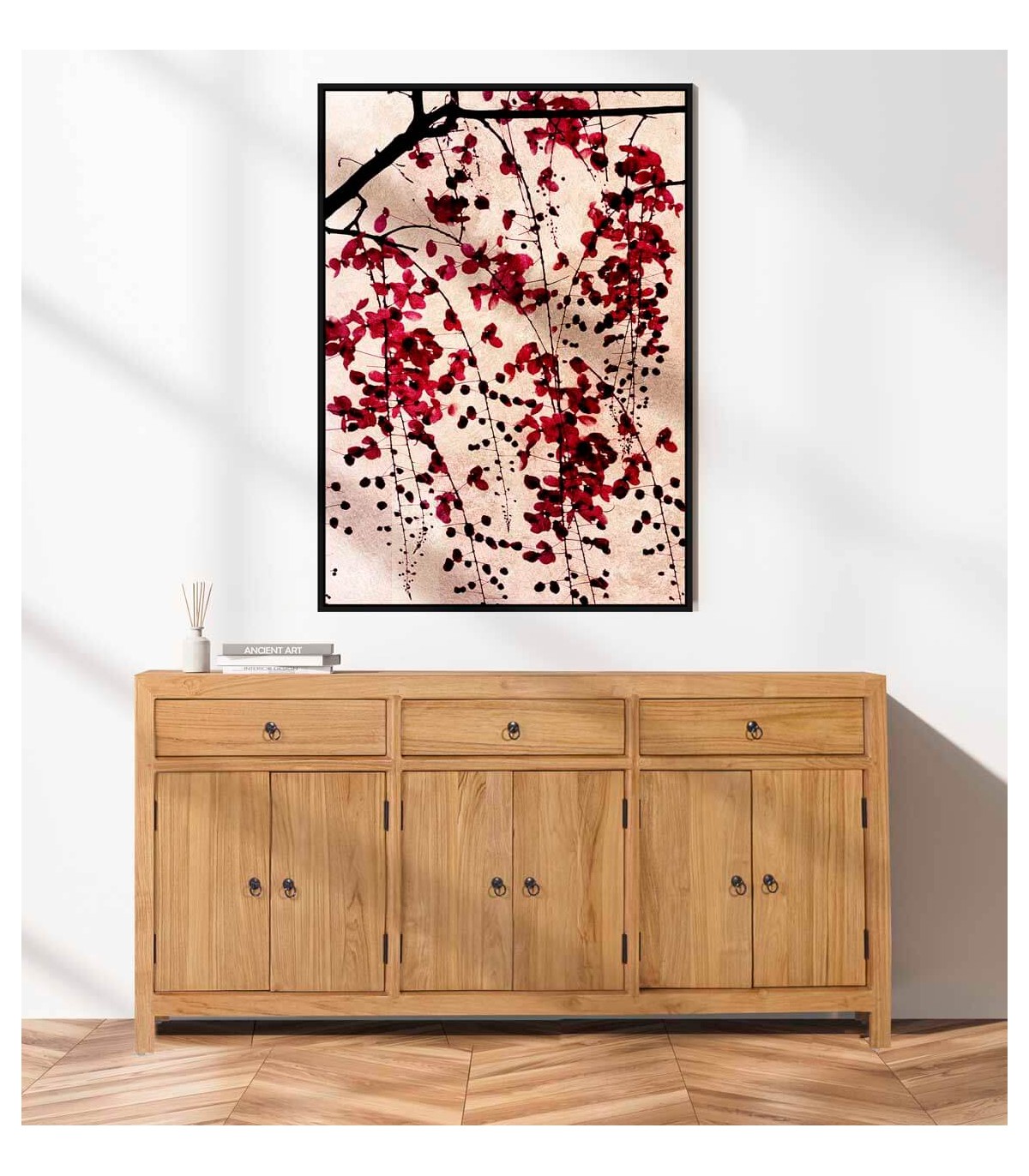 Cuadro figurativo vertical grande pintado a mano sobre lienzo en bastidor de madera, árbol pruno en color rojo, un cuadro muy llamativo, para paredes altas.