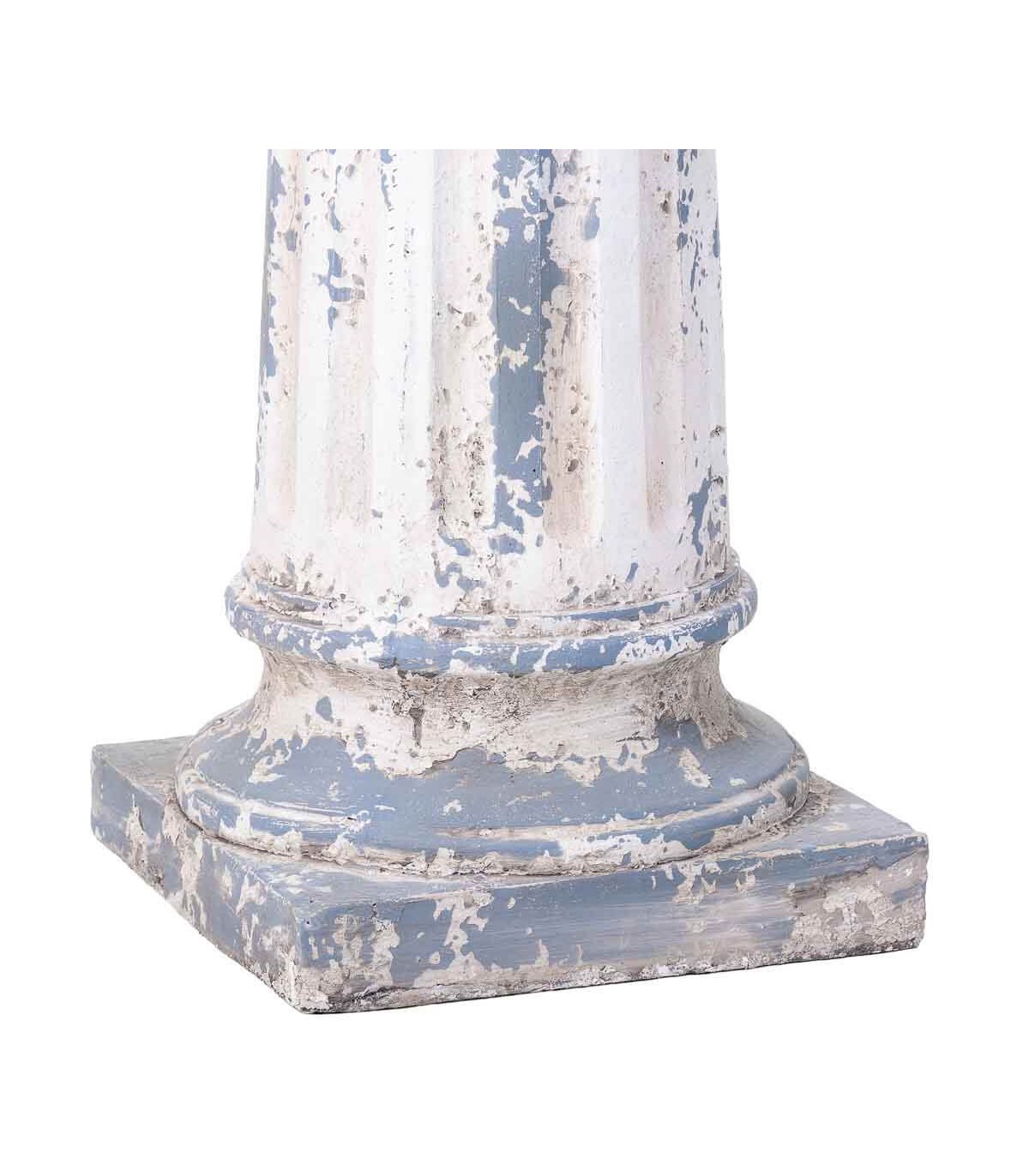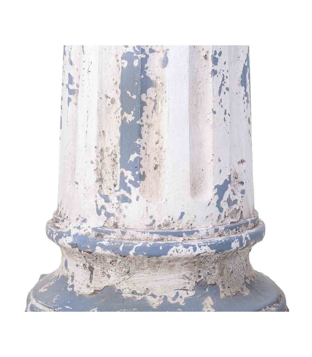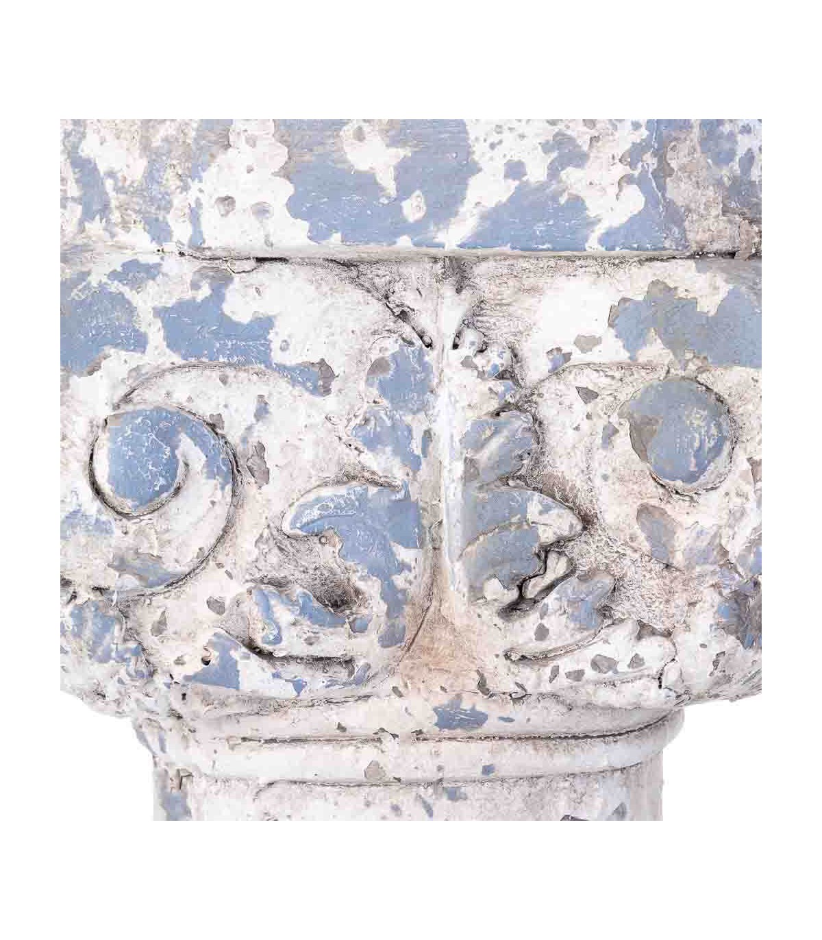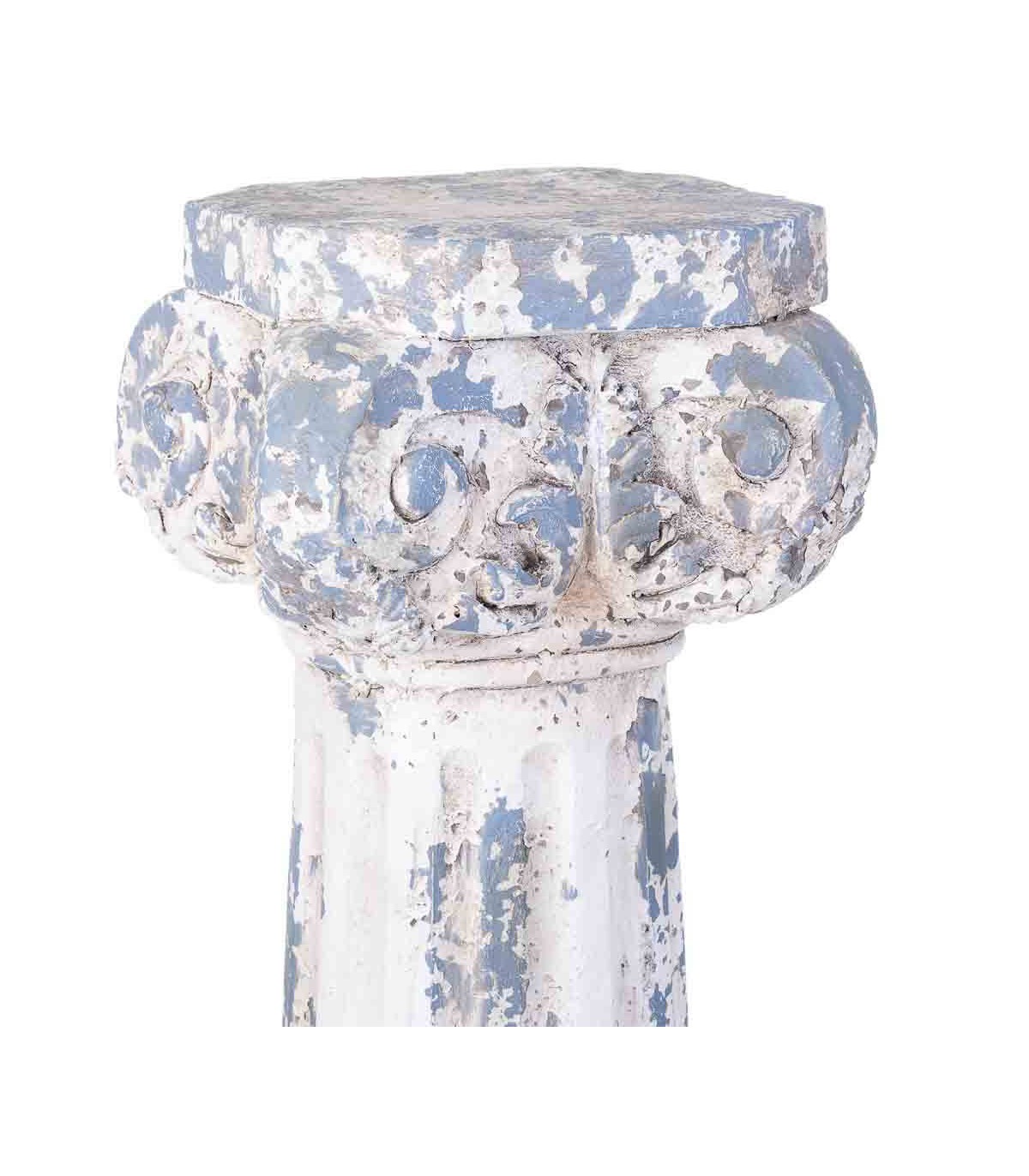 Columna decorativa clásica fabricada en magnesio, con forma estriada y capitel ornamental de inspiración corintia. El acabado blanco decapado con pátina gris azulada reproduce el desgaste natural del tiempo sobre la superficie. Aporta textura, volumen y un aire arquitectónico que destaca por su equilibrio y serenidad.