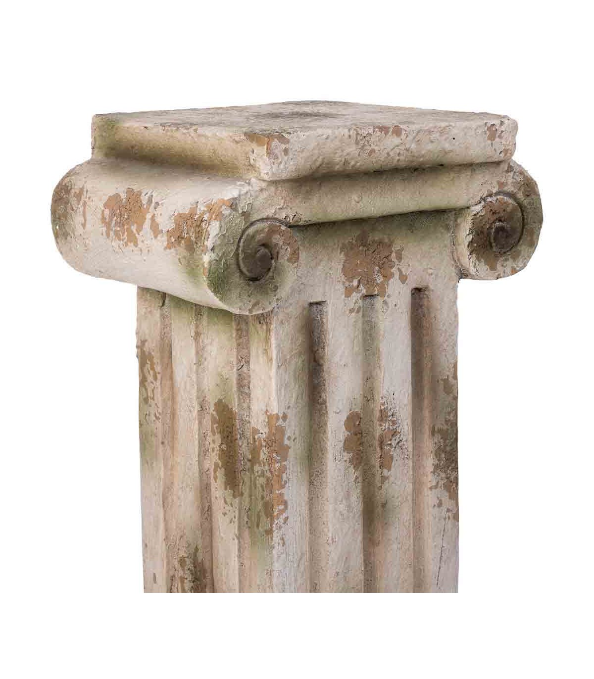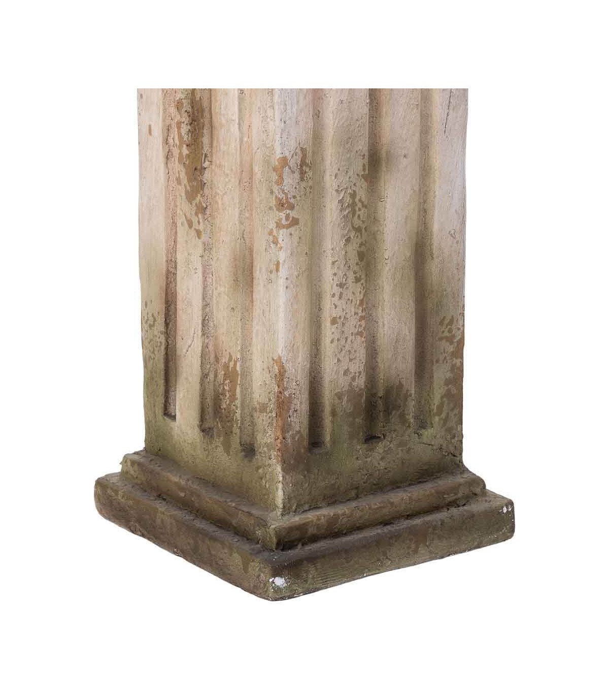 El acabado en piedra envejecida, con matices terrosos y pátinas naturales, recrea con precisión la estética del mármol desgastado por los siglos. Su forma acanalada, el capitel en espiral y la base escalonada evocan la arquitectura griega con un aire romántico, sofisticado y atemporal.