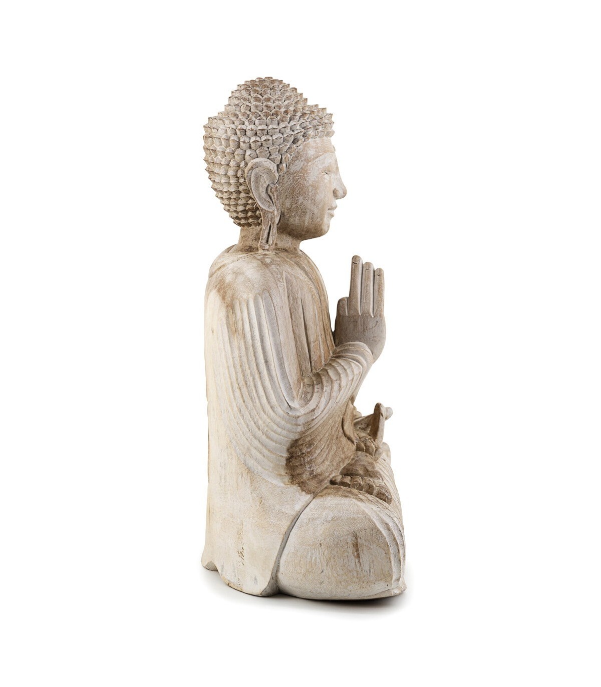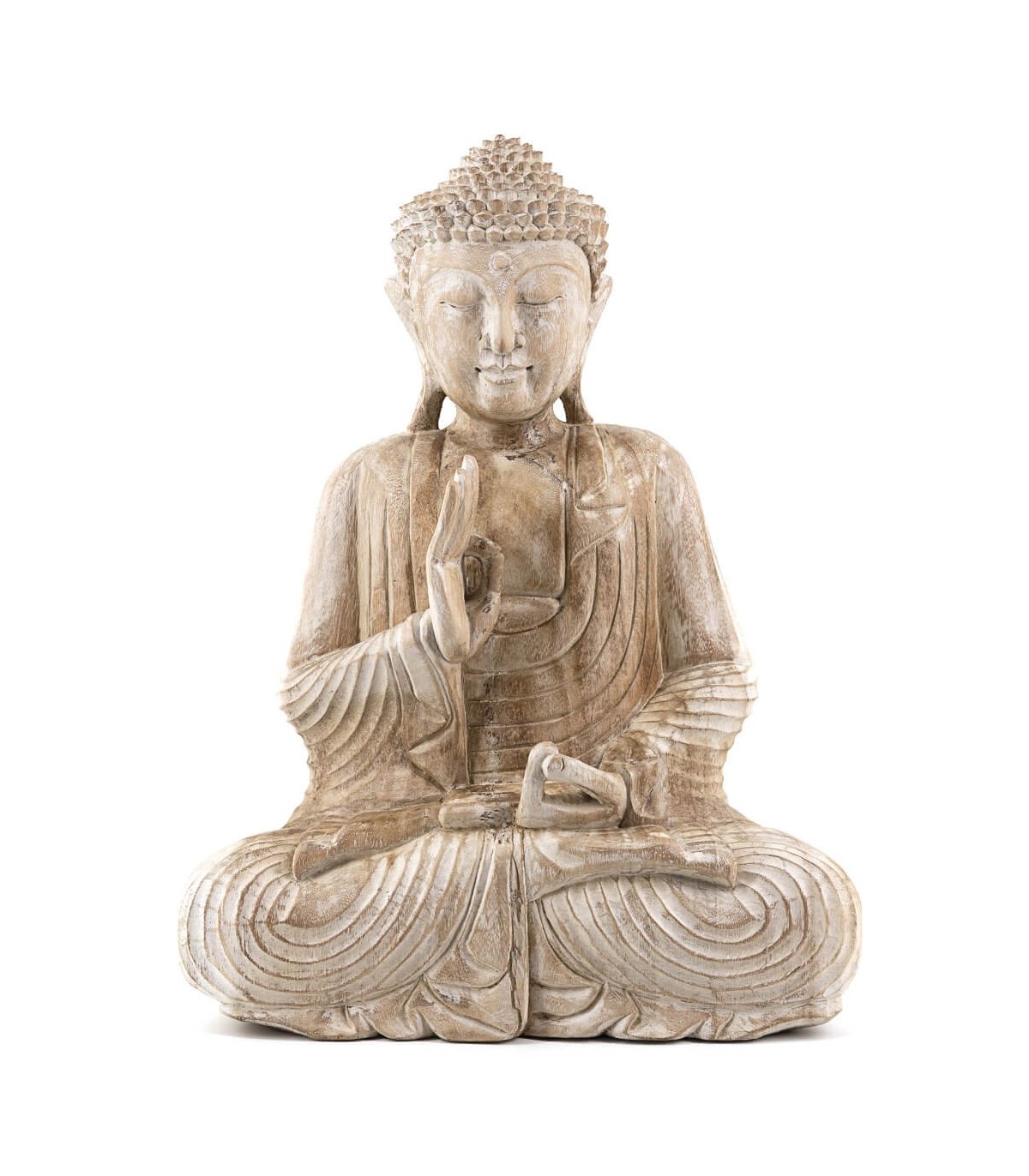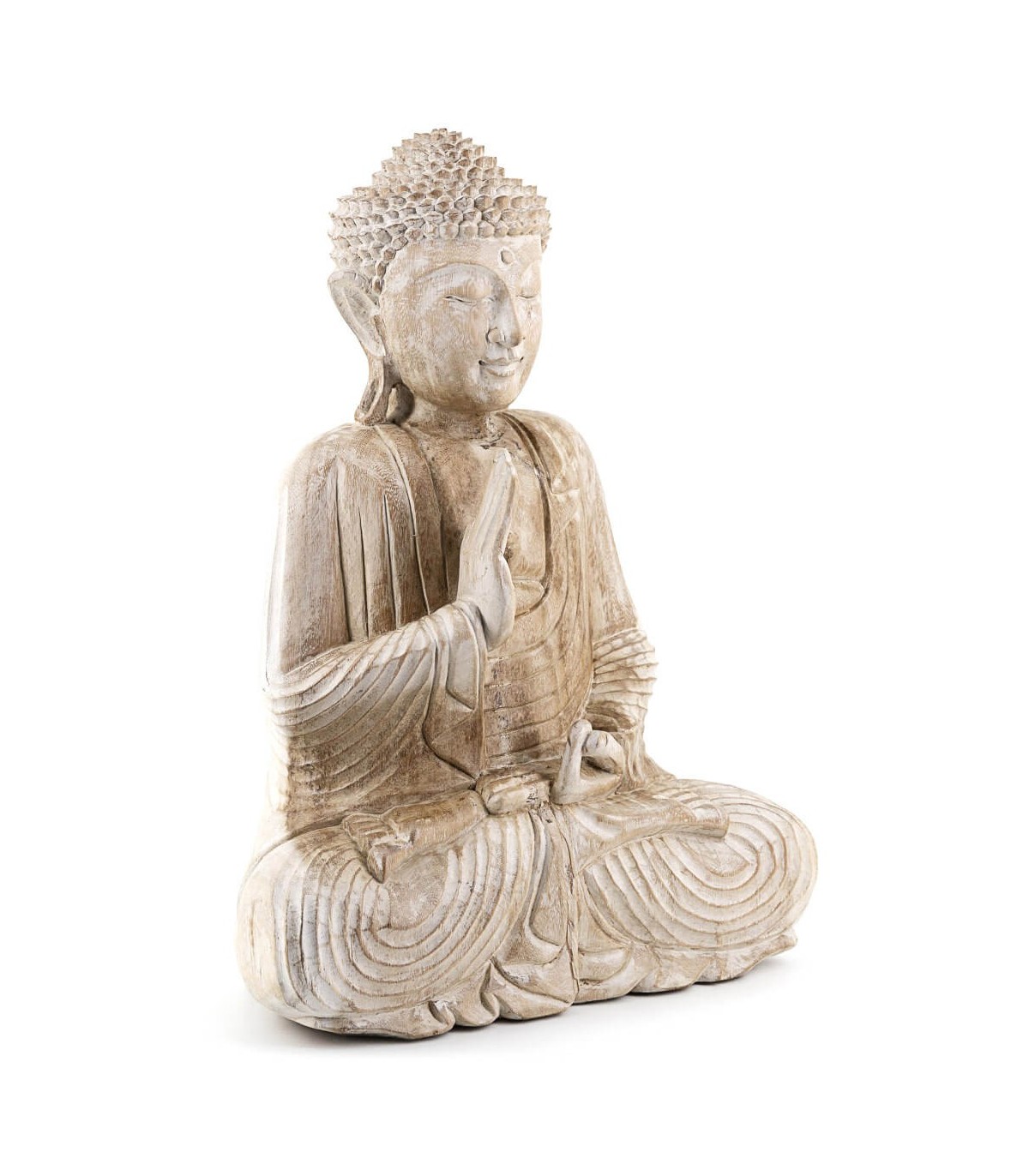 Figura de Buda artesanal, realizada en madera maciza de teca blanqueada y tallada a mano, es una pieza de gran tamaño y presencia, ideal para crear un ambiente sereno, elegante y espiritual en cualquier espacio. Su acabado en madera blanqueada realza los detalles del tallado, aportando luminosidad y sofisticación a la decoración.