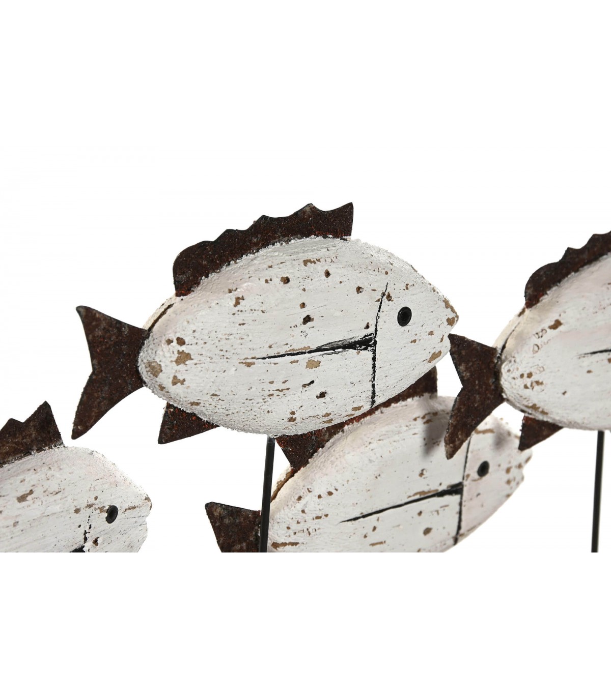 Dale a tu hogar un aire marinero con esta original figura decorativa compuesta por seis peces dispuestos sobre una base de madera natural. Su acabado desgastado en tonos blancos, junto con detalles metálicos en óxido, aportan un carácter rústico encantador que evoca el ambiente relajado y fresco de las costas mediterráneas.