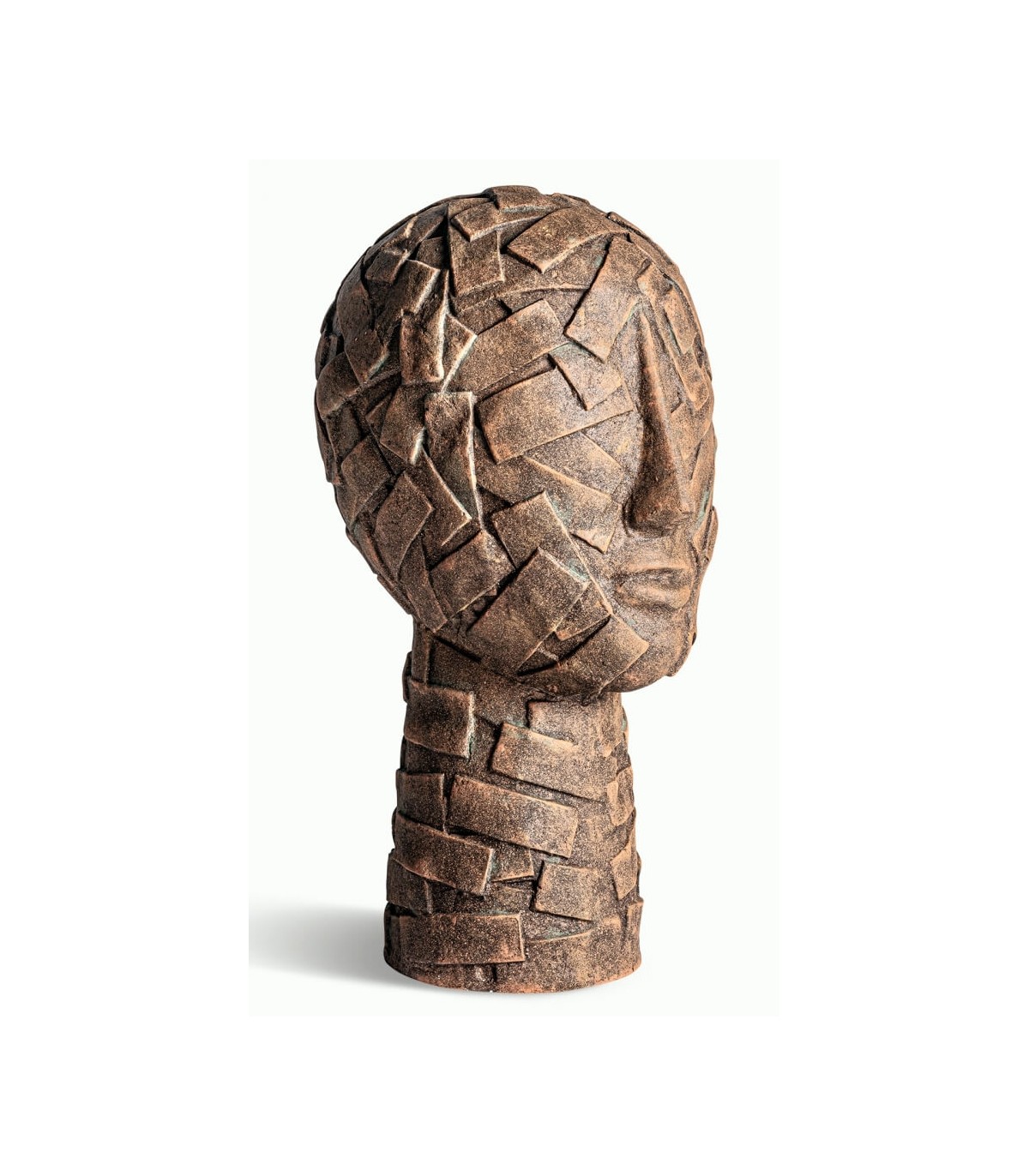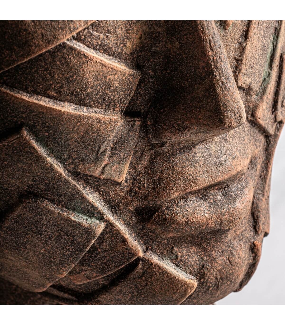 Escultura decorativa única con forma de cabeza geométrica compuesta por planos superpuestos y textura artesanal. Su acabado marrón envejecido imita la piedra, aportando carácter y personalidad a cualquier espacio. Una pieza de gran formato en papel maché, ideal como figura de suelo para interiores modernos o con toques étnicos. Su diseño escultural convierte cualquier rincón en un punto focal lleno de fuerza estética.