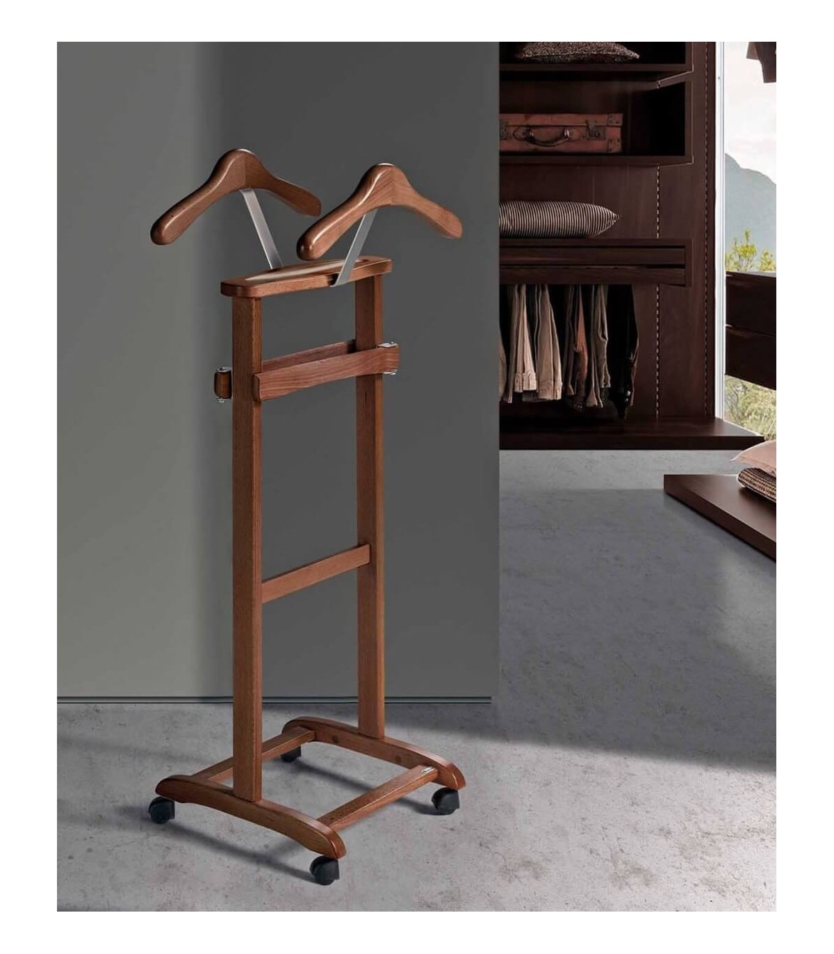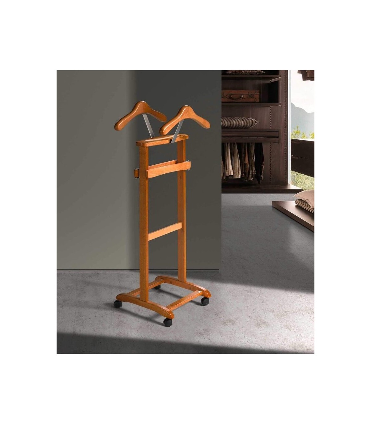 Un galán de noche pensado para dormitorios donde cada detalle cuenta. La estructura robusta en madera maciza de haya transmite elegancia discreta y durabilidad. Cuenta con doble soporte para pantalones, zona para chaquetas y un práctico vaciabolsillos superior, ideal para vaciar los bolsillos al final del día.
