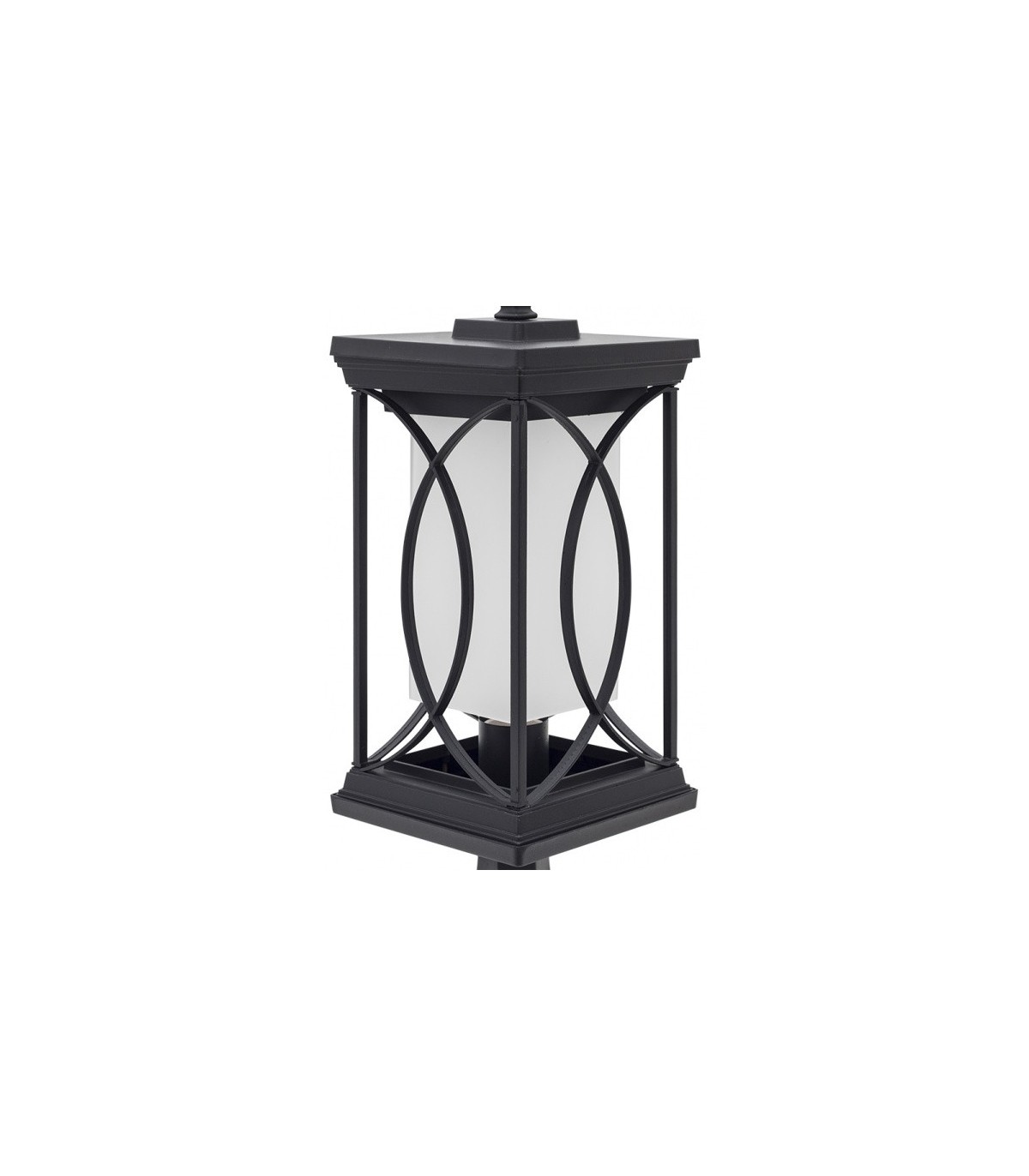 Sobremuro serie Darden de color negro. Presenta un cuerpo de metal con forma cuadrangular que envuelve una pantalla de cristal blanco opaco. Está disponible también en color plata y en dos tamaños.