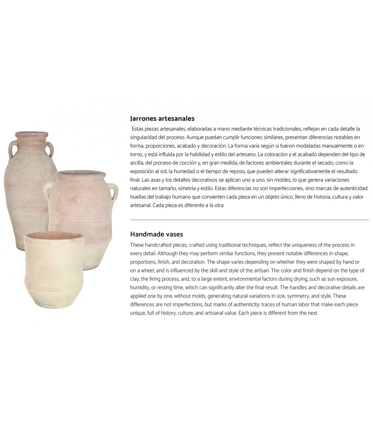 Esta imponente ánfora decorativa destaca por su presencia rústica y su sencillez mediterránea. Hecha en terracota artesanal, su acabado crudo sin esmaltar deja a la vista las imperfecciones naturales del material y el carácter único de la pieza.