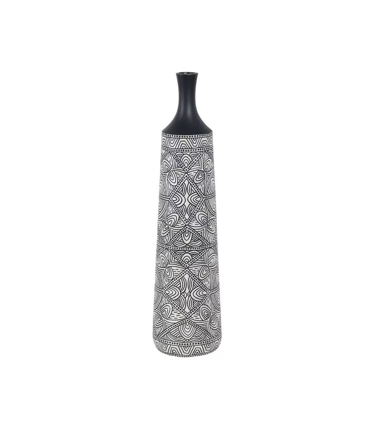 Jarrón de estilo étnico, realizado en poli resina, acabado blanco y negro, un jarrón estilizado y alto, para poner sobre muebles de tamaño medio-grande o en el suelo.