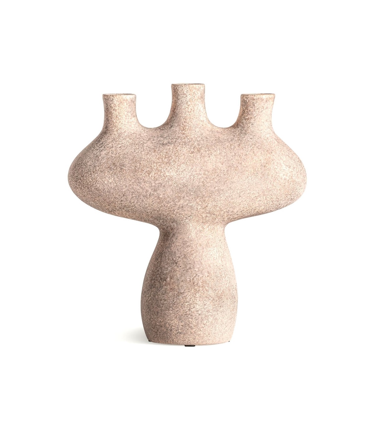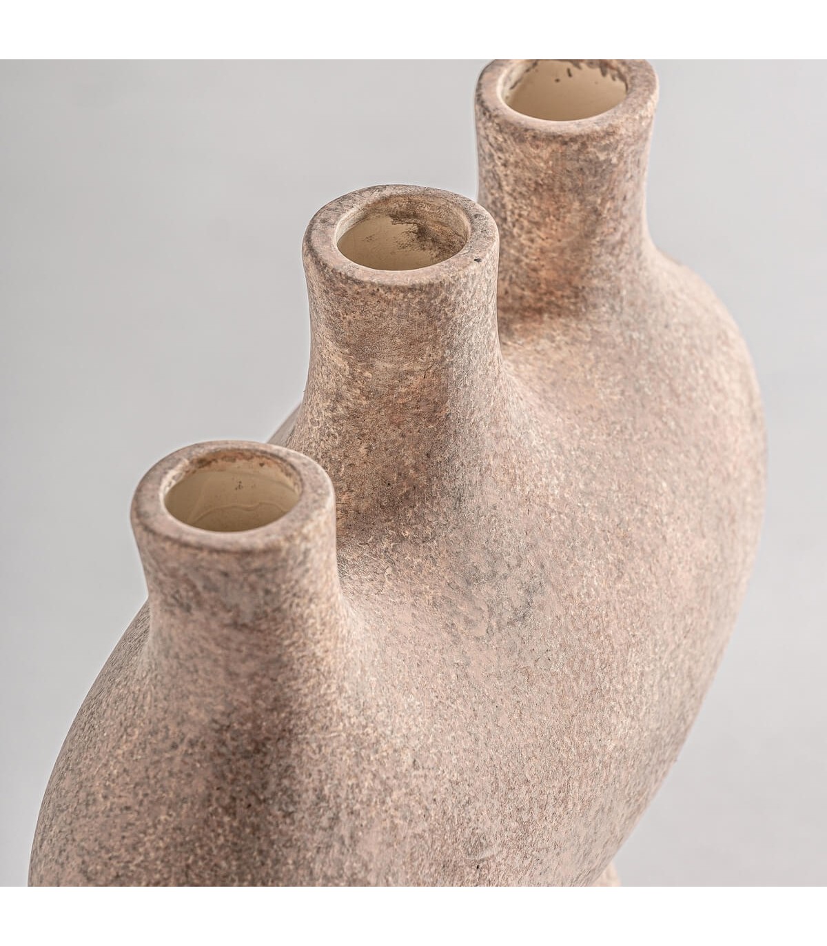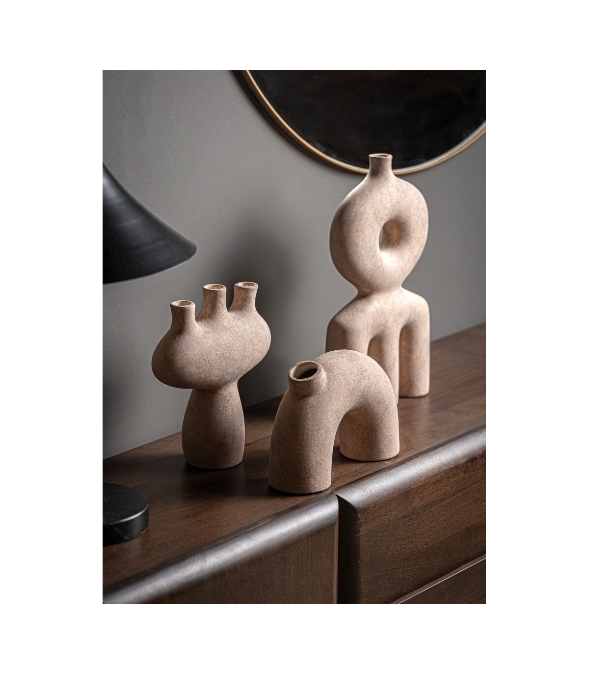 Jarrón de estilo art decó original, con tres bocas, realizado artesanalmente en cerámica de color marrón claro, de formas irregulares, perfecto para muebles de tamaño pequeño, medio o para hacer composiciones en muebles más grandes con sus compañeros.