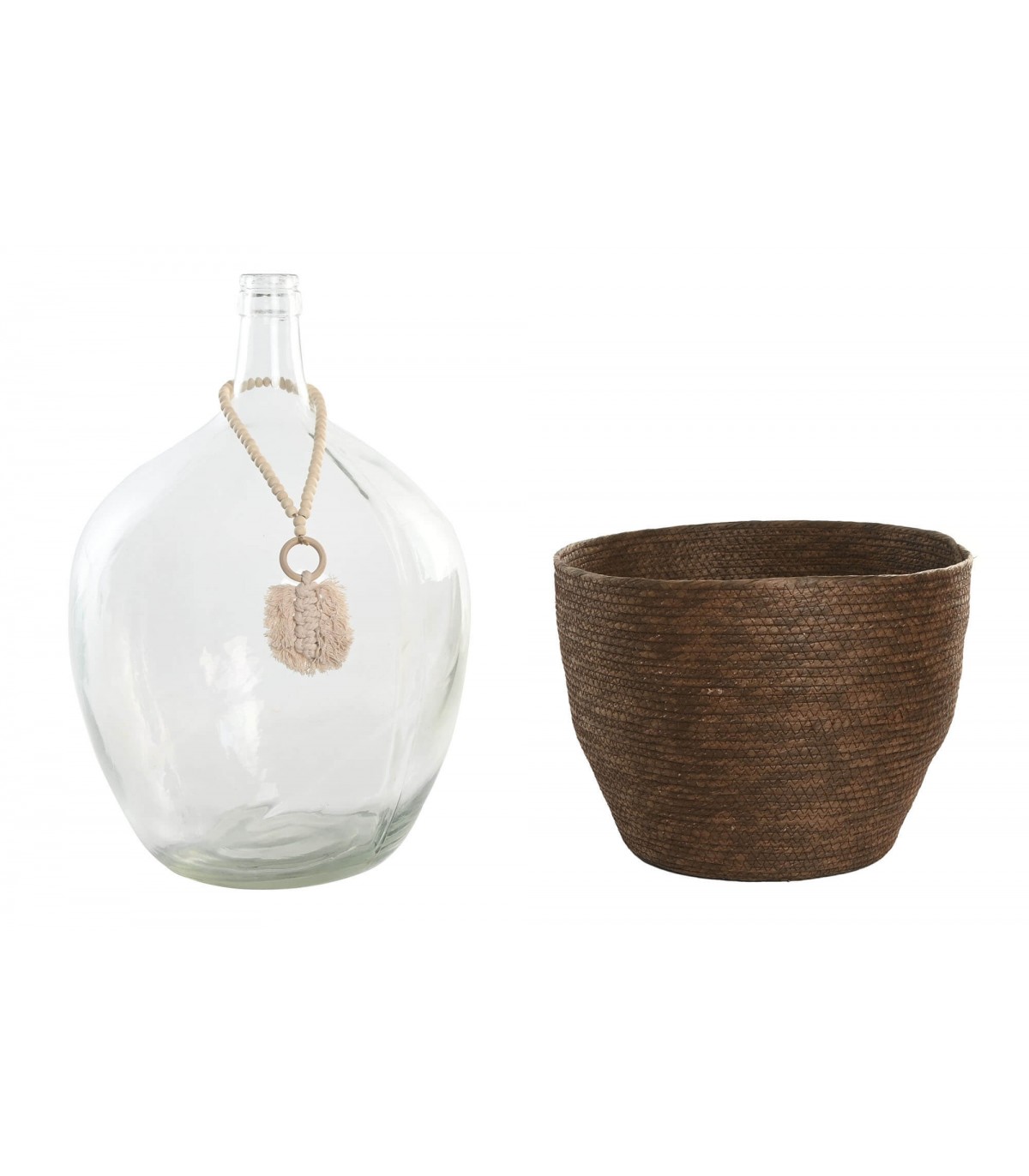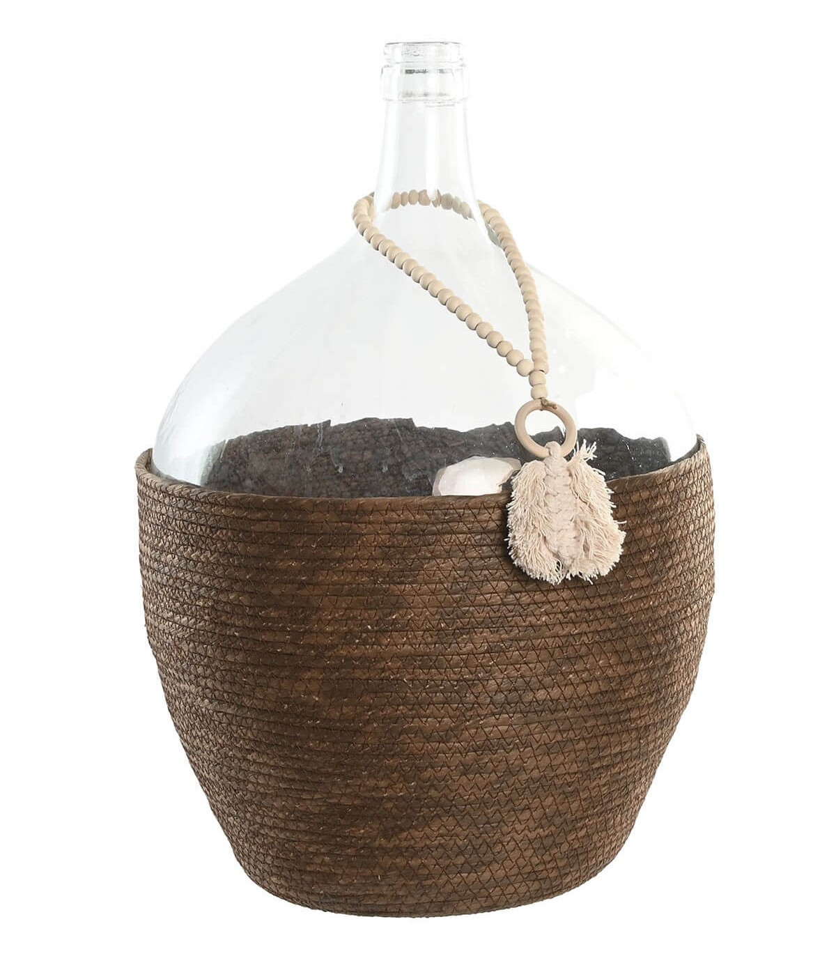 Diseño de líneas suaves que combina cuerpo de cristal orgánico con base trenzada en fibra teñida en tono nogal. Su silueta estilizada y su acabado rústico aportan autenticidad a cualquier rincón. Detalles decorativos como el fleco natural y las cuentas de madera refuerzan su encanto bohemio.