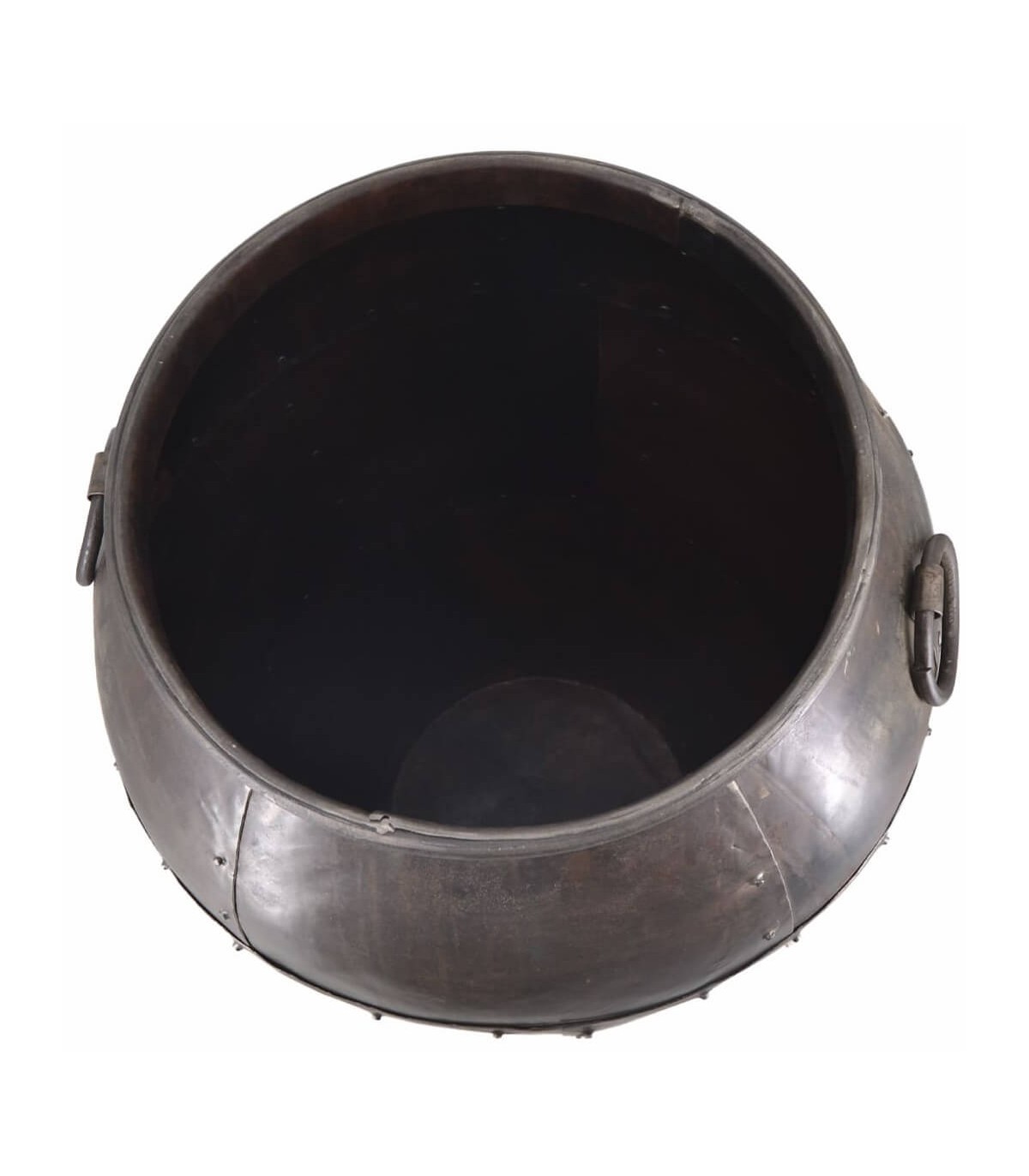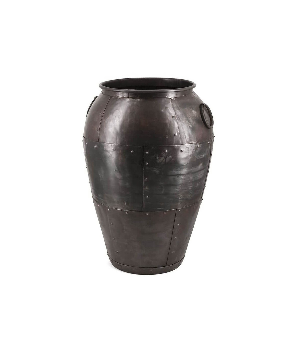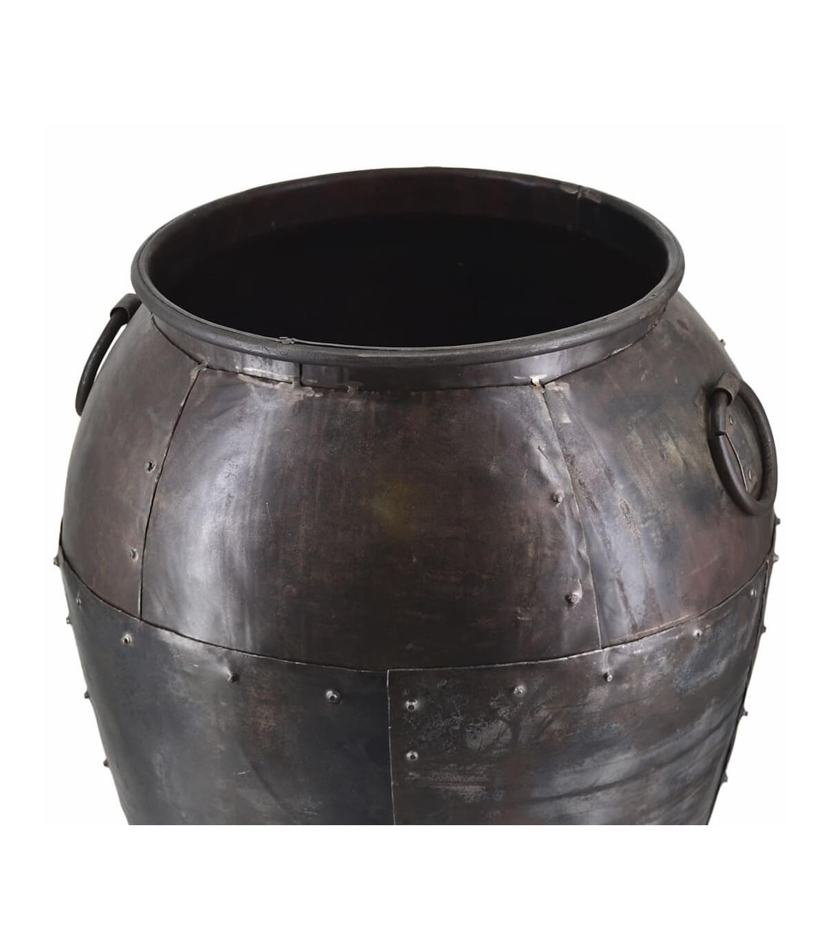 El jarrón de hierro forjado en acabado vintage transmite carácter artesanal y un aire ancestral lleno de autenticidad. Su silueta imponente de curvas generosas convierte cada espacio en un escenario con fuerza decorativa. La superficie metálica, trabajada con efecto desgastado, aporta textura y matices que evocan lo antiguo con naturalidad. Sus asas laterales refuerzan la estética étnica y dan equilibrio al conjunto.