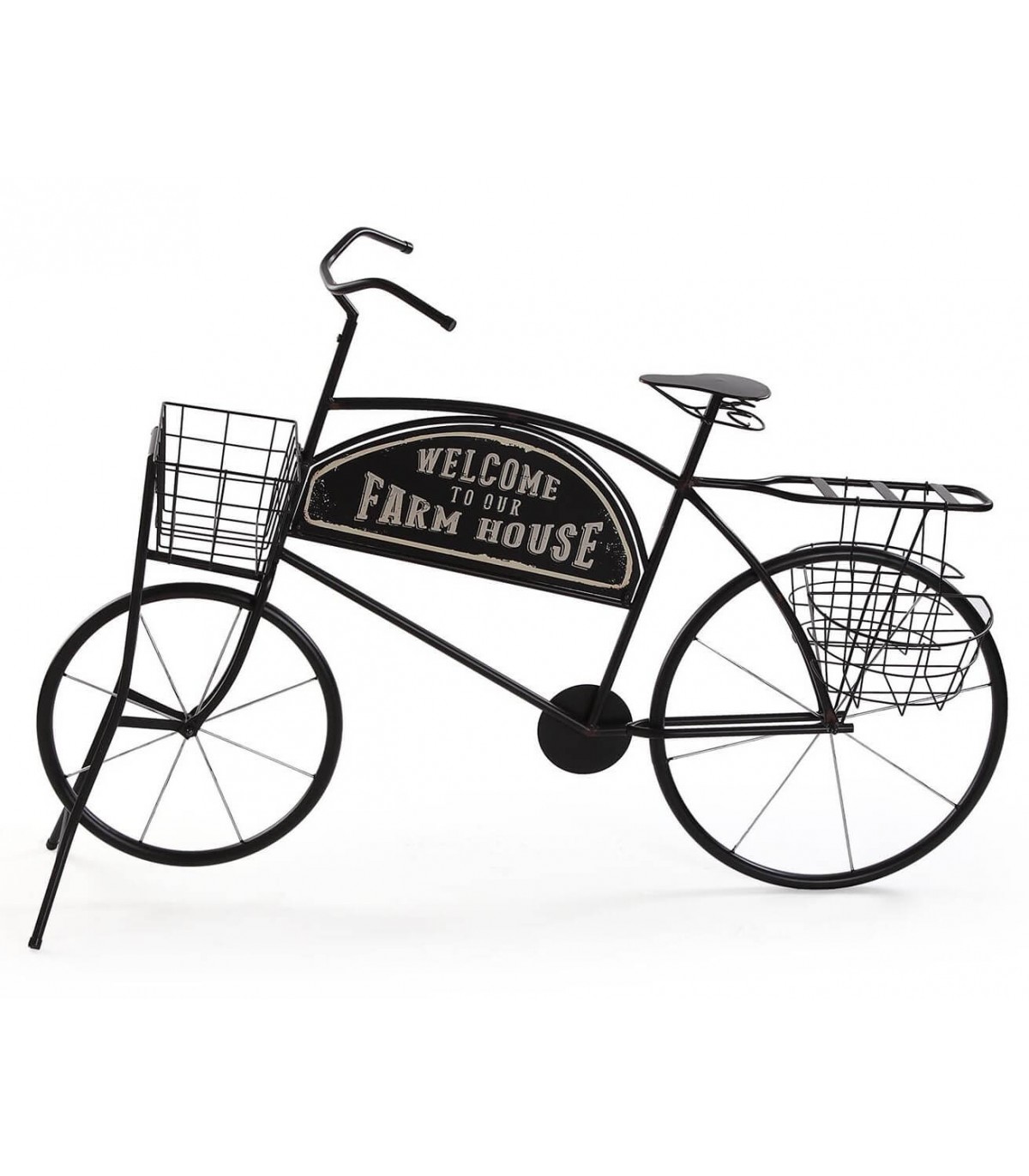 Decora tu entrada o jardín con este original macetero con forma de bicicleta. Hecho de metal con acabado negro, aporta un aire rústico y encantador a cualquier rincón. Incluye tres cestas para plantas y un letrero decorativo con la frase “WELCOME TO OUR FARM HOUSE”.