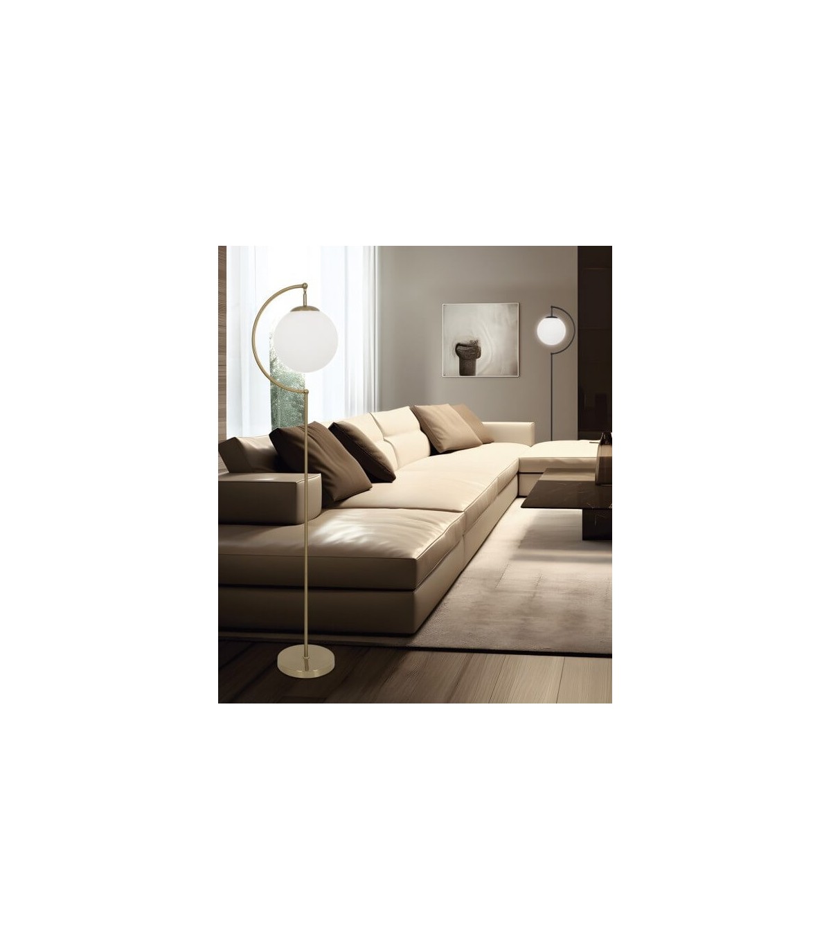 Lámpara de pie realizada en metal color oro y una bola de cristal blanco, de estilo art decó, una lámpara de ambiente ideal.