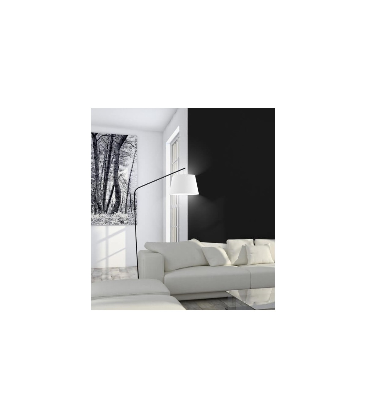 Lámpara de pie realizada en metal negro, pantalla textil blanco, de estilo moderno, inspirada en la lámpara Arco, una lámpara de lectura y ambiente ideal.